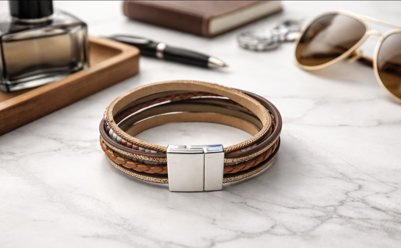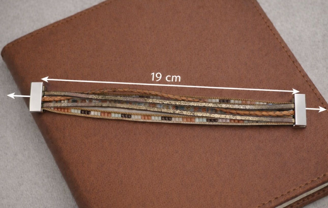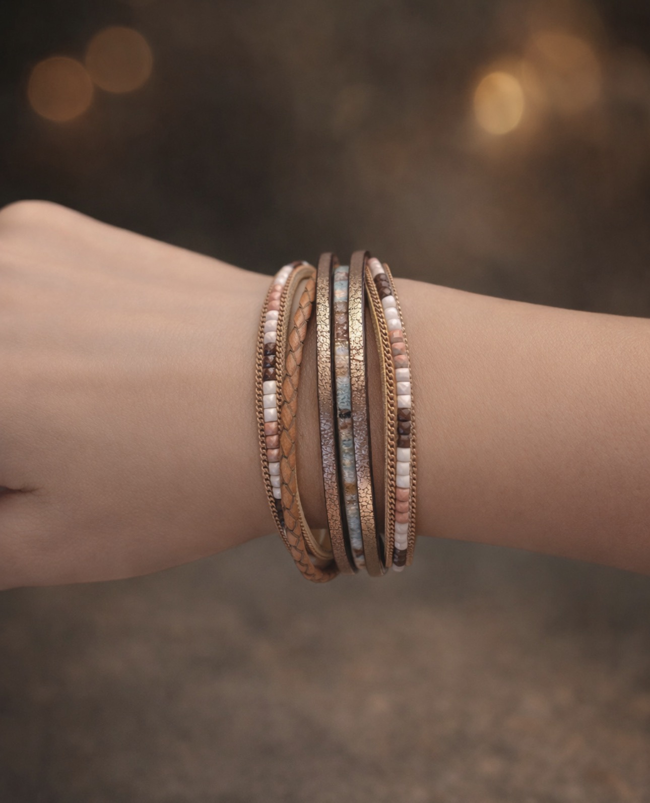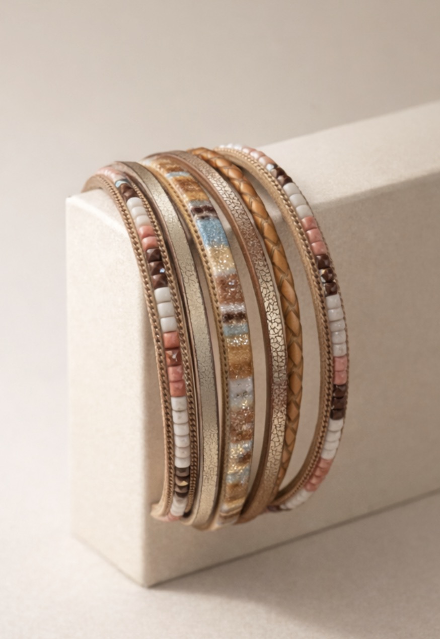Ta bransoletka przyciąga uwagę subtelną grą faktur i ciepłych kolorów. Połączenie gładkich i plecionych pasków w tonacjach beżu, karmelu, jasnego brązu oraz delikatnego, pudrowego różu tworzy wielowymiarową, ale harmonijną kompozycję. Drobne, jasne elementy dekoracyjne wprowadzają lekki kontrast i podkreślają biżuteryjny charakter całości. Wielowarstwowa forma daje efekt kilku bransoletek noszonych jednocześnie, bez wrażenia nadmiaru.