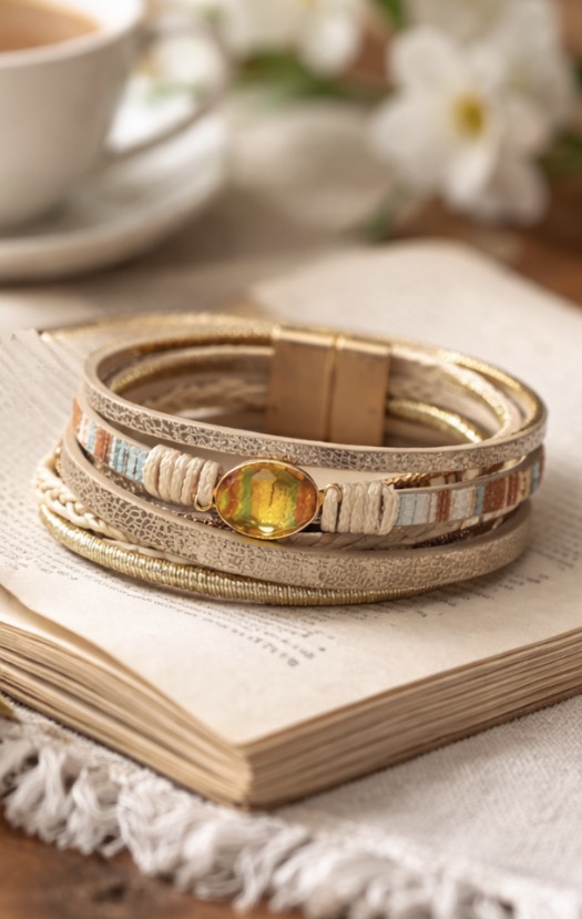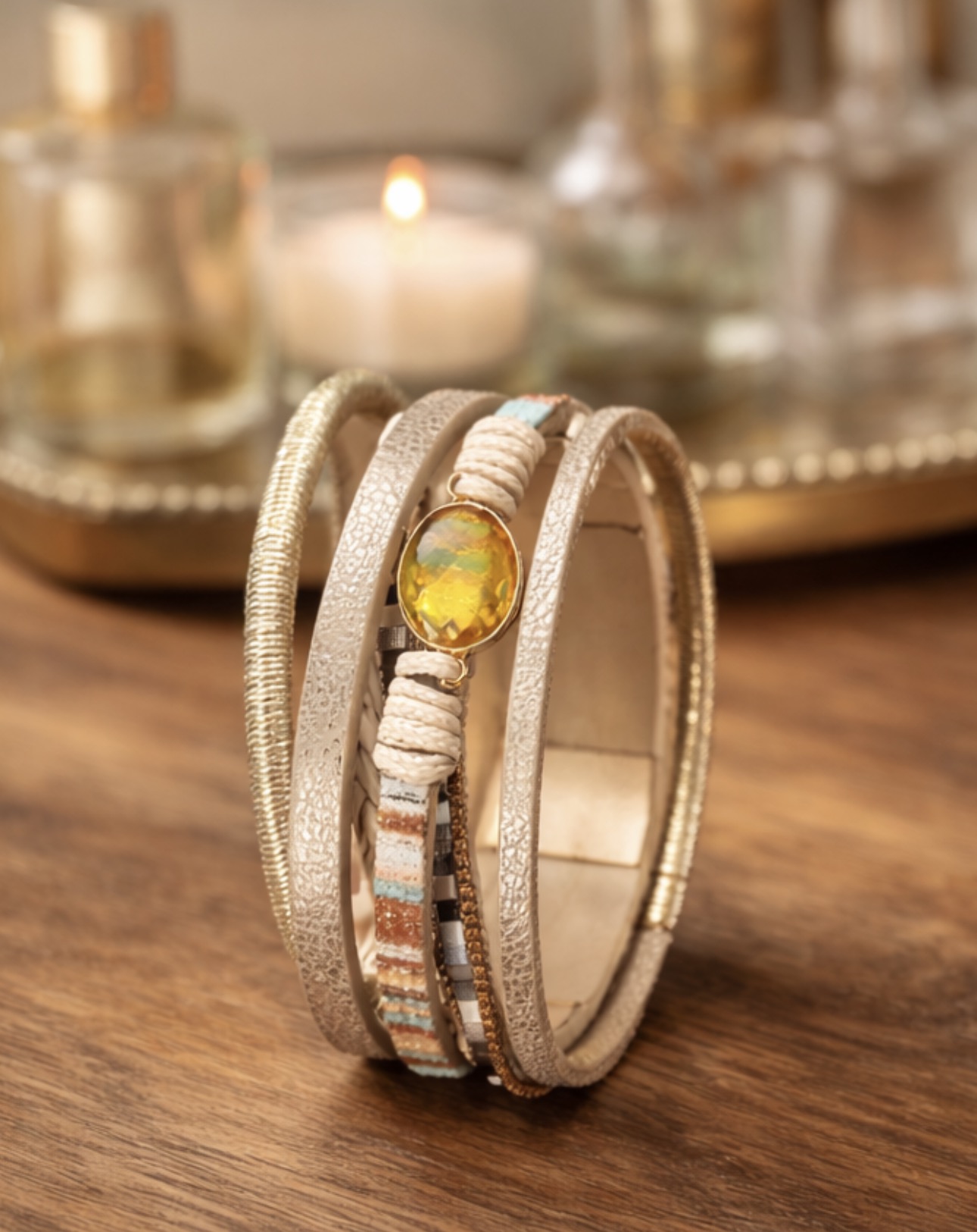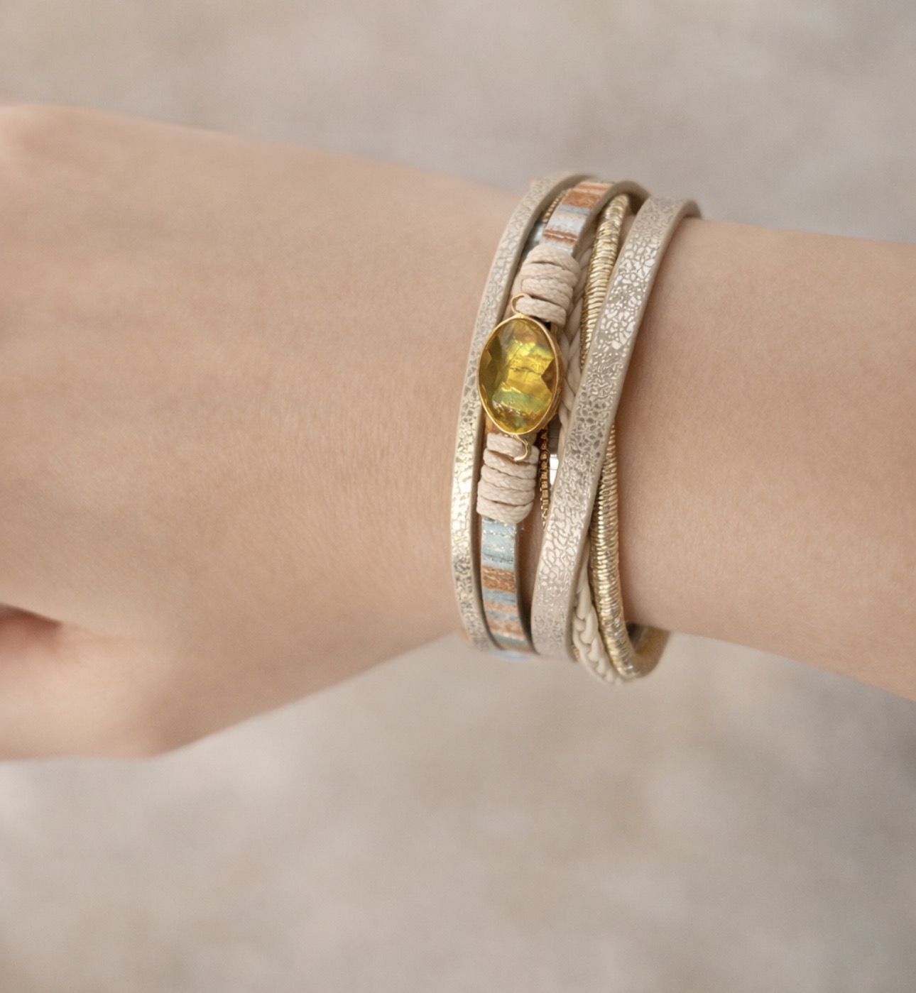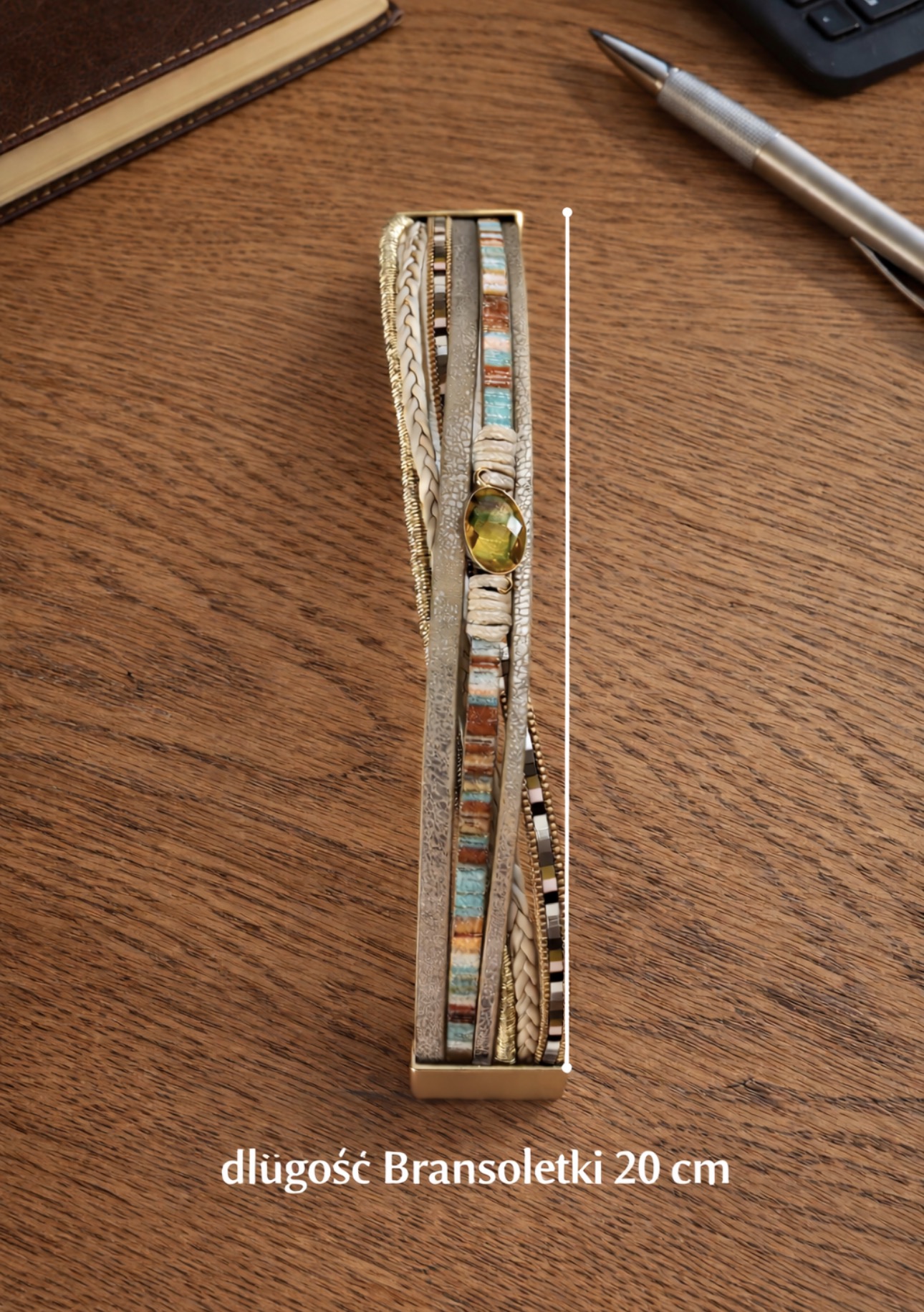 Ta bransoletka to połączenie delikatnych, jasnych pasków w odcieniach beżu i kremu z dekoracyjnym, okrągłym kamieniem w ciepłym, miodowo-złotym kolorze. Subtelne detale w kolorze srebrnym nadają całości lekko biżuteryjnego charakteru, a wielowarstwowa forma sprawia, że wygląda jak kilka bransoletek noszonych razem.
