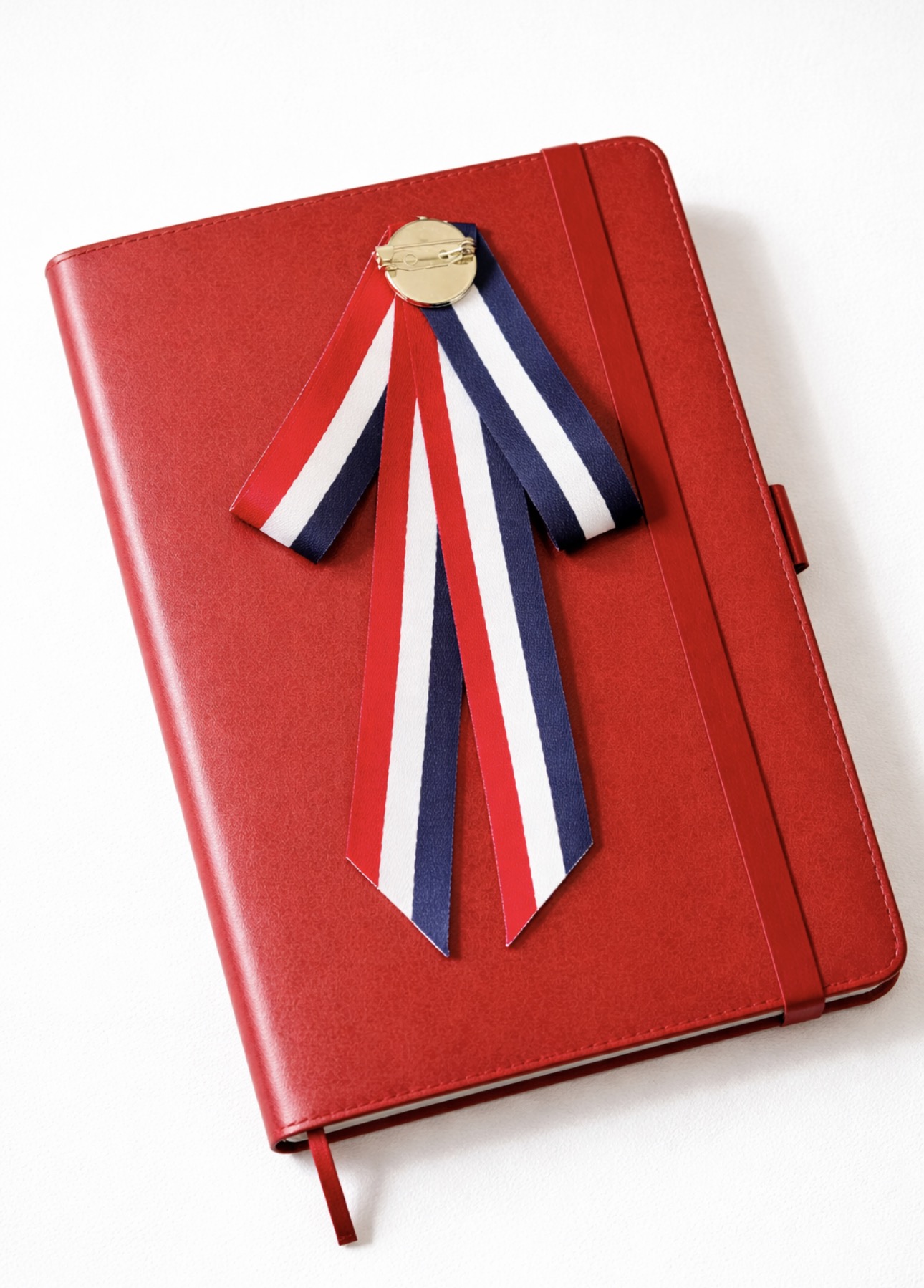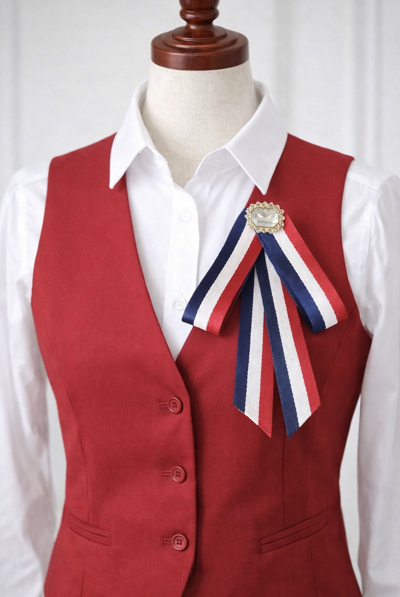 Stylowa broszka w formie kokardy wykonanej z dekoracyjnych wstążek w kontrastowych kolorach. Zestawienie granatu, czerwieni i jasnego akcentu tworzy ponadczasową kompozycję inspirowaną klasyczną elegancją. Centralna ozdoba w formie dekoracyjnego elementu biżuteryjnego nadaje całości szlachetnego charakteru i subtelnego blasku.