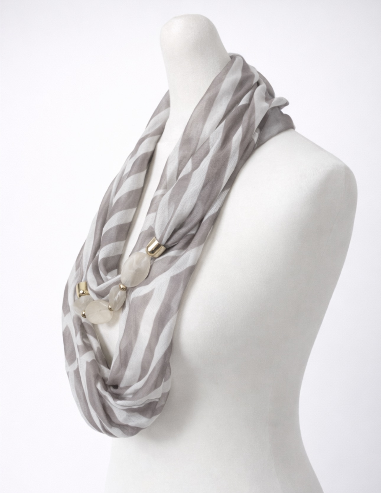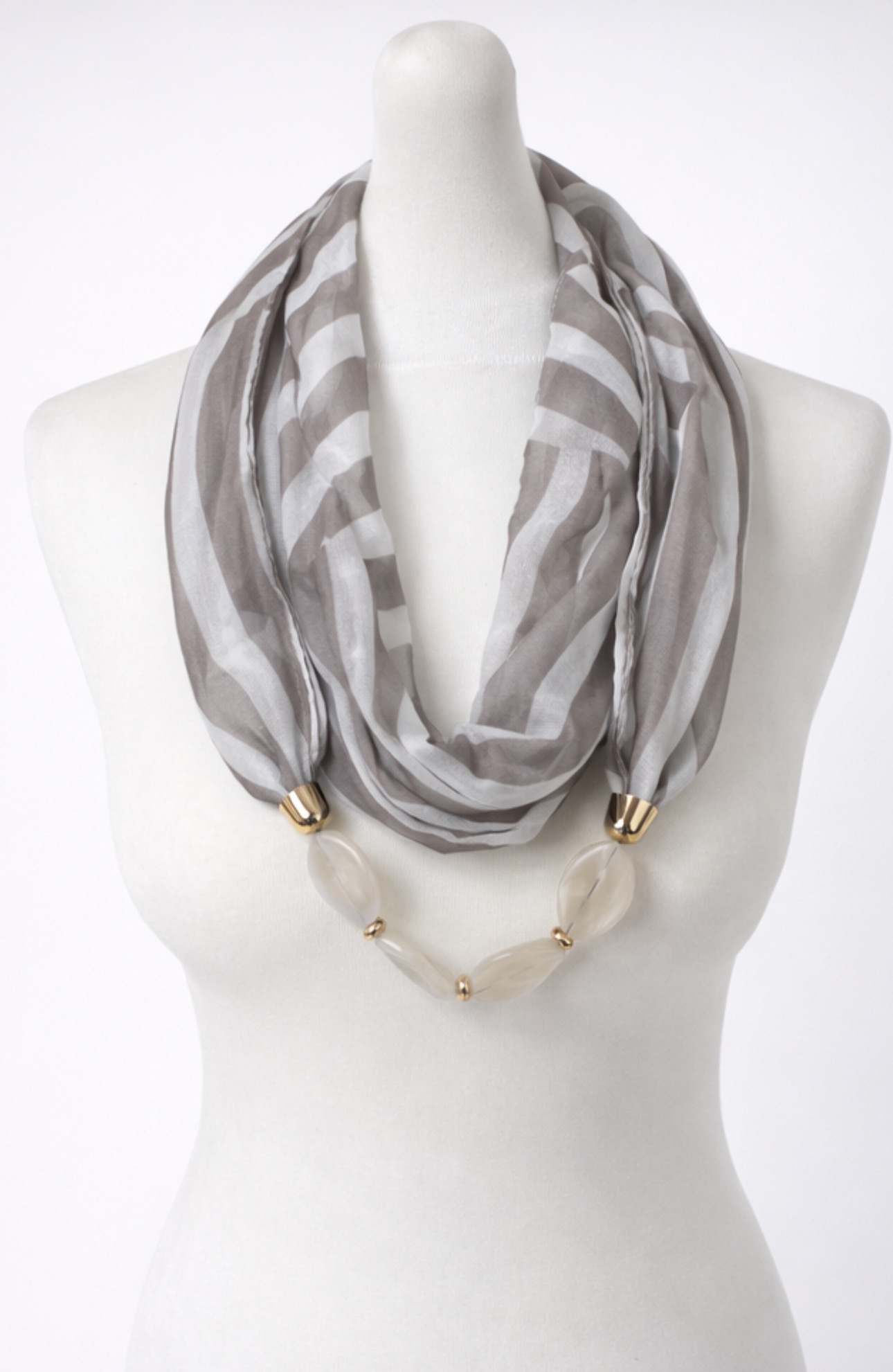 Ta chusta to połączenie lekkości tkaniny z biżuteryjnym detalem, który pozwala tworzyć różne stylizacje w zależności od okazji i nastroju. Półtransparentny materiał w odcieniach jasnej szarości i delikatnej bieli, ułożony w subtelne pasy, pięknie układa się na sylwetce i dodaje stylizacji lekkości. Całość dopełnia dekoracyjna aplikacja z gładkich, mlecznobiałych elementów połączonych akcentami w kolorze złotym, która nadaje chustie eleganckiego, biżuteryjnego charakteru.