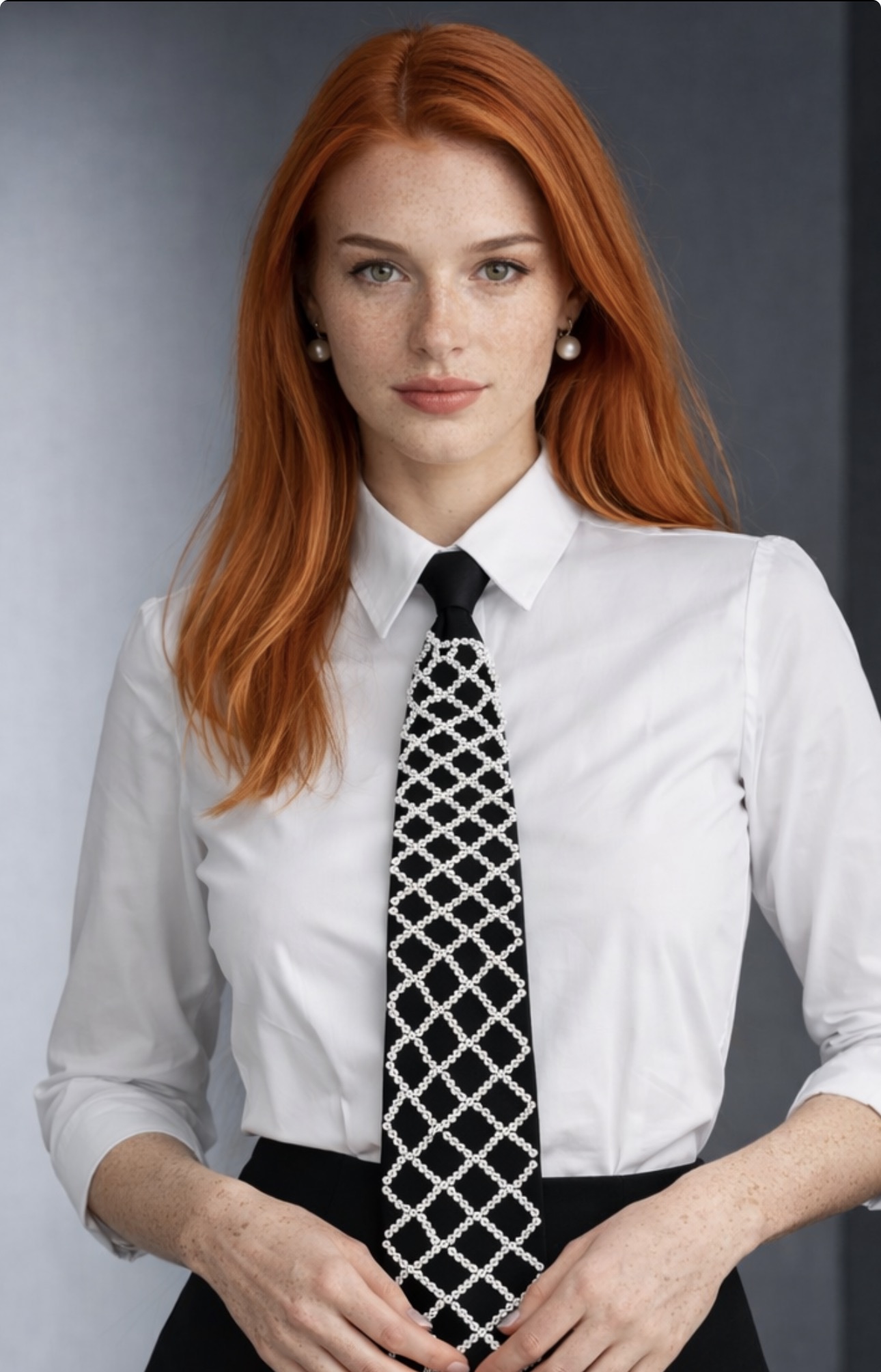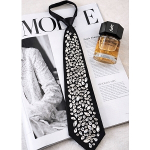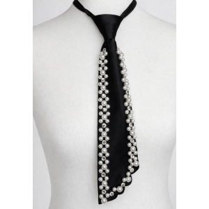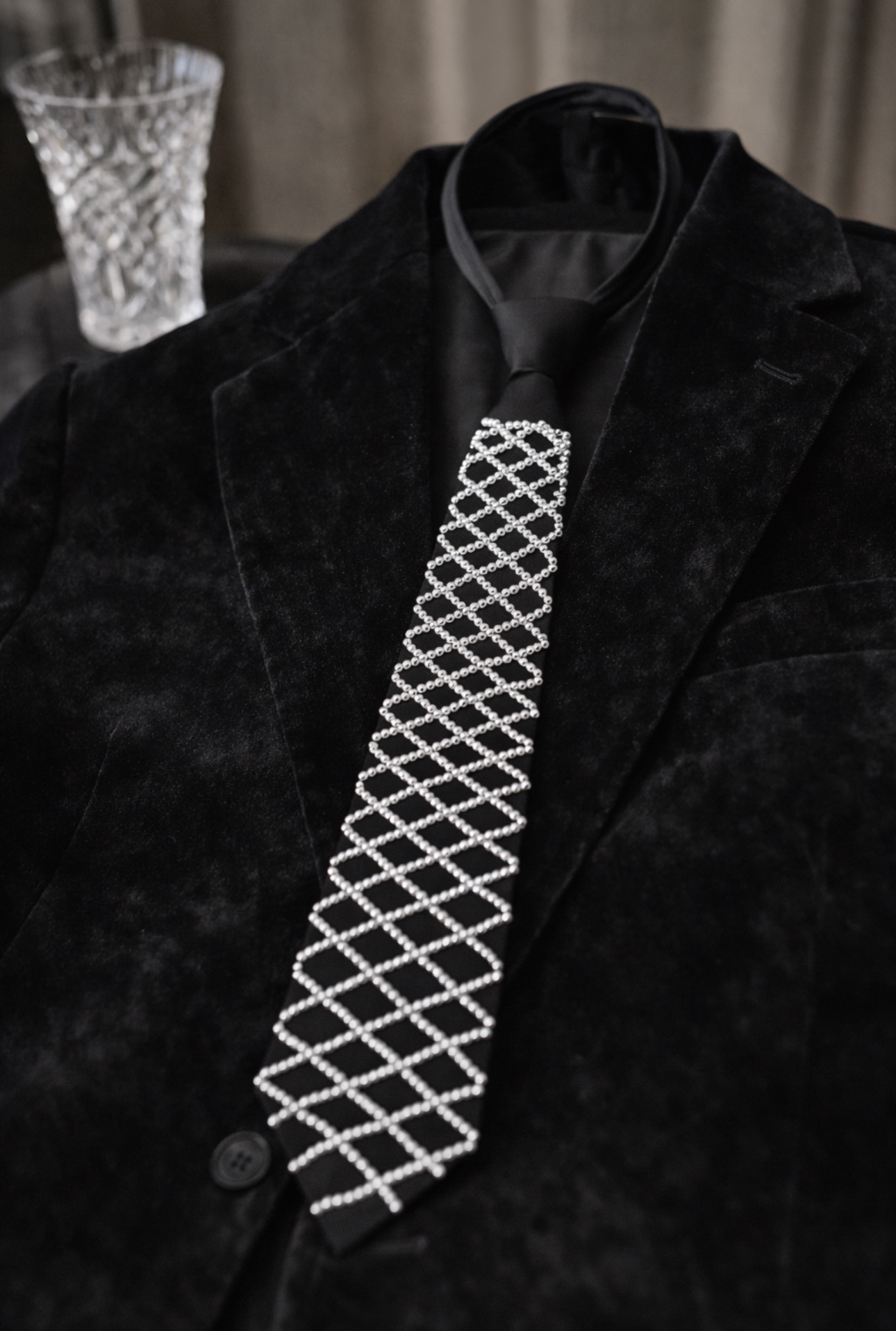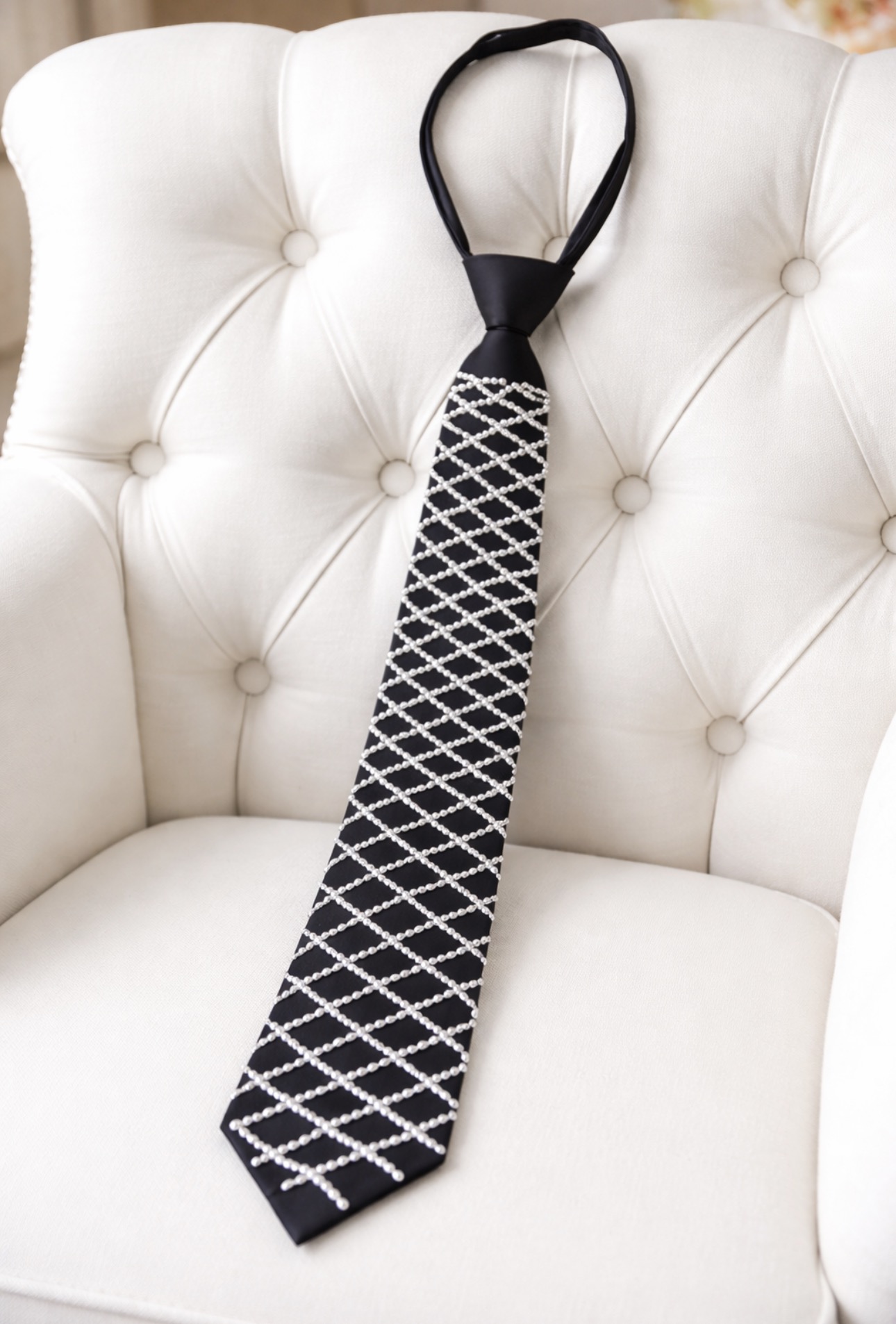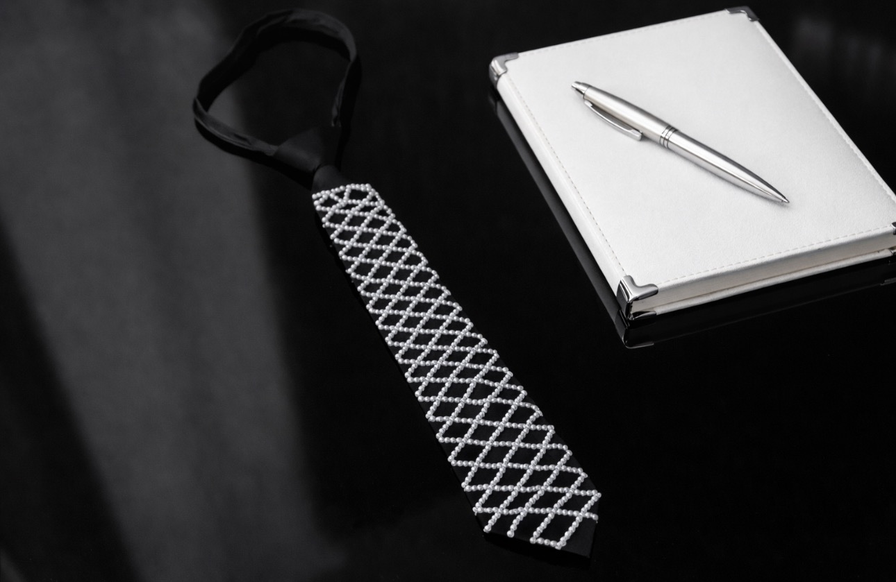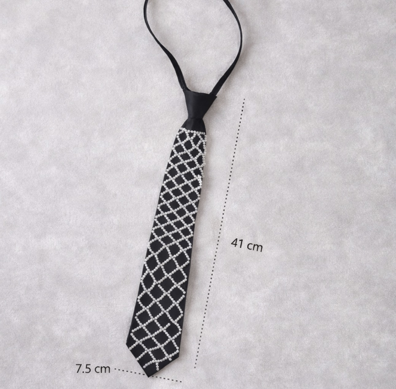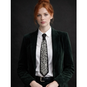 Stylowy czarny krawat ozdobiony kontrastowym, geometrycznym wzorem w postaci regularnej siatki. Minimalistyczny, a jednocześnie wyrazisty design nadaje całości nowoczesnego charakteru i sprawia, że krawat staje się mocnym akcentem stylizacji.