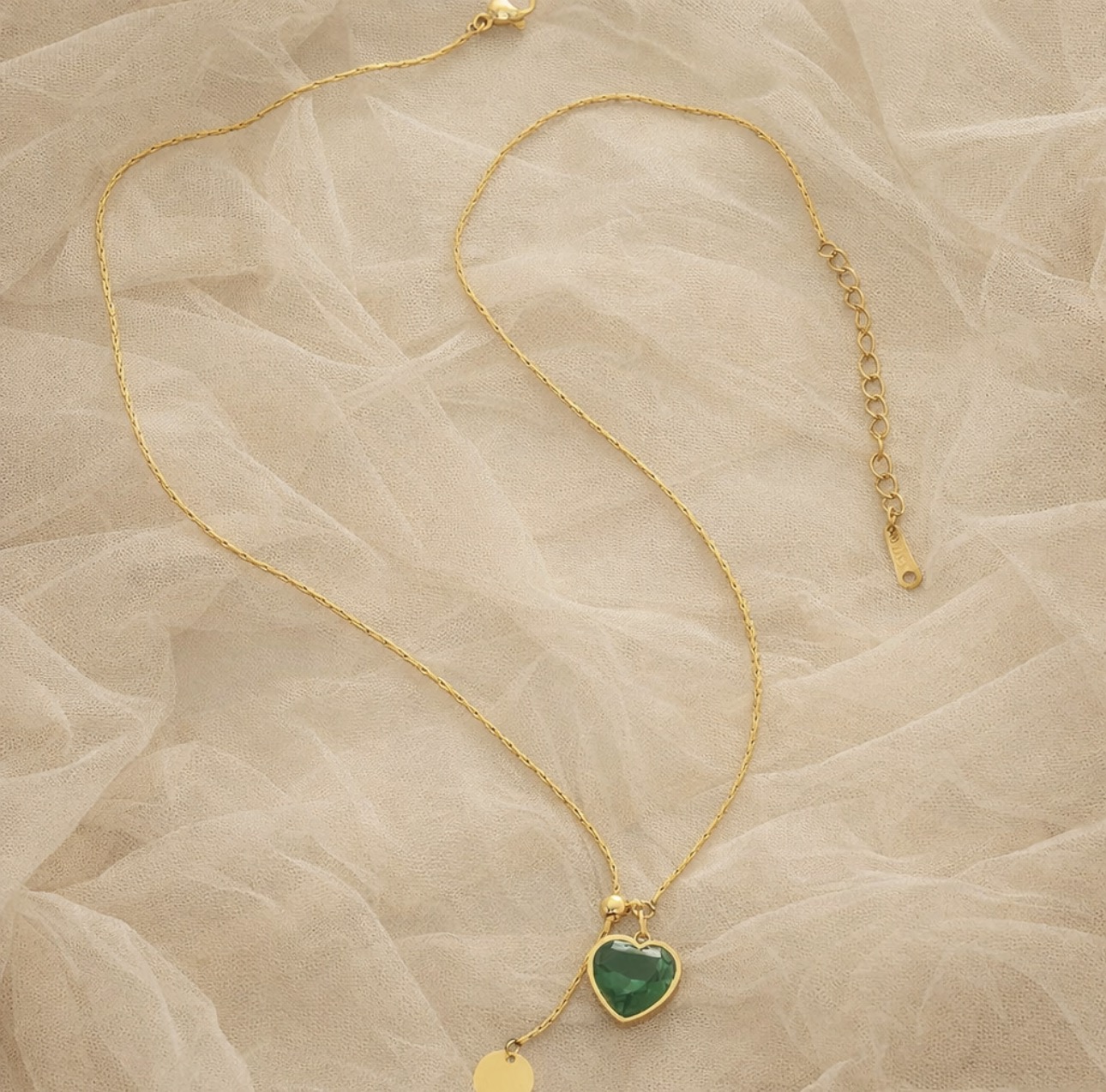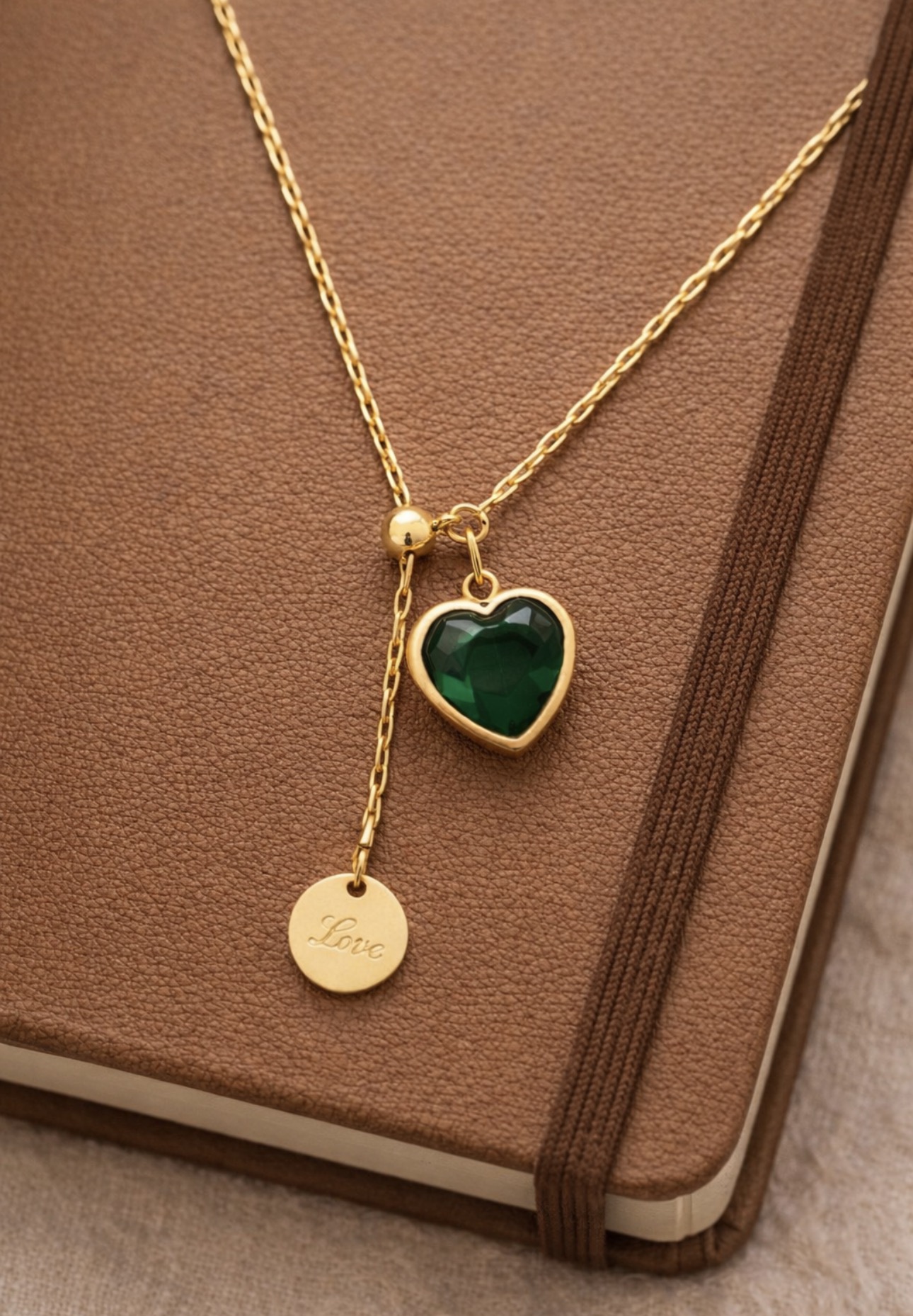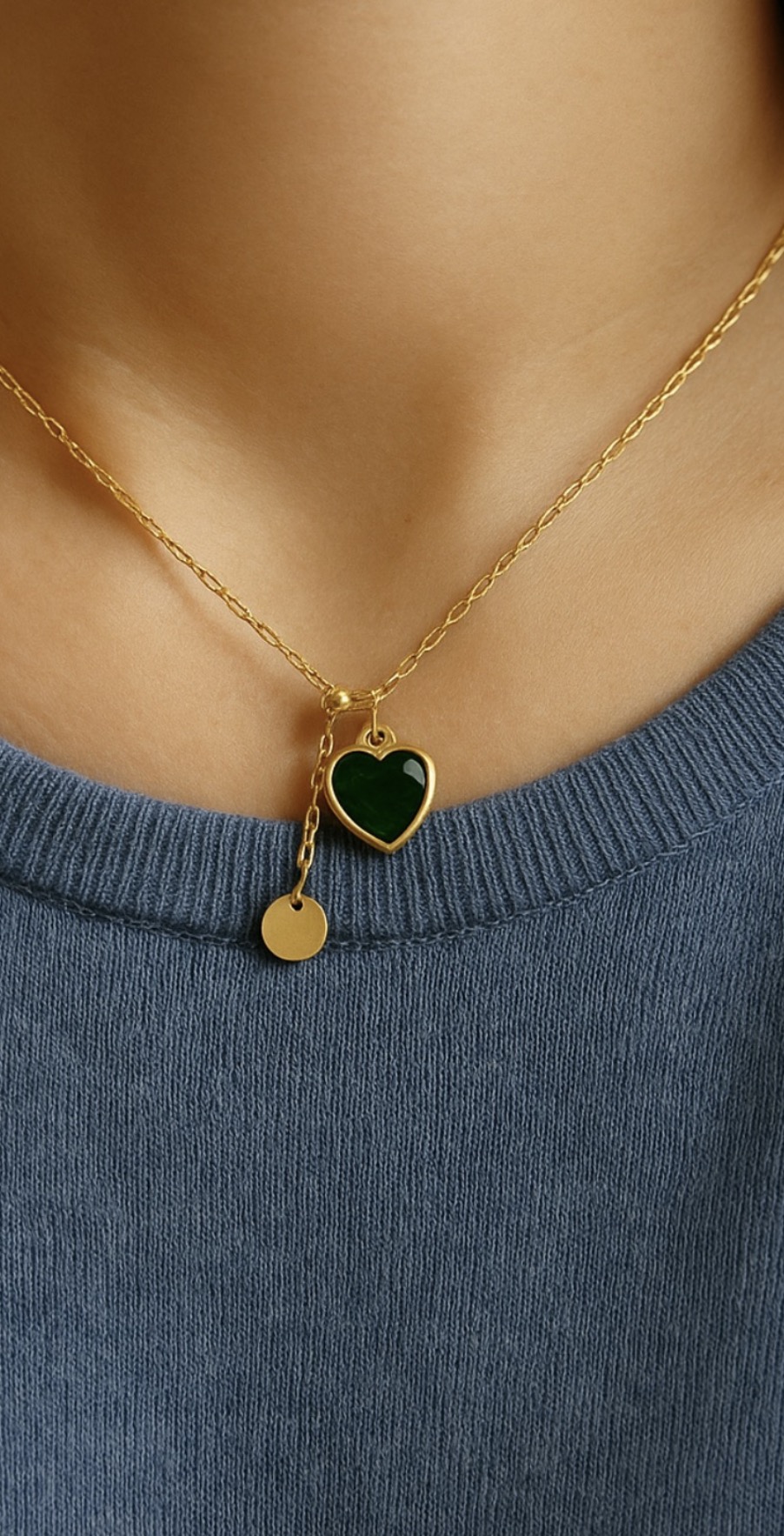 Subtelny, a jednocześnie pełen znaczenia złoty naszyjnik z motywem serca to biżuteria, która zachwyca prostotą i elegancją. Delikatny łańcuszek w ciepłym, złotym odcieniu pięknie układa się na szyi, a centralnym punktem jest serce w głębokim, szlachetnym zielonym kolorze – symbol harmonii, miłości i wewnętrznej siły. Uzupełnieniem jest minimalistyczna, złota zawieszka–medalik, dodająca całości nowoczesnego, luksusowego charakteru.