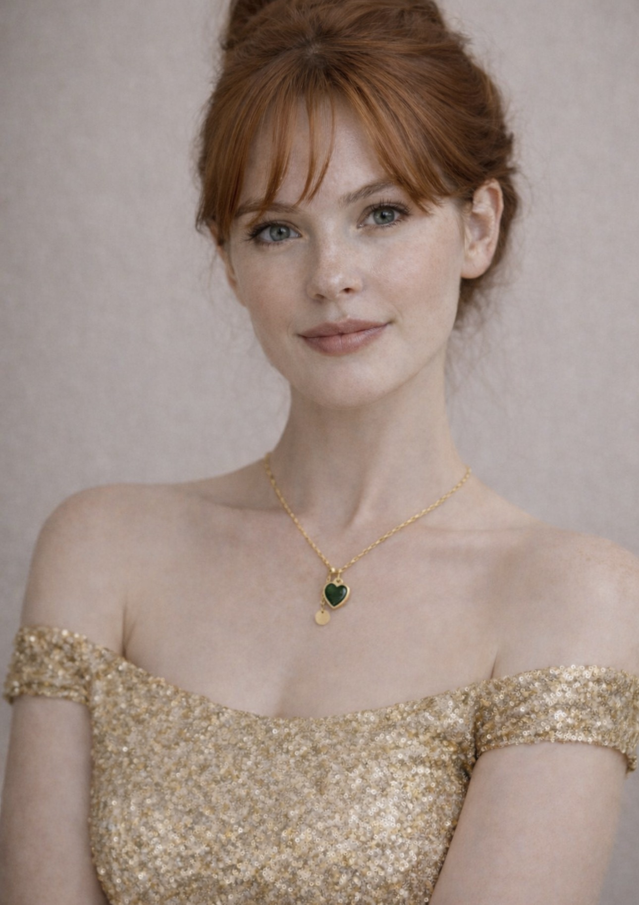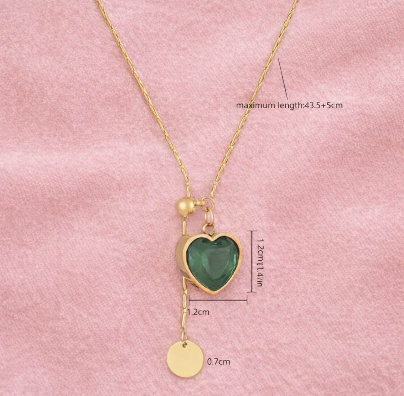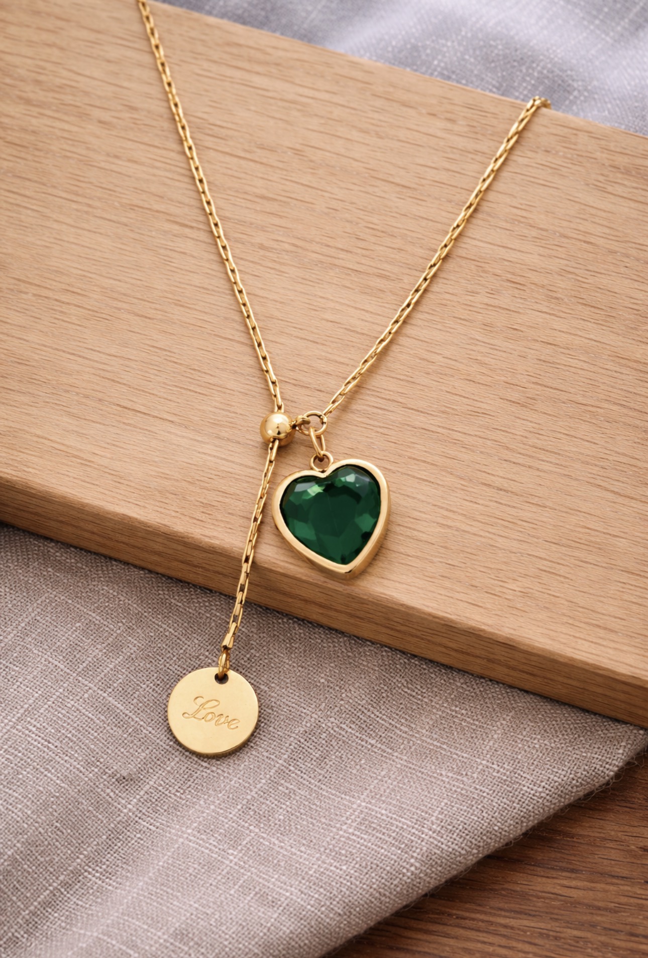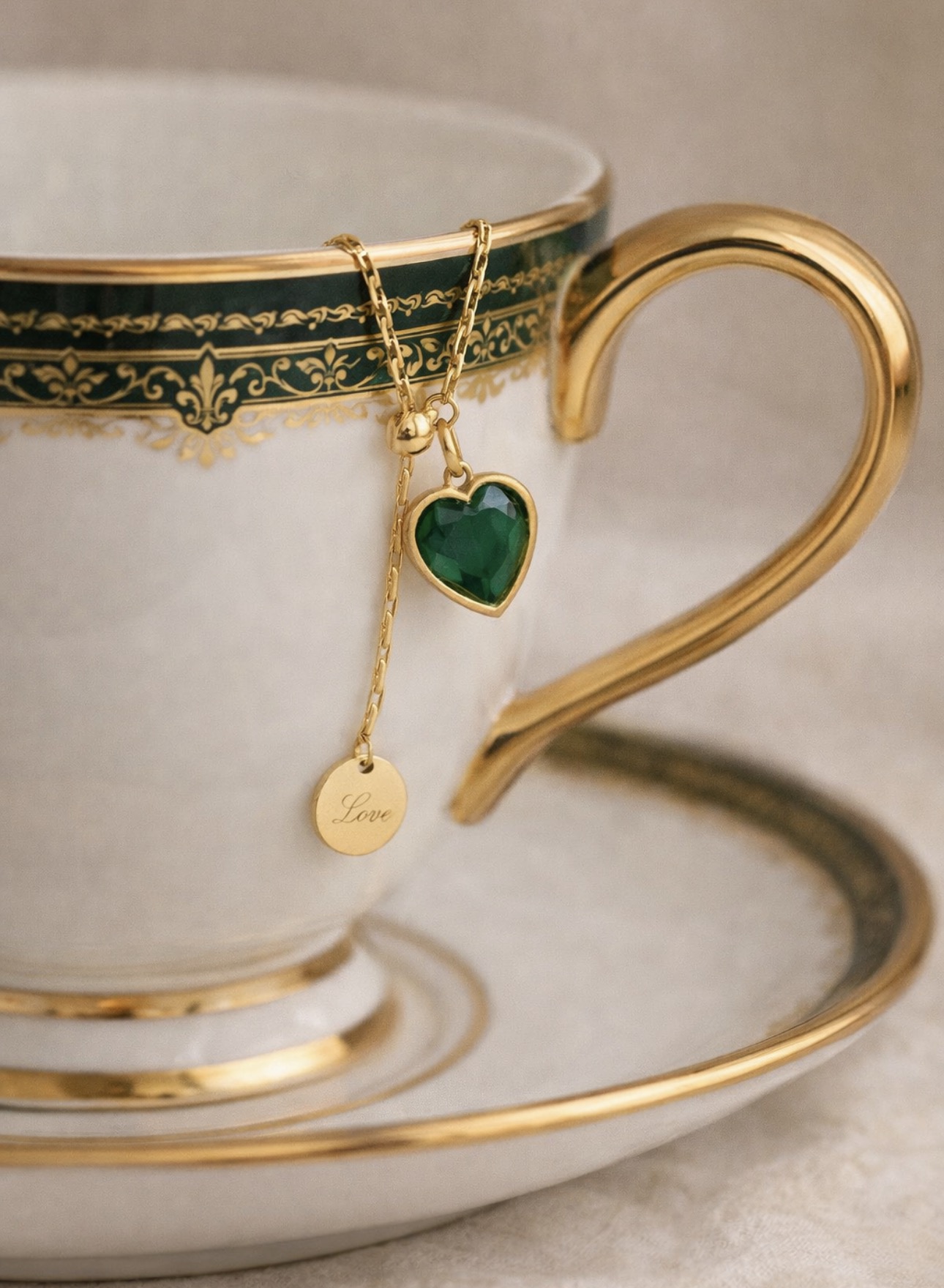 Subtelny, a jednocześnie pełen znaczenia złoty naszyjnik z motywem serca to biżuteria, która zachwyca prostotą i elegancją. Delikatny łańcuszek w ciepłym, złotym odcieniu pięknie układa się na szyi, a centralnym punktem jest serce w głębokim, szlachetnym zielonym kolorze – symbol harmonii, miłości i wewnętrznej siły. Uzupełnieniem jest minimalistyczna, złota zawieszka–medalik, dodająca całości nowoczesnego, luksusowego charakteru.