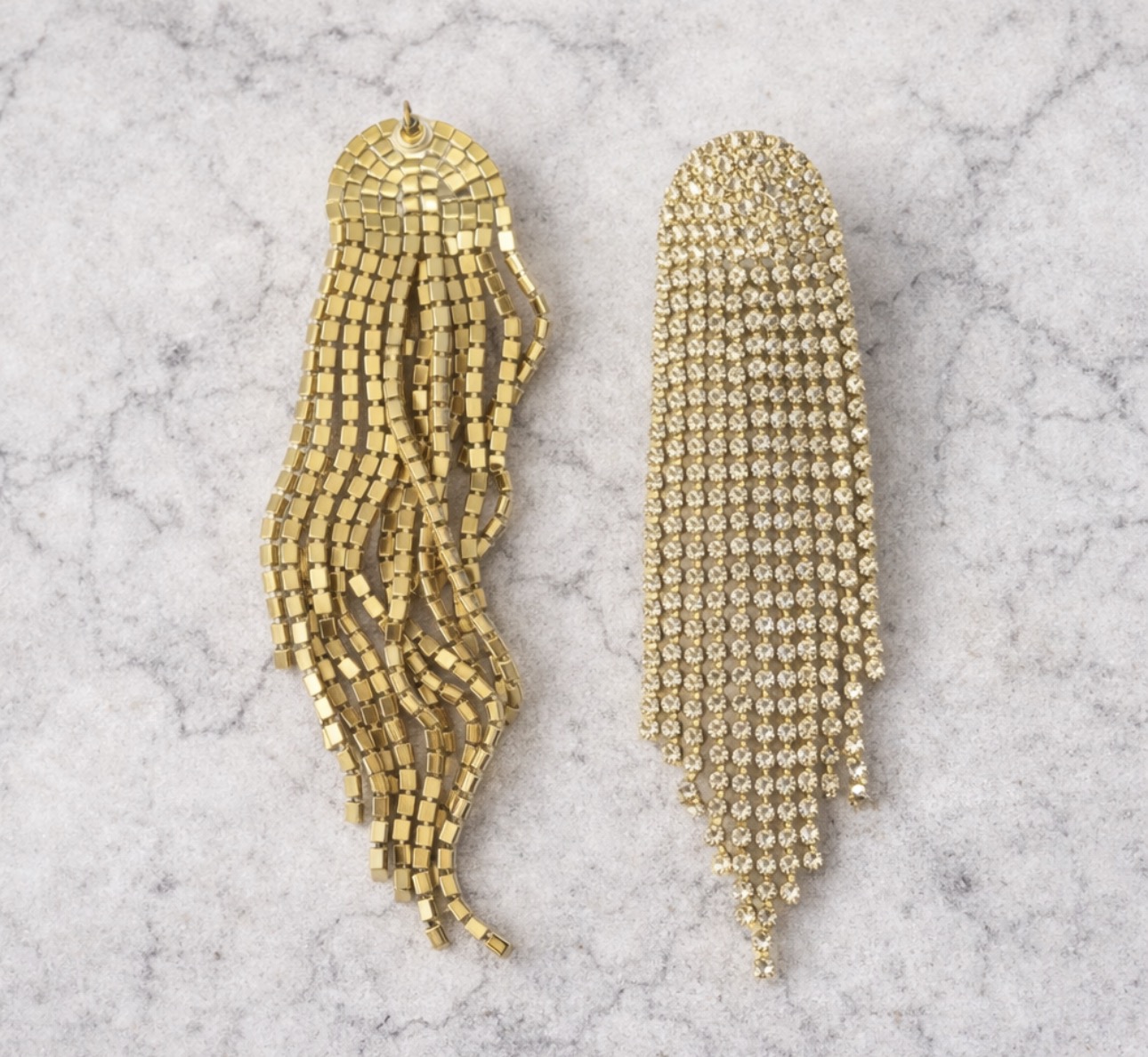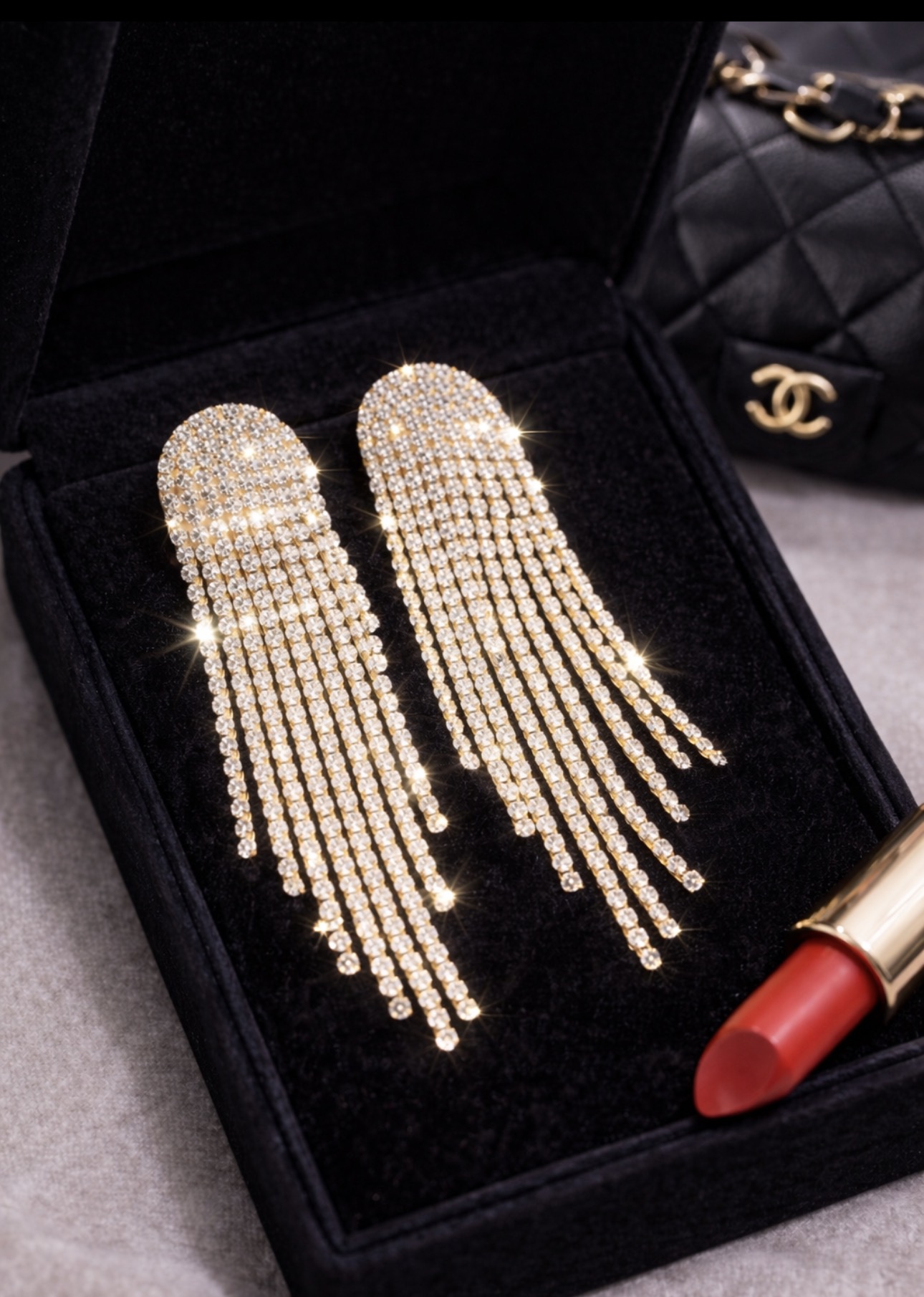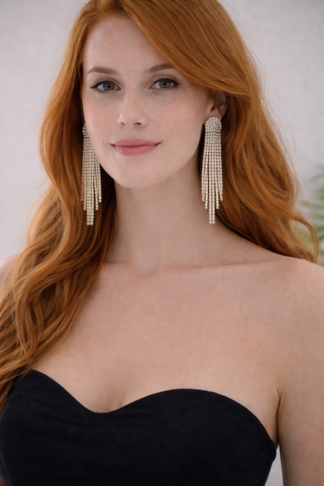 Te złote kolczyki wiszące z kryształkami to esencja elegancji w stylu glamour. Gęsto zdobiona górna część pięknie przechodzi w długie, swobodnie opadające pasma kryształków, które poruszają się przy każdym ruchu, spektakularnie odbijając światło.