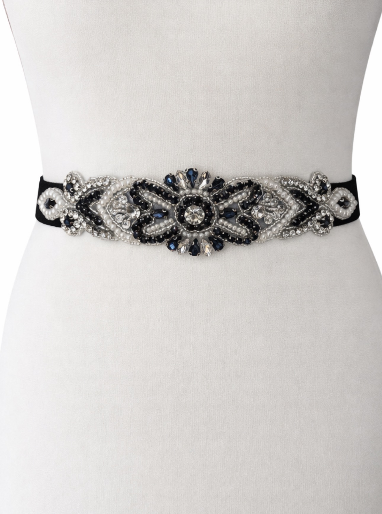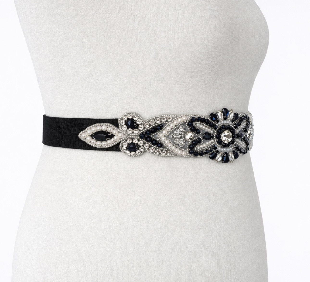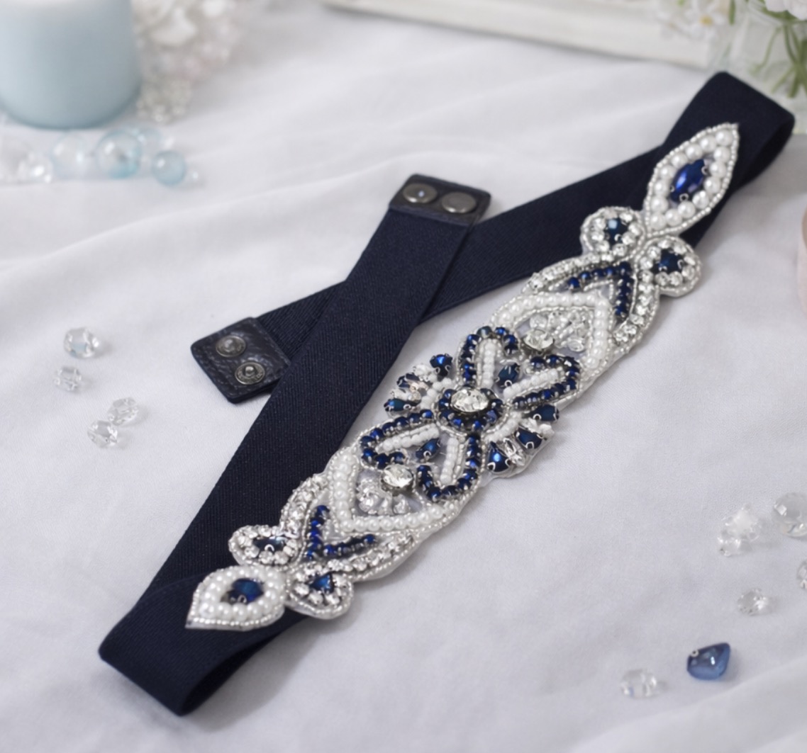 Haftowana aplikacja z kryształami i perłami przyciąga spojrzenia