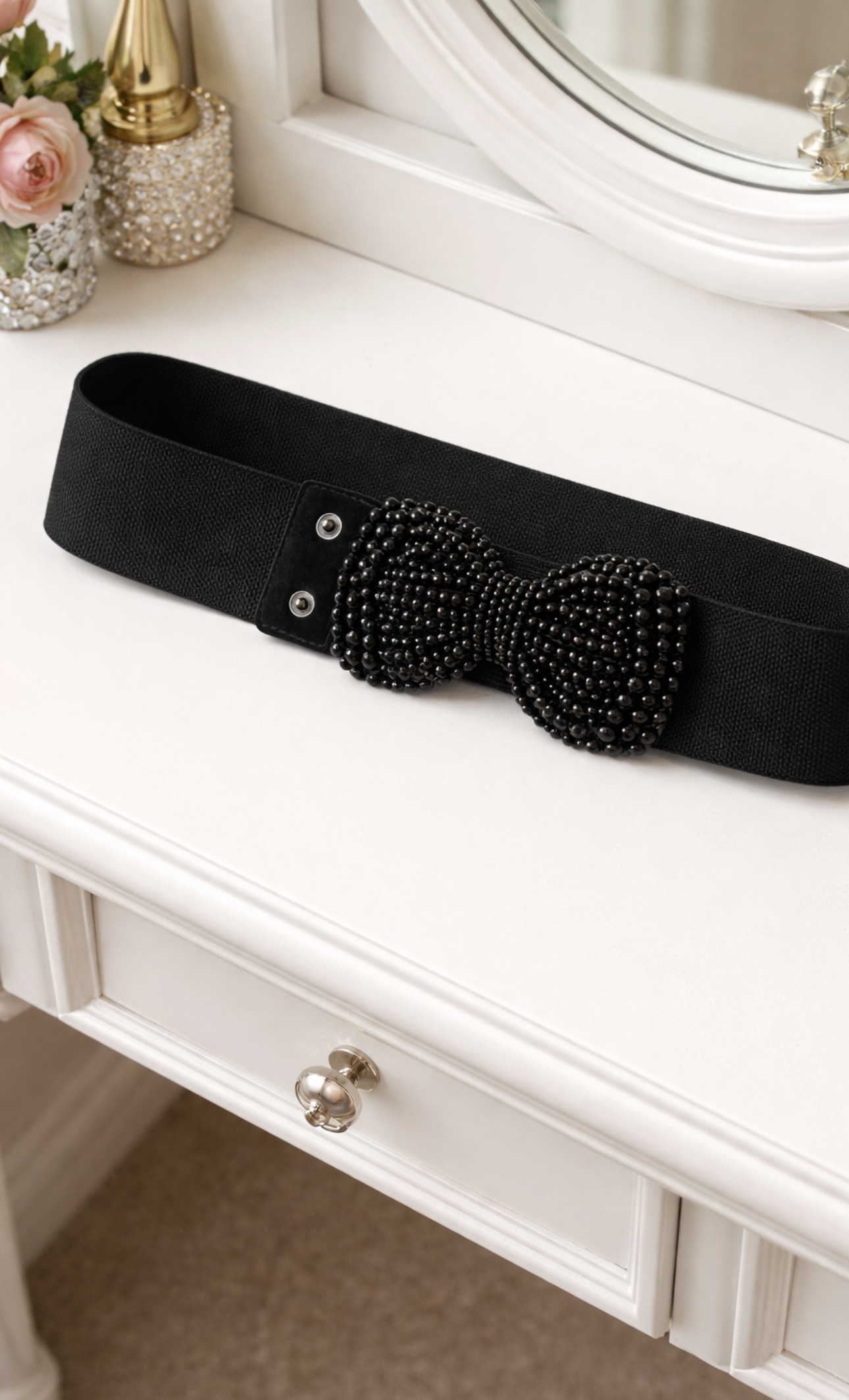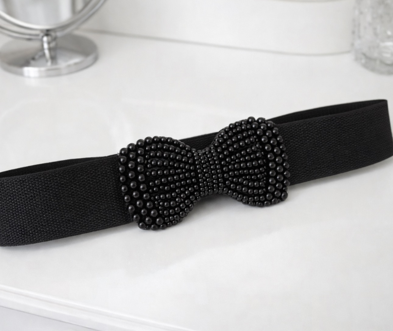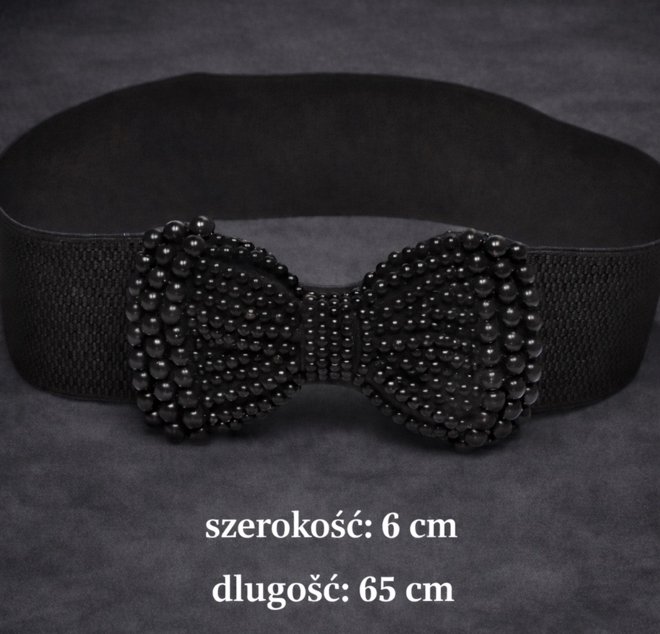 Stylowy czarny pasek na elastycznej gumce, ozdobiony efektowną kokardą z drobnych, lśniących koralików. Biżuteryjne zdobienie nadaje całości eleganckiego, glamour charakteru i sprawia, że pasek staje się wyrazistym akcentem każdej stylizacji. To idealne połączenie wygody i stylu.