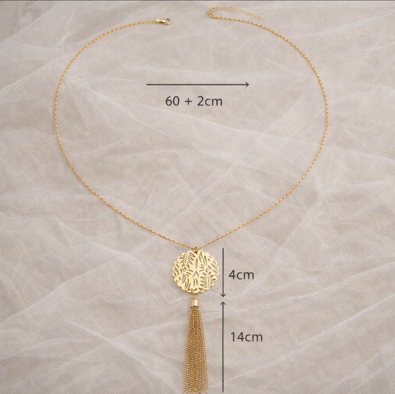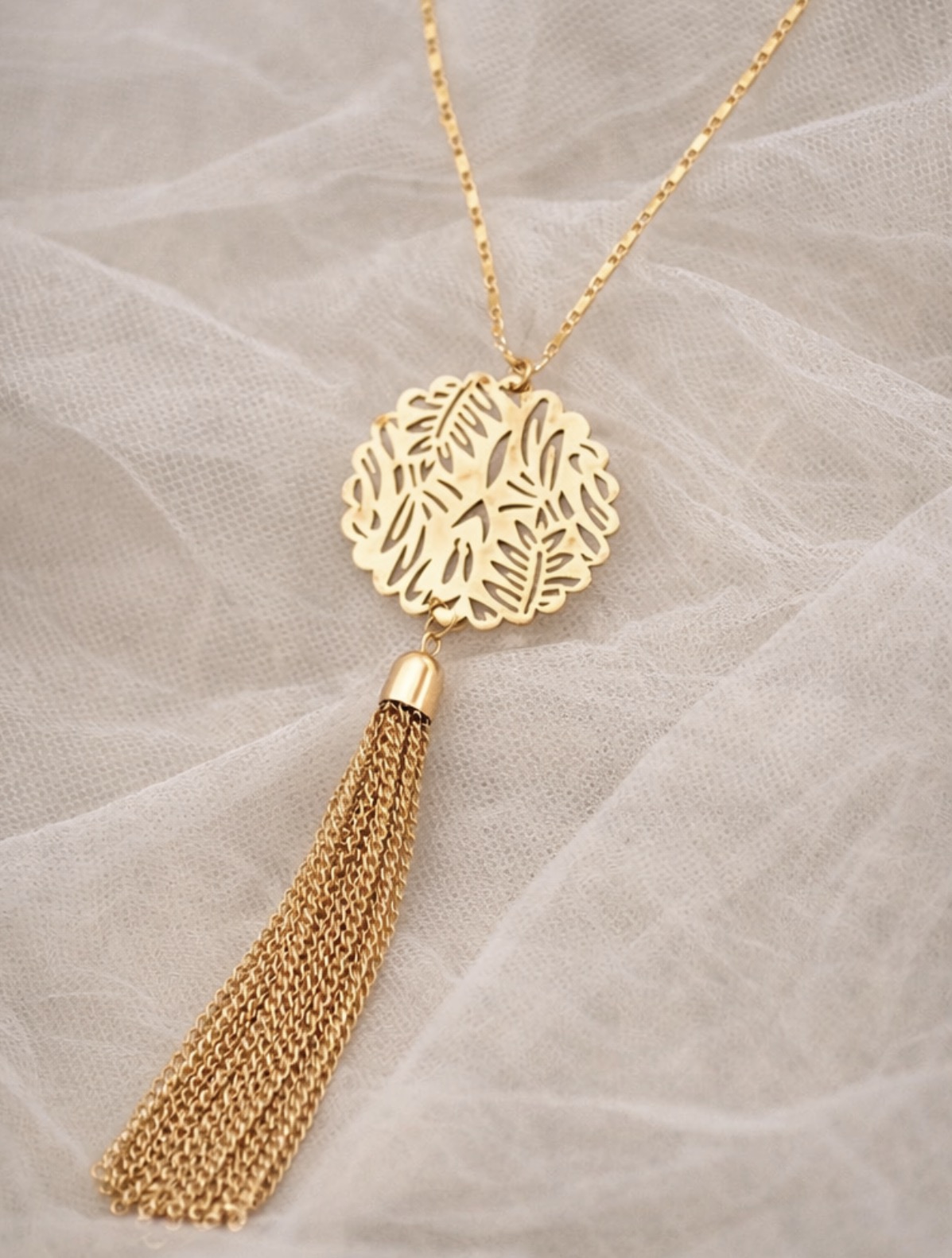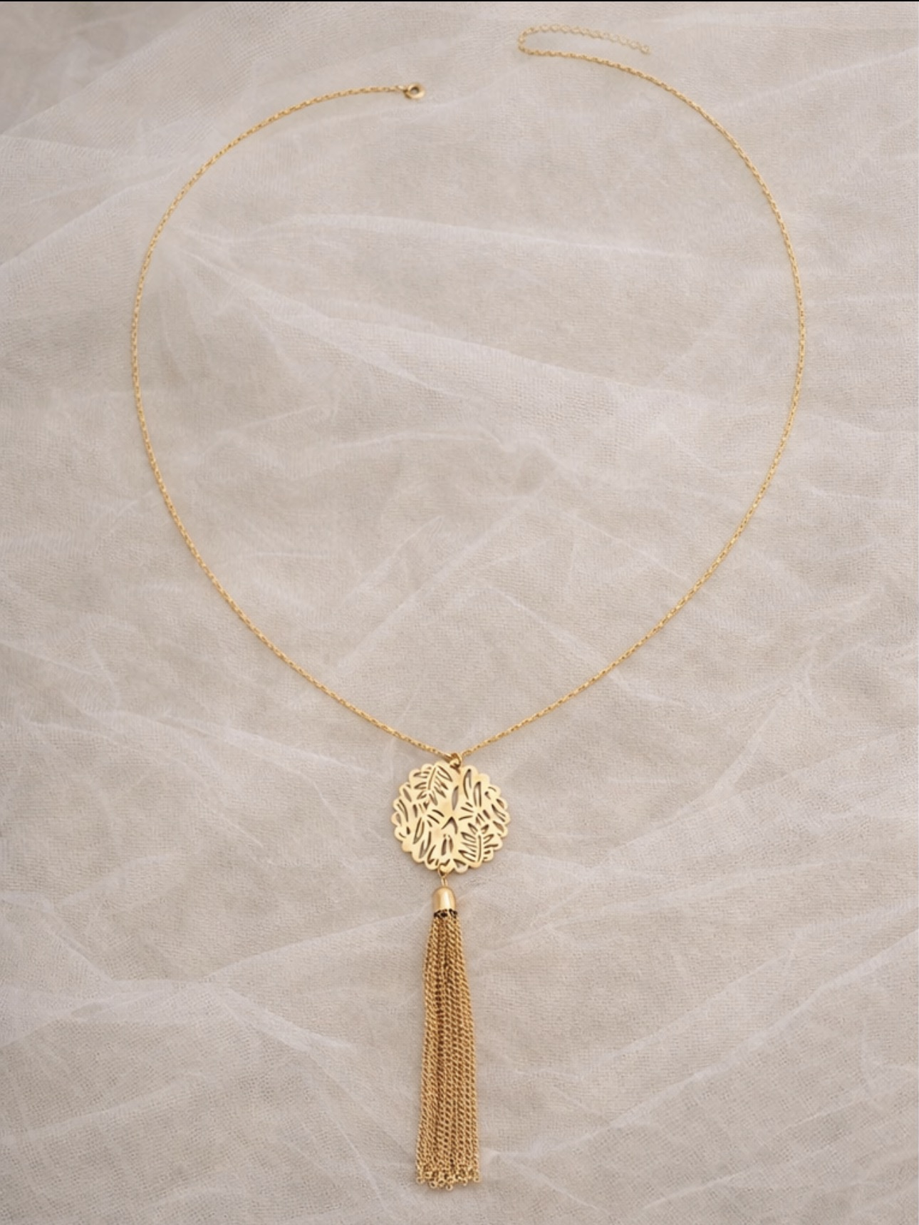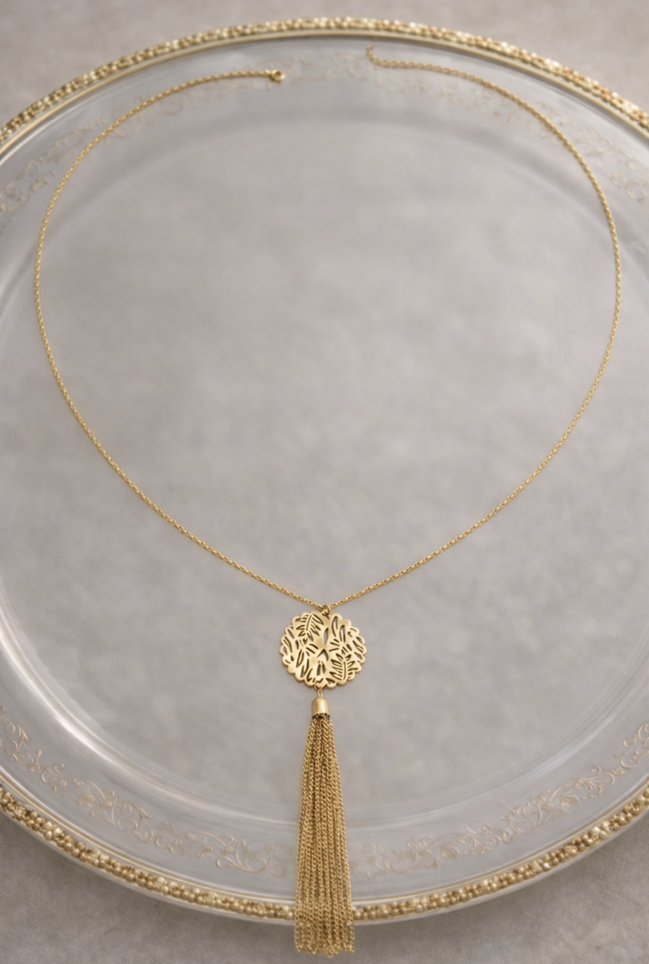 Ten złoty naszyjnik z ażurową zawieszką i chwostem to wyjątkowe połączenie klasyki i nowoczesnej elegancji. Ozdobna, okrągła zawieszka o misternym, ażurowym wzorze przyciąga uwagę subtelnym blaskiem, a delikatny, długi chwost dodaje całości lekkości i zmysłowego charakteru.