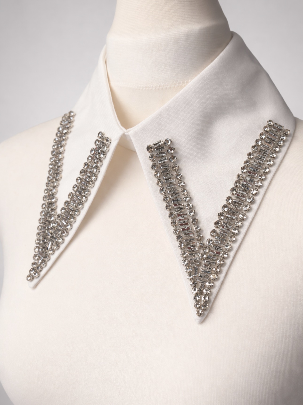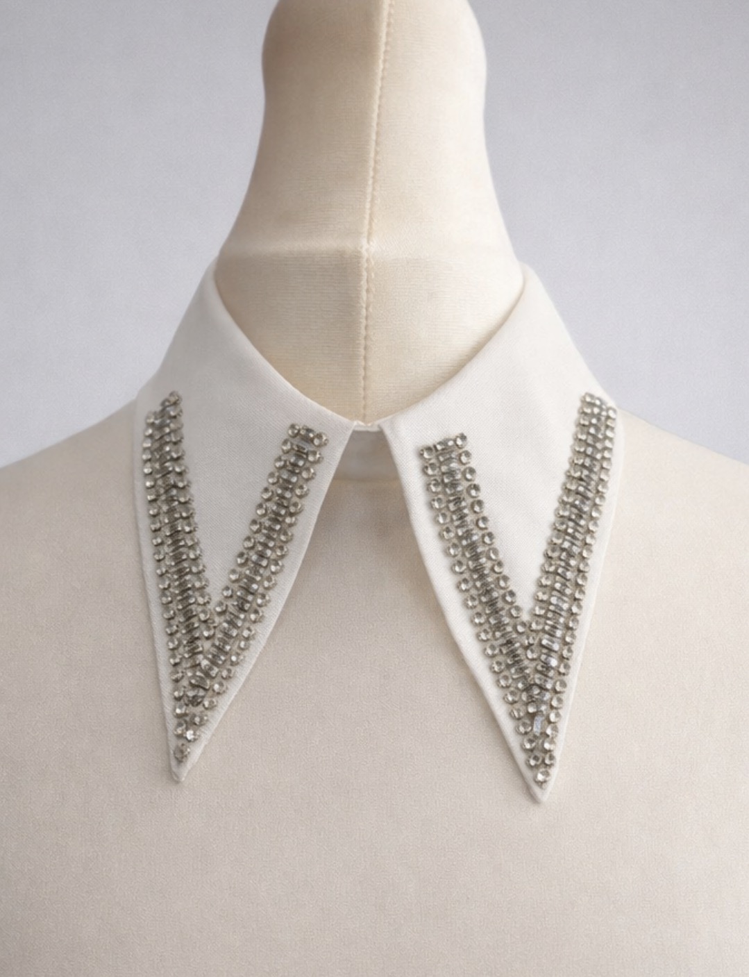 Ten ozdobny kołnierzyk z kryształkami to wyjątkowy dodatek inspirowany biżuterią. Klasyczna, biała baza została wzbogacona efektownym zdobieniem z lśniących kryształków, które pięknie odbijają światło i nadają całości eleganckiego, luksusowego charakteru.