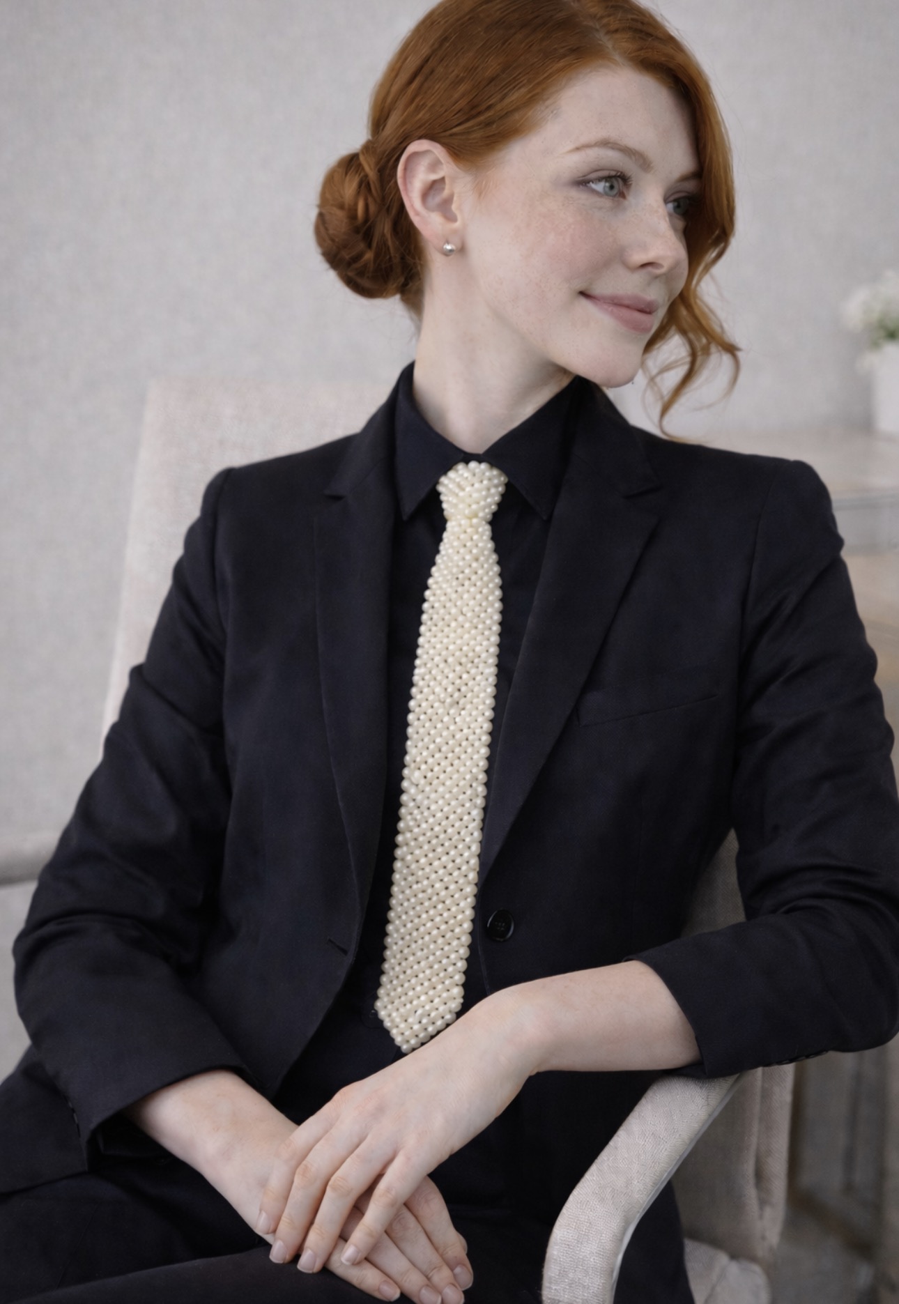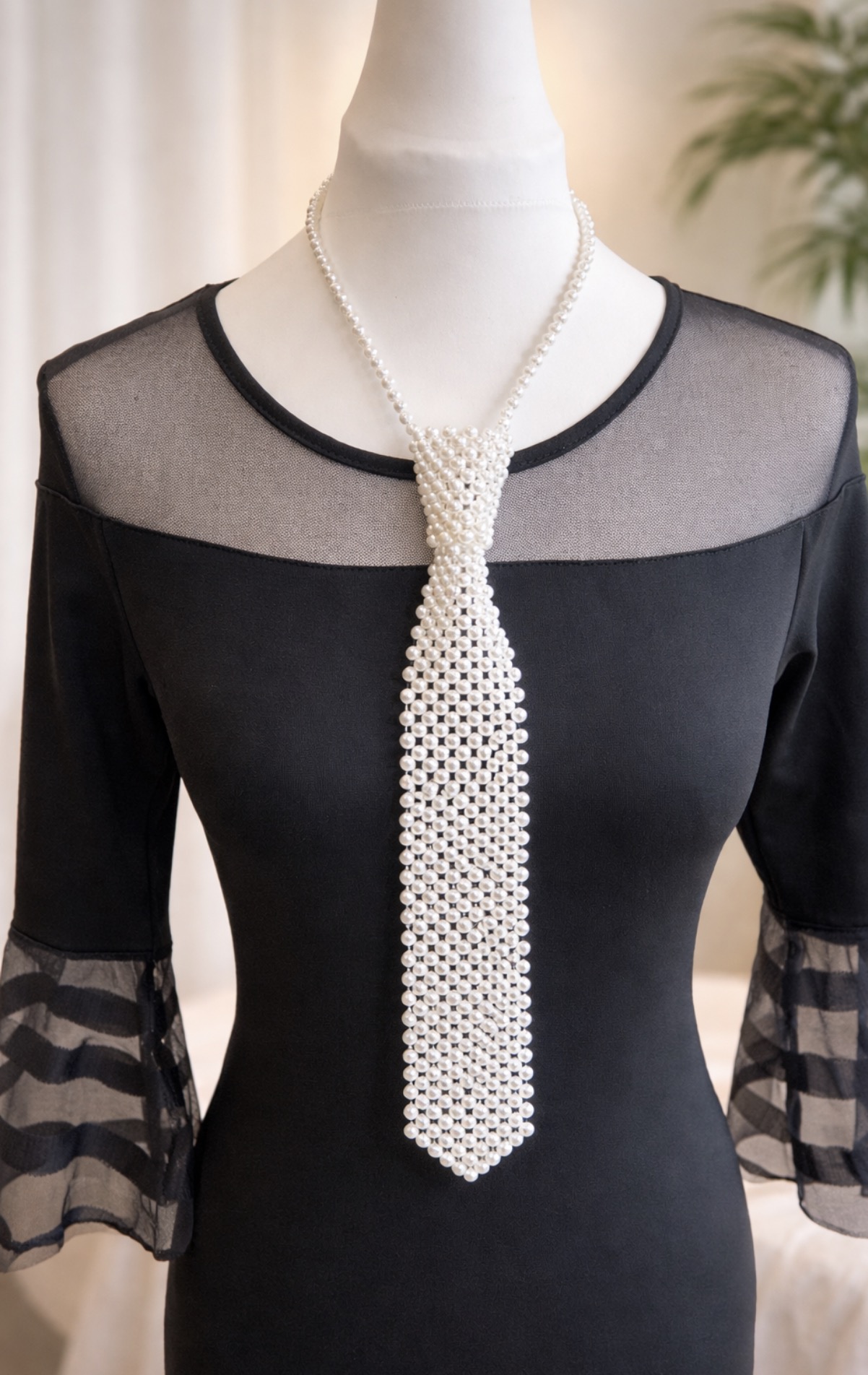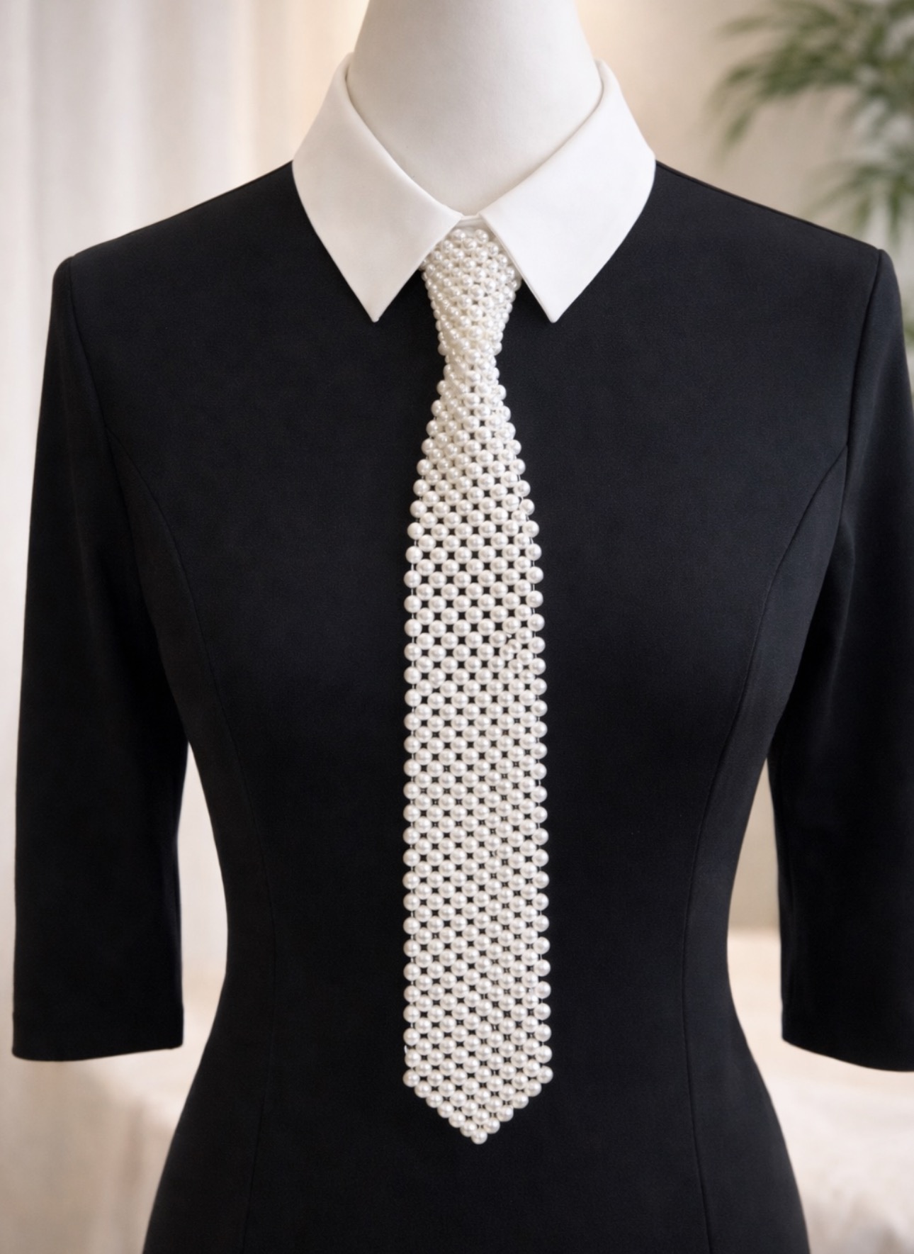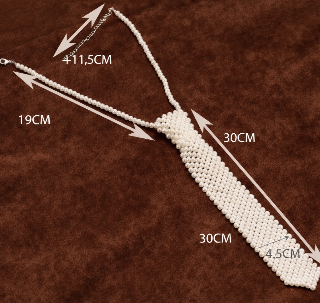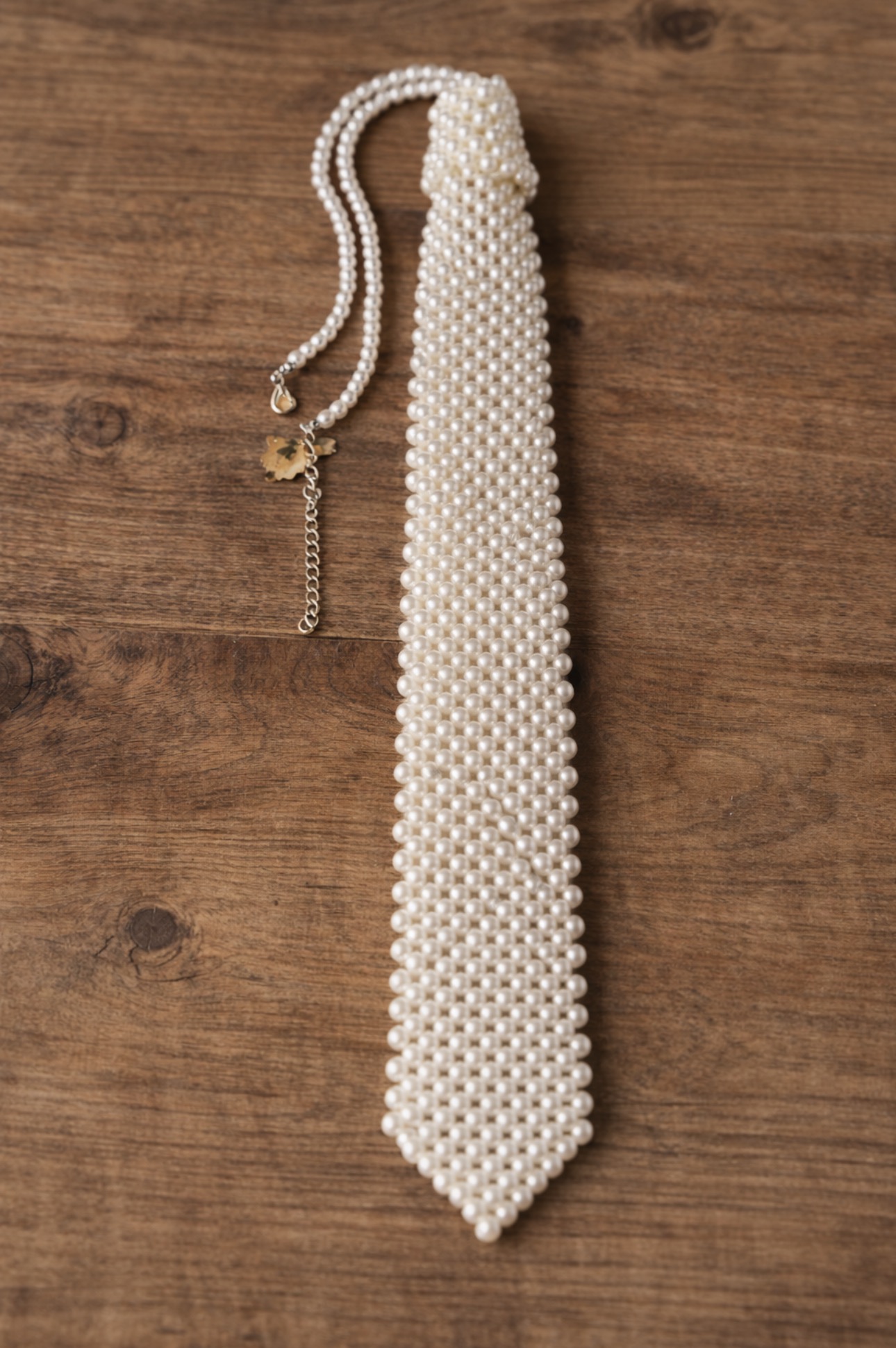 Ten ozdobny krawat z perełek to wyrafinowana alternatywa dla tradycyjnego krawata. Wykonany z drobnych, starannie połączonych perełek w jasnym, perłowym kolorze, tworzy efekt biżuterii, która nadaje stylizacji wyjątkowego charakteru.