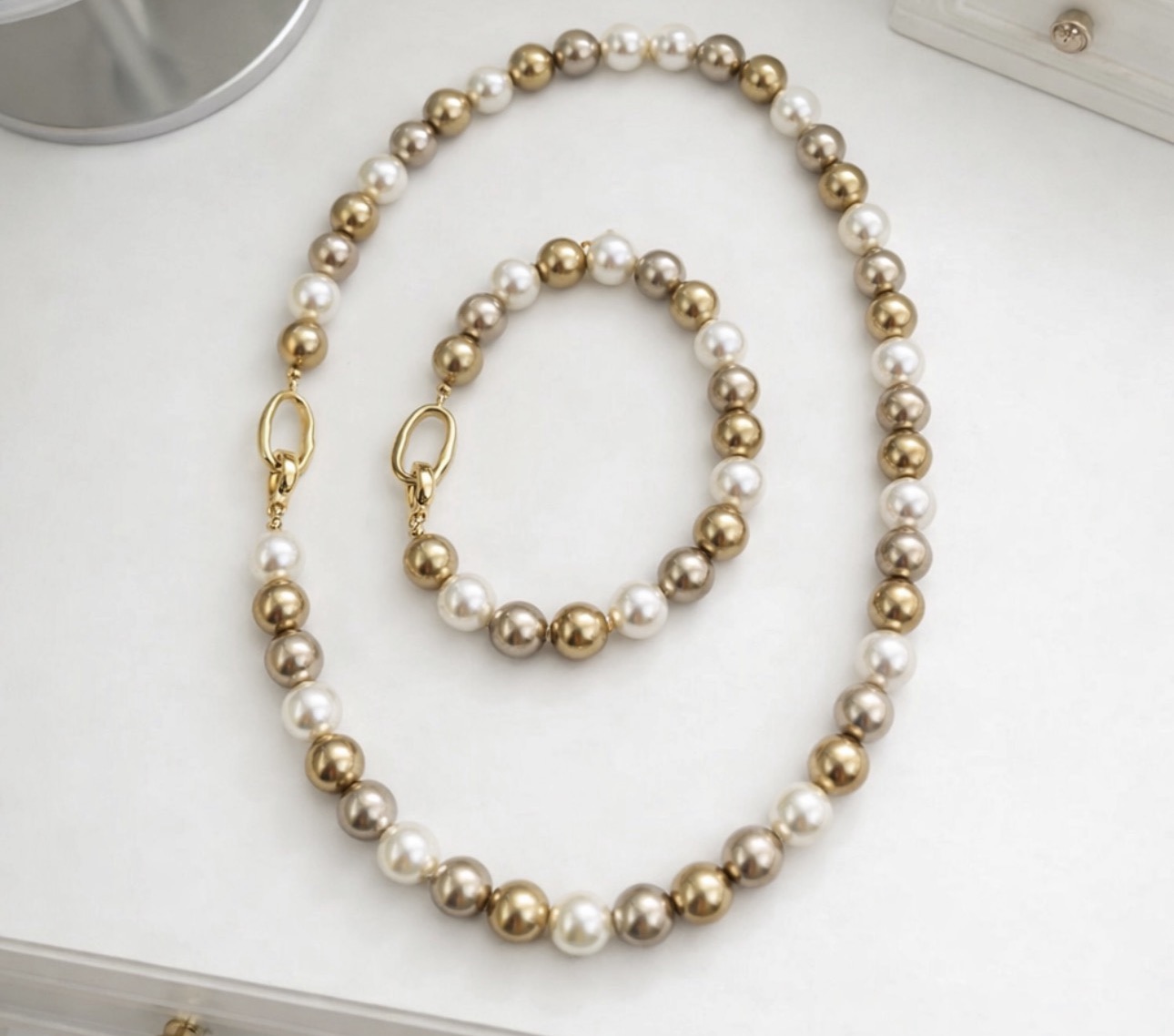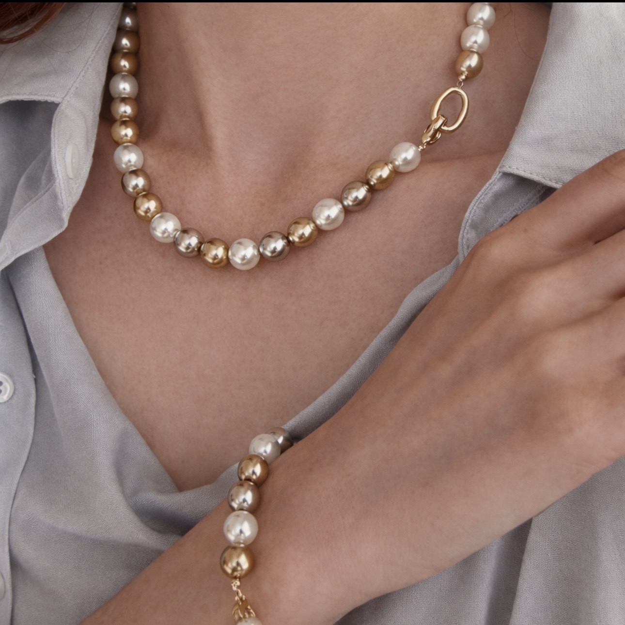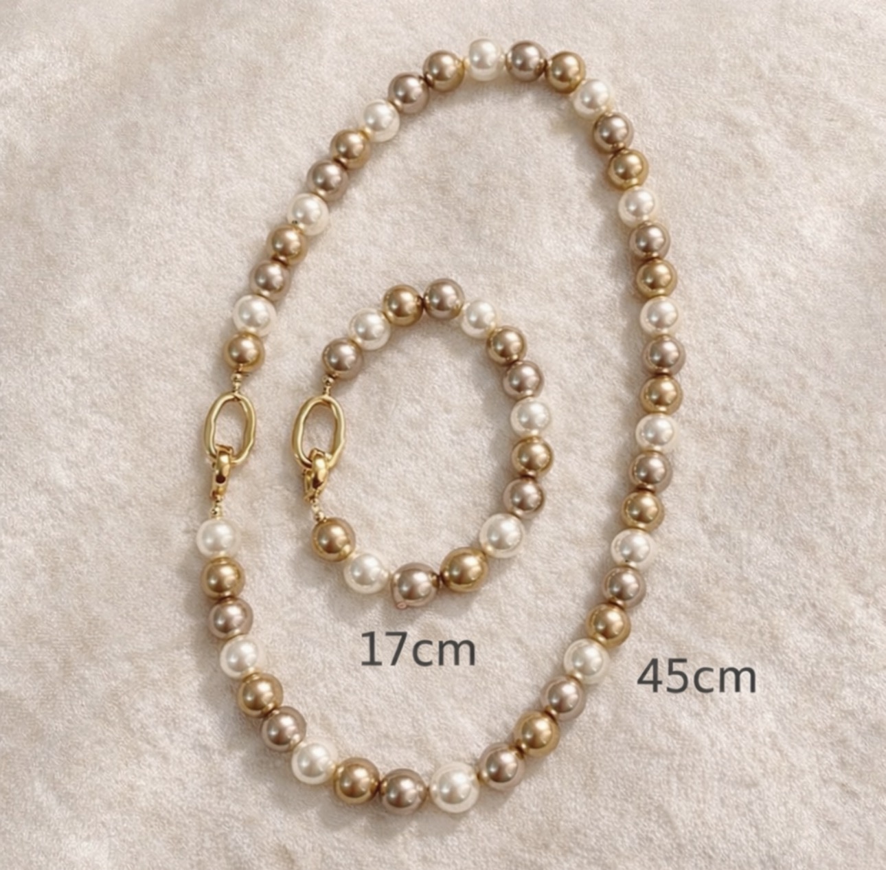 Stylowy zestaw biżuterii składający się z naszyjnika oraz bransoletki wykonanych z szklanych pereł. Połączenie pereł w odcieniach bieli i złota tworzy elegancki, ponadczasowy efekt, który pięknie podkreśla stylizacje zarówno codzienne, jak i bardziej uroczyste.