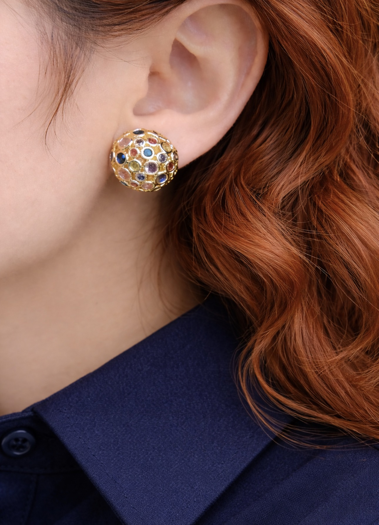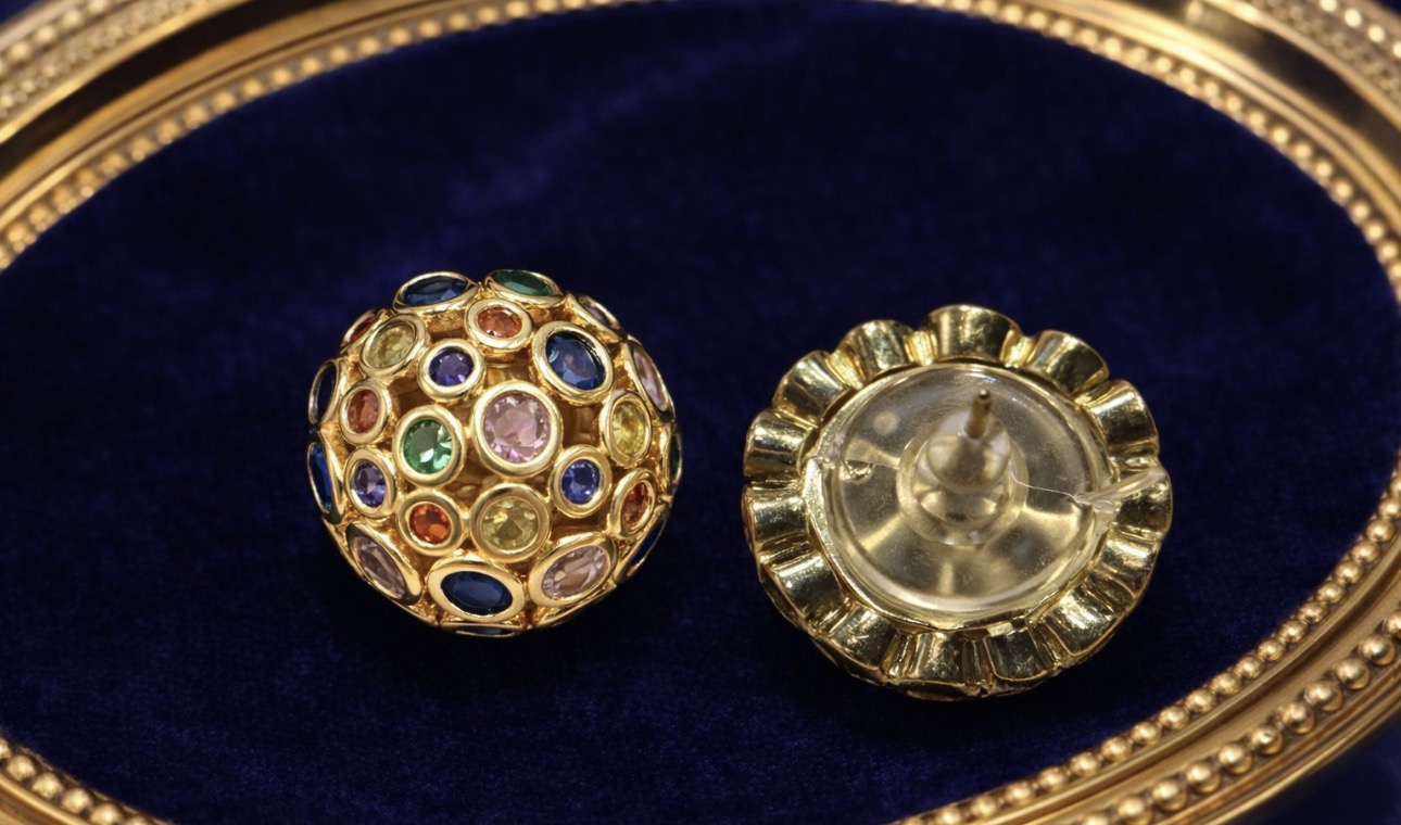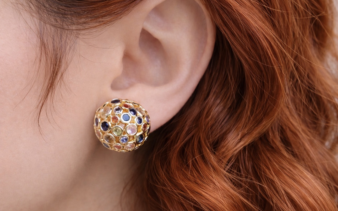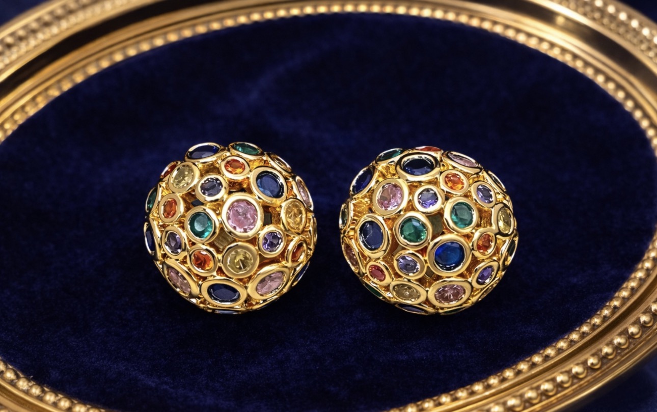 Te złote kolczyki kulki z kolorowymi kryształkami to doskonałe połączenie ponadczasowej formy i subtelnego blasku. Kulista konstrukcja została ozdobiona drobnymi, wielobarwnymi kamieniami osadzonymi w złotej oprawie, co tworzy efekt delikatnej mozaiki i nadaje biżuterii wyjątkowego charakteru.