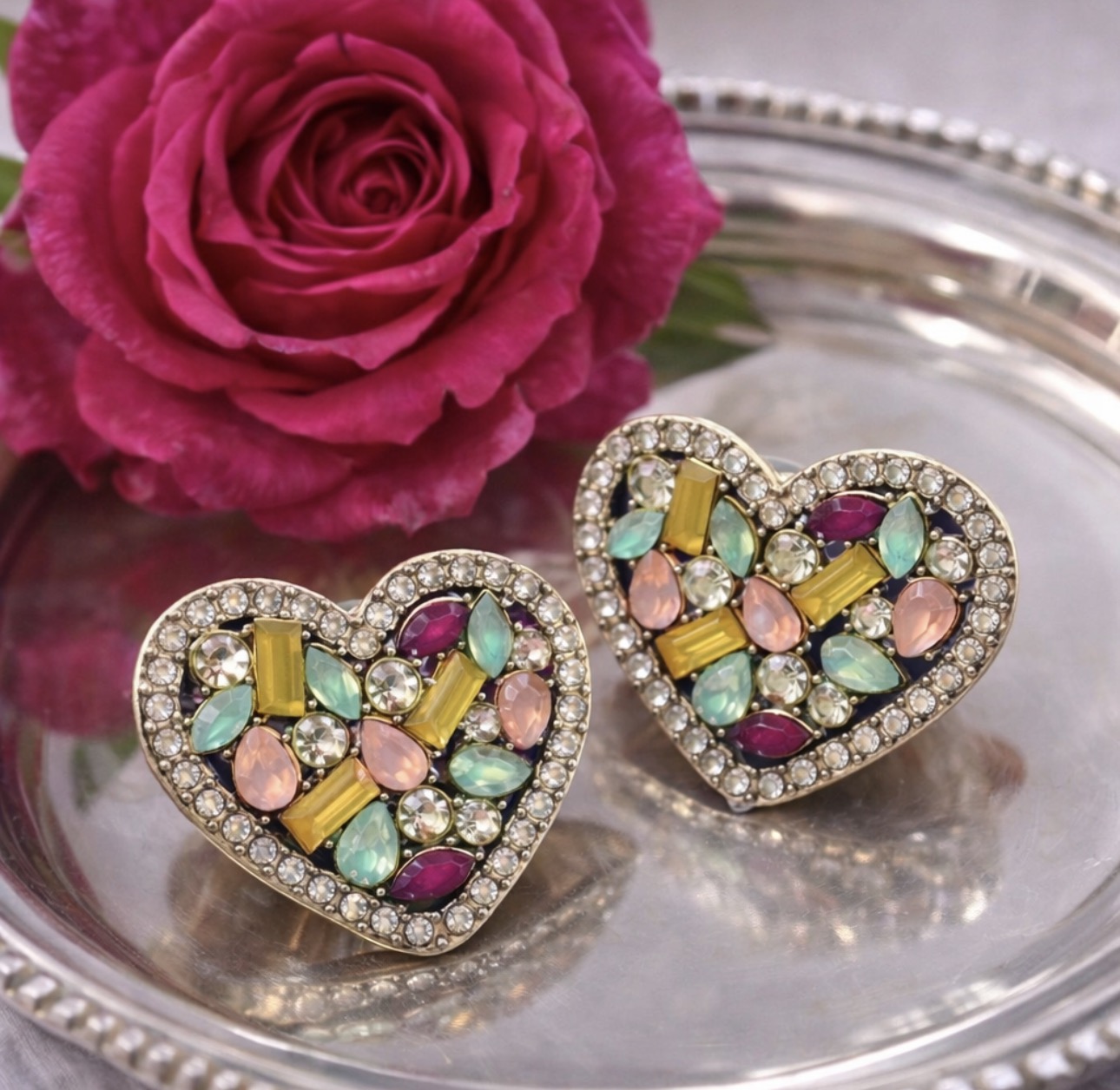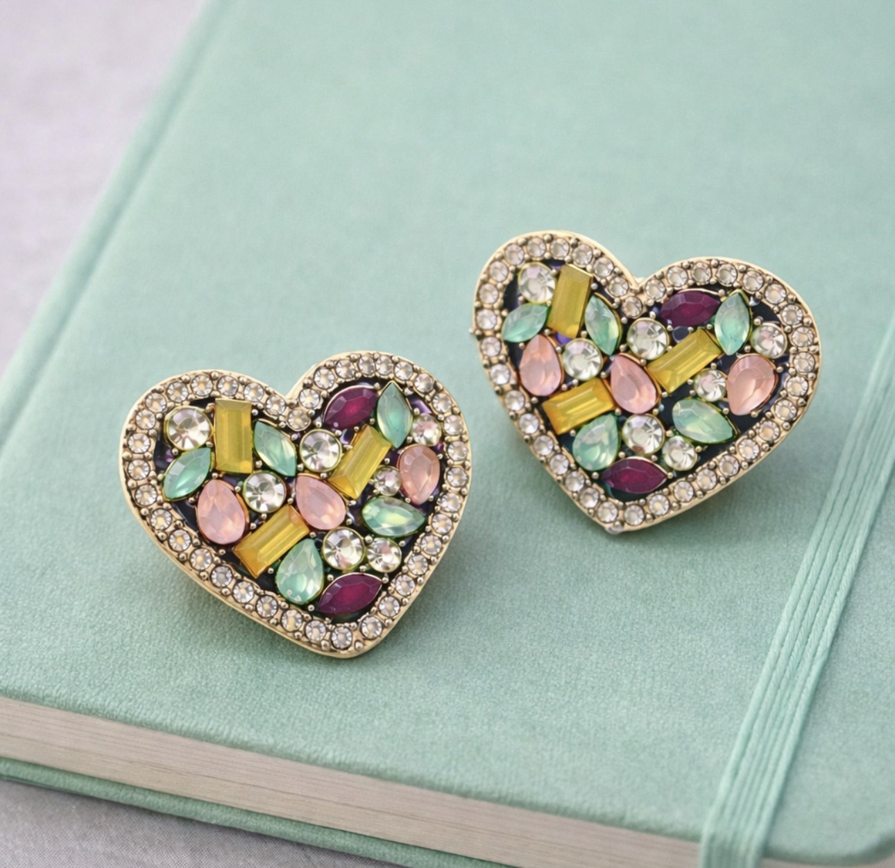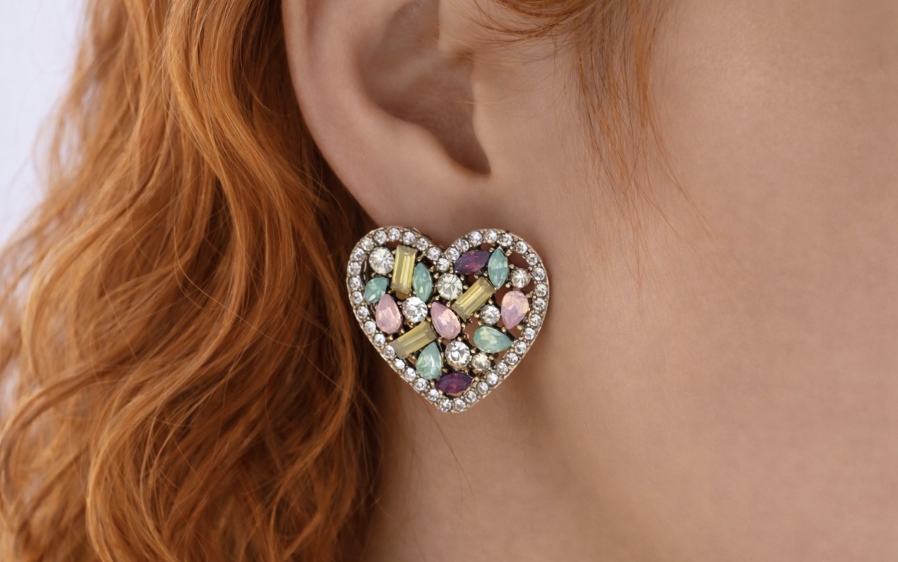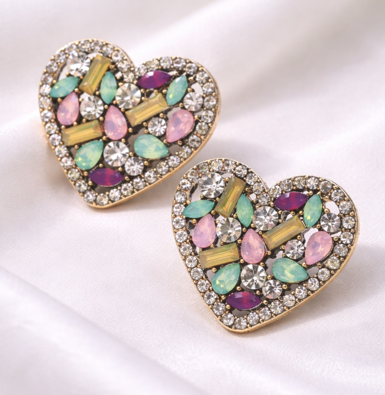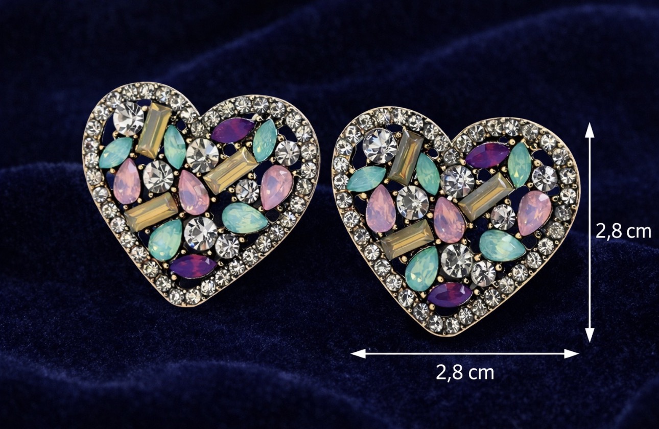 Te kolczyki serca z kolorowymi kryształkami to wyjątkowe połączenie romantycznej formy i biżuteryjnego blasku. Kształt serca został wypełniony misterną kompozycją wielobarwnych kamieni o różnych szlifach, które pięknie odbijają światło i tworzą efekt głębi oraz elegancji.