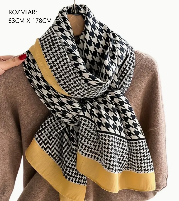 Praktyczność i elegancja: Płaszcz trencz i szalik zapewniają ciepło, kaszkiet chroni przed wiatrem, a geometryczne kolczyki dodają odrobinę wyrazistości. Dzięki neutralnym kolorom – czerni, bieli i żółci – całość jest bardzo uniwersalna, pasując do wielu okazji, od codziennych obowiązków po spotkania ze znajomymi czy wyjścia na miasto.