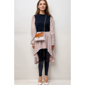 • Elegancka torebka: Mała, urocza torebka w pepitkę to doskonały wybór do tej stylizacji. Niezbyt duża, ale wystarczająca, by pomieścić wszystkie niezbędne drobiazgi, stanowi ciekawy element, który podkreśla klasyczny charakter zestawu. Dodatkowo, torebka w takim wzorze pasuje do większości innych elementów, w tym do chusty, tworząc spójną całość.