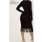 Długa czarna dopasowana dzianinowa sukienka – prosta i klasyczna, ale z wyrazistym akcentem w postaci frędzli na dole. Dzianinowy materiał zapewnia wygodę, jednocześnie podkreślając sylwetkę, a frędzle dodają ruchu i lekkości.
