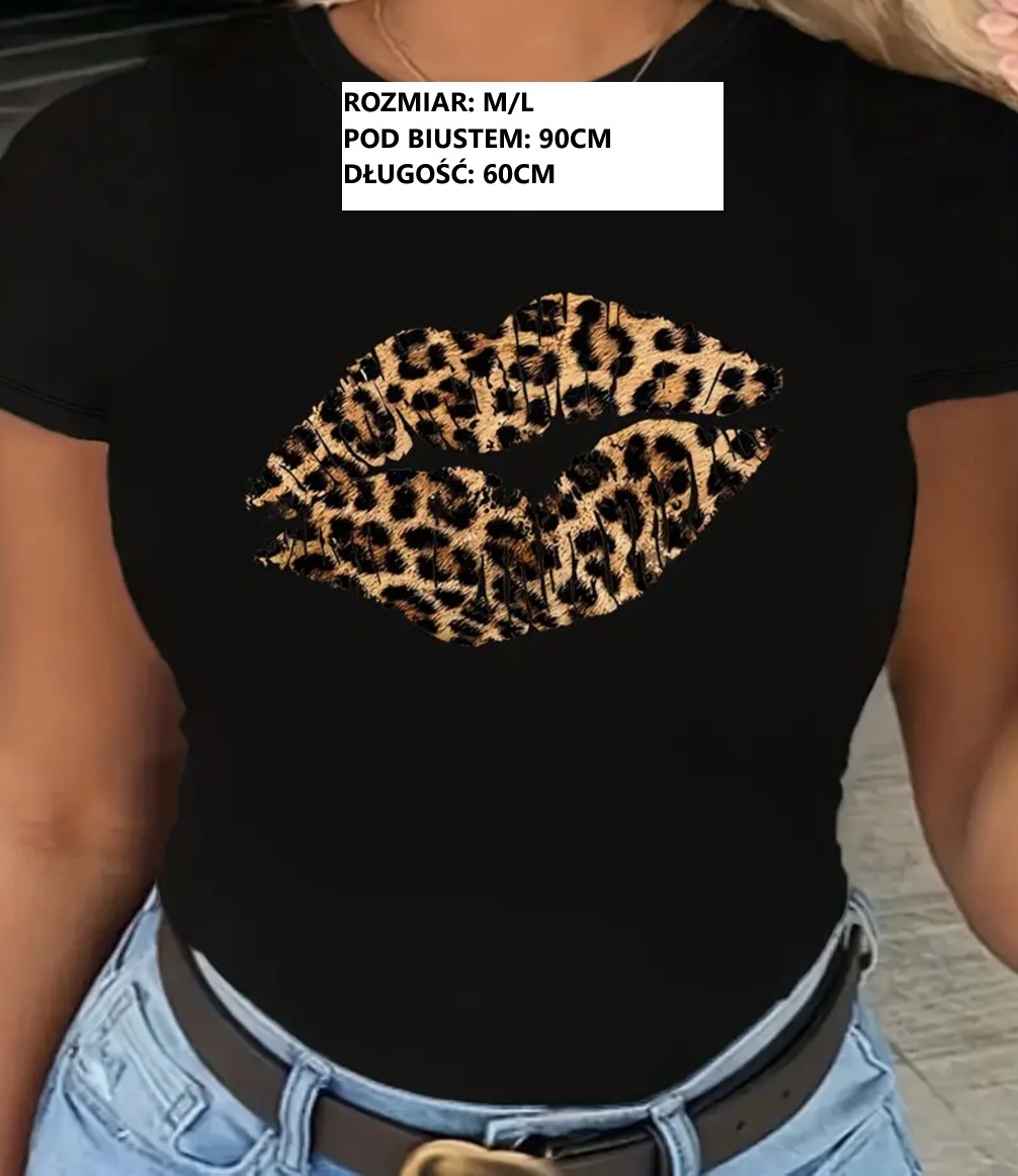 Czarny T-shirt z motywem kobiecych ust w panterce – klasyczny fason koszulki z nadrukiem, który dodaje charakteru i nawiązuje do motywu przewodniego stylizacji. To świetne połączenie sportowego luzu i modowego akcentu.