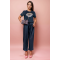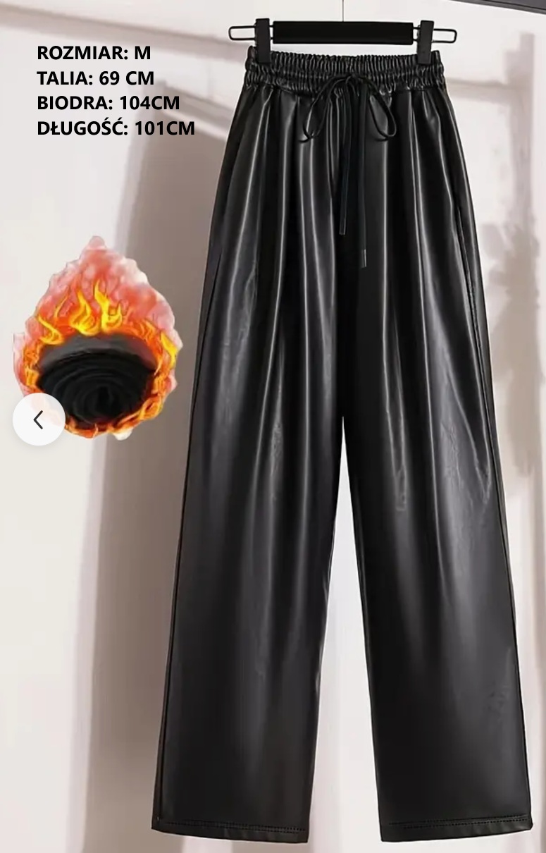 Ekoskórzane spodnie – wiązane w pasie dla komfortu i dopasowania, z luźną, prostą nogawką, które zapewniają swobodę ruchów. Ekoskóra dodaje zestawowi wyrazistości i odrobinę rockowego stylu.
