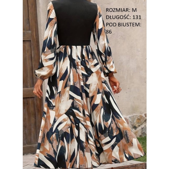 Sukienka: Długa, zwiewna sukienka w stonowanych kolorach, co nadaje jej lekkości i romantyzmu. Wszyty czarny gorset dodaje struktury i podkreśla sylwetkę.