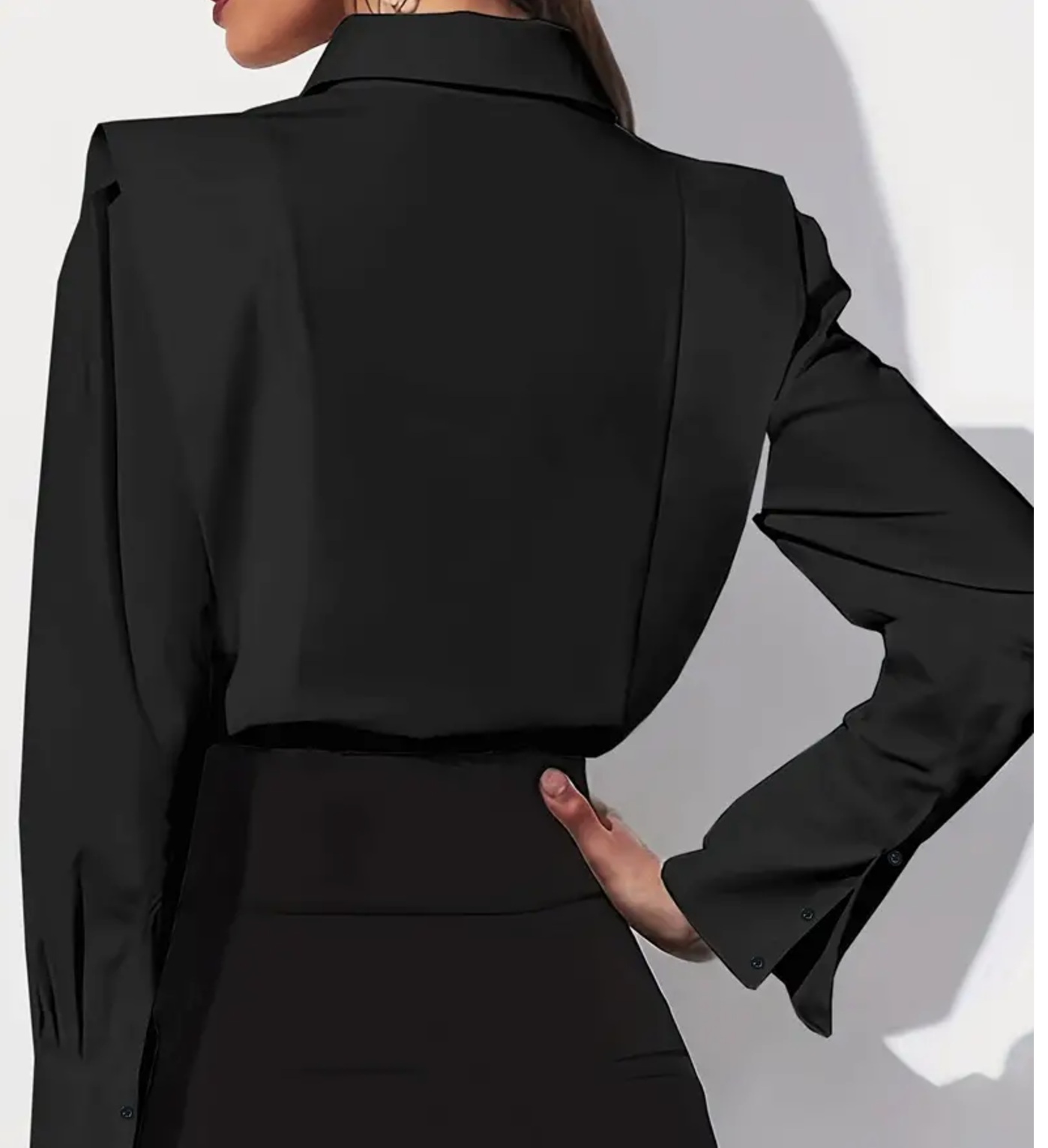 Czarna klasyczna koszula – o długim rękawie, z ciekawym wykończeniem wzdłuż ramion (delikatną plisą). Klasyczna baza o niebanalnym detalu nadaje całości elegancji i lekkości.