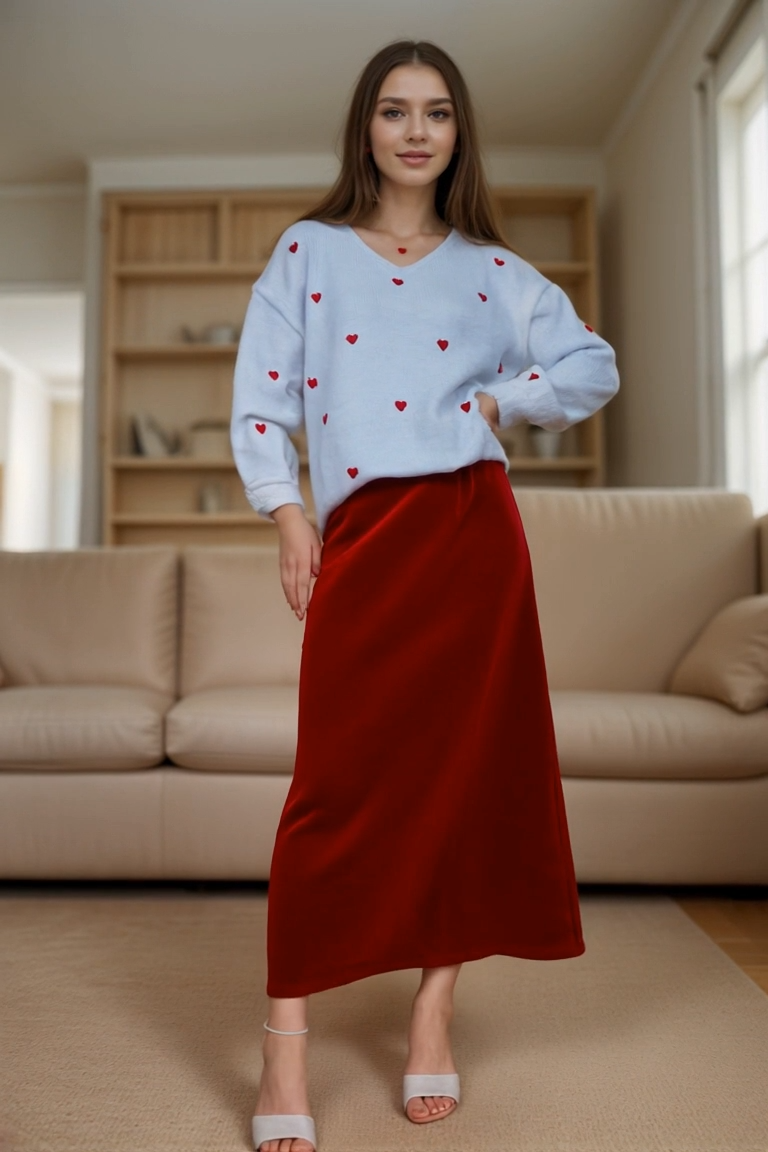 spodnica na wyjscie-spodnica elegancka-spodnica czerwona-spodnica welurowa-bialy sweterek-sweterek w serca