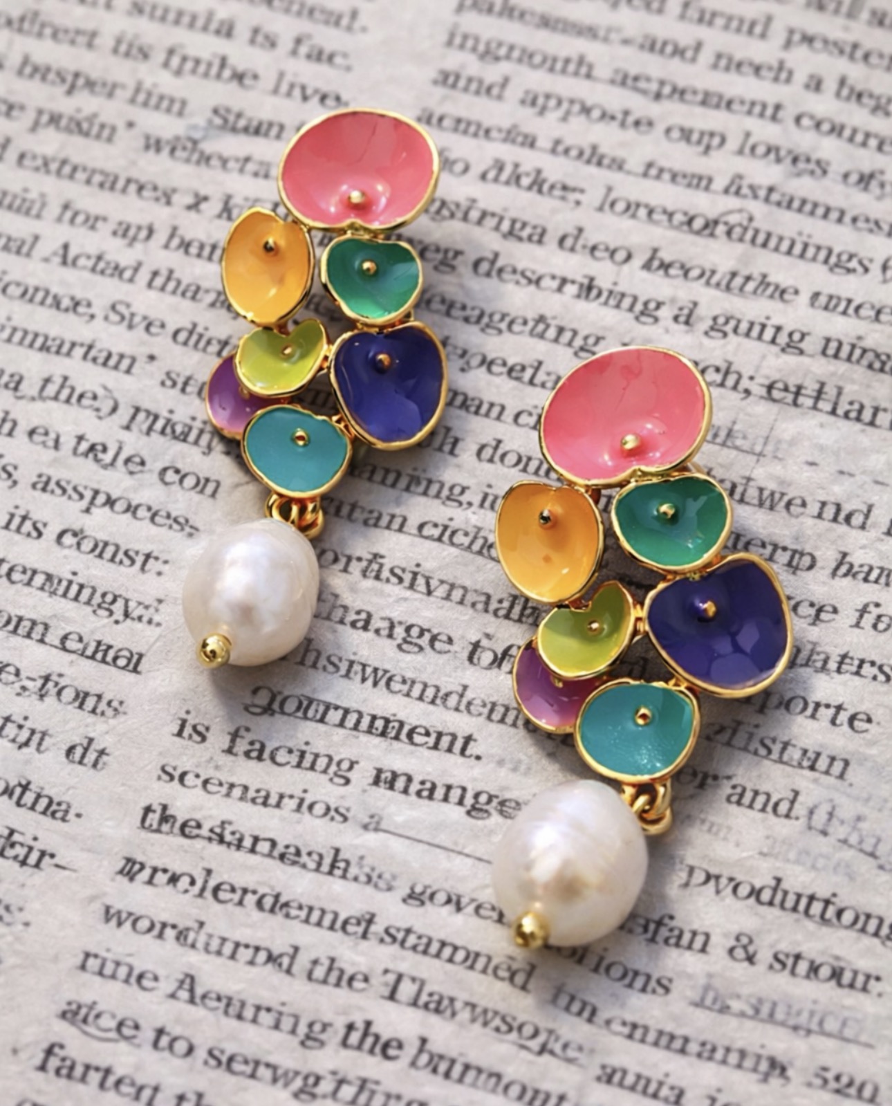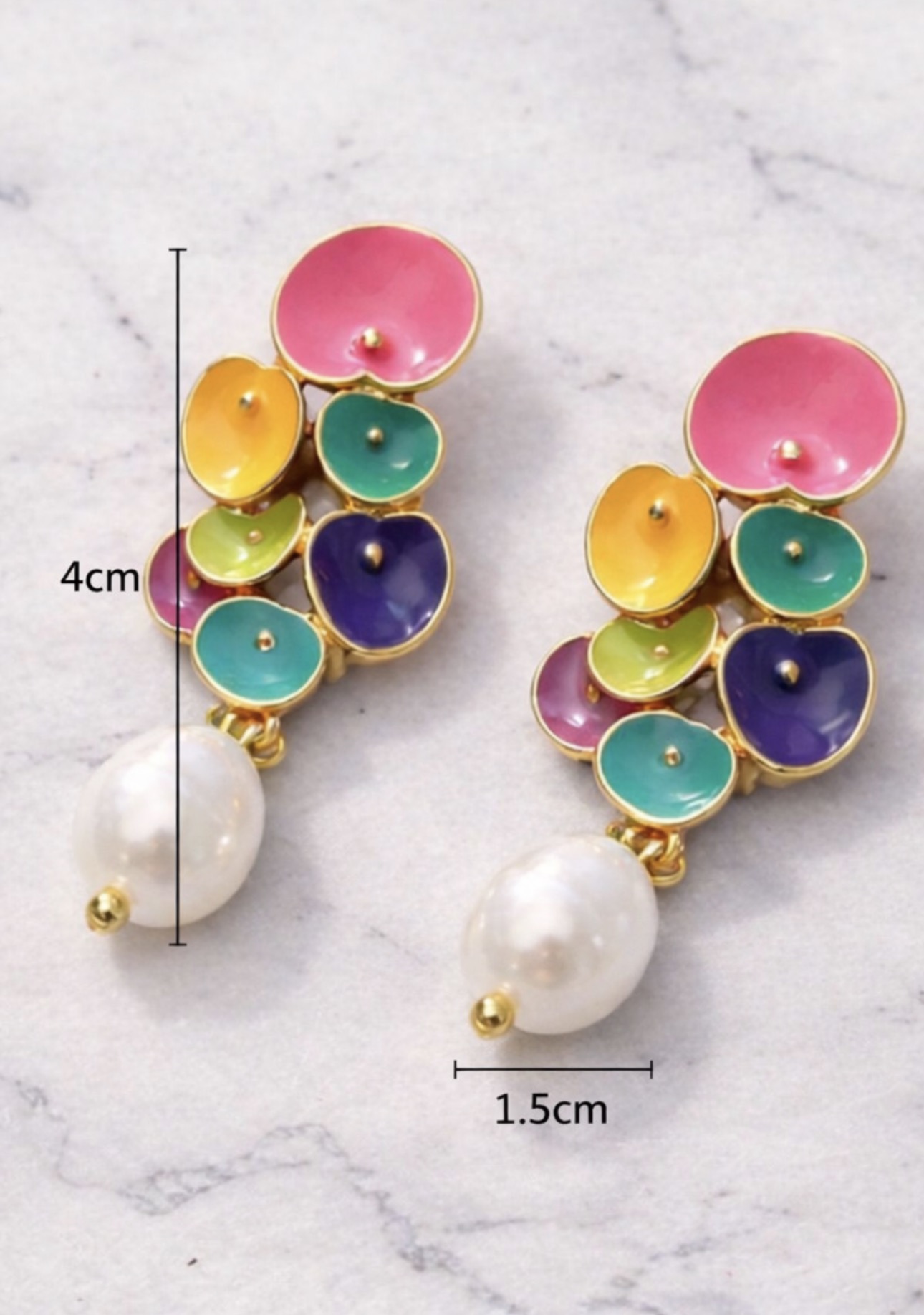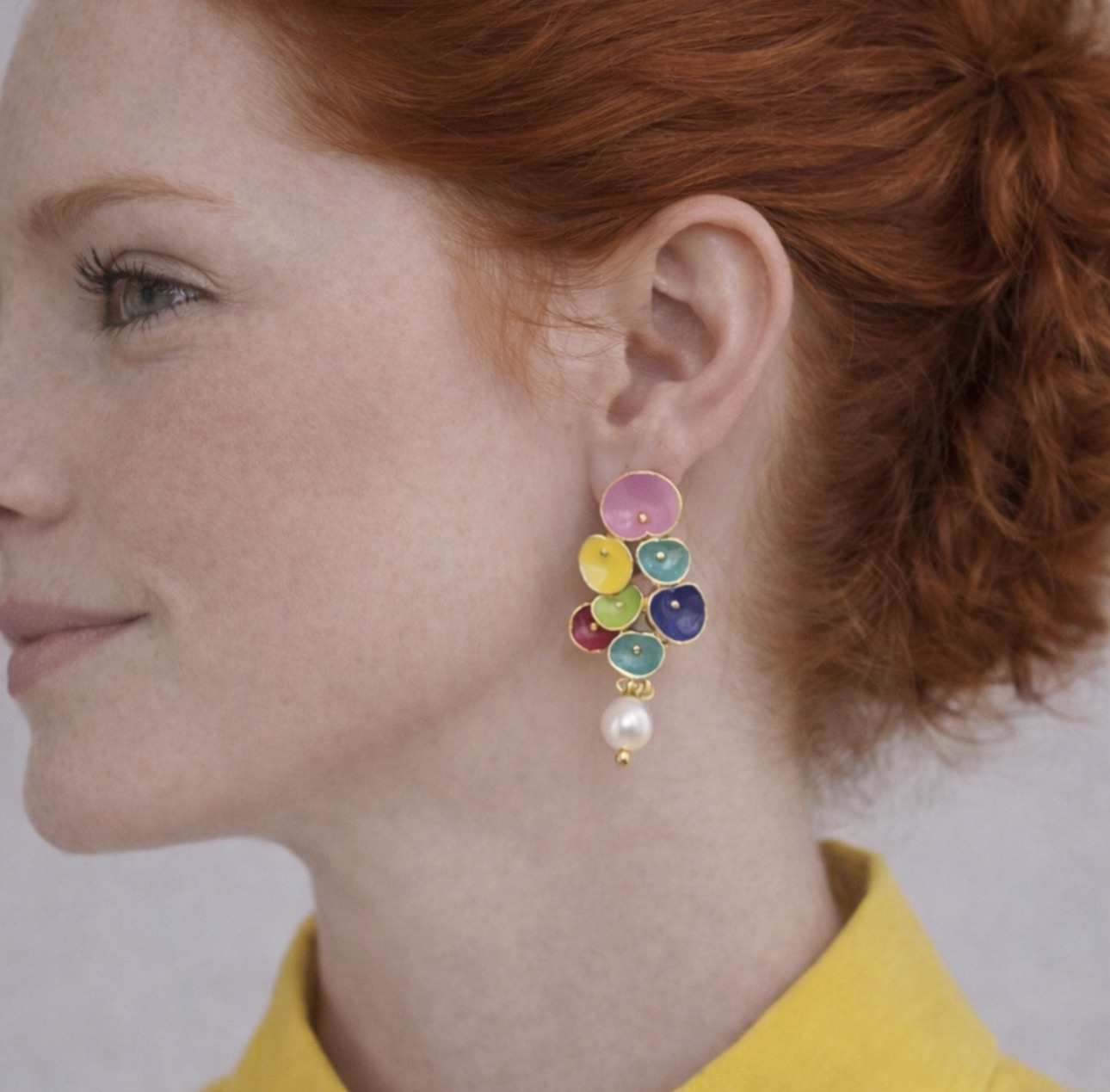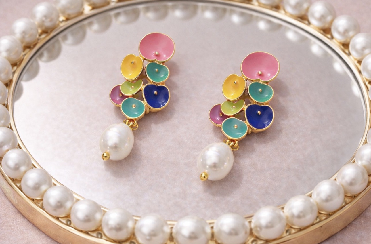 Te wyjątkowe kolczyki wkręty to połączenie radosnej kolorystyki, jubilerskiej precyzji i ponadczasowej klasy. Delikatne, emaliowane elementy w odcieniach różu, żółci, turkusu, zieleni i granatu tworzą harmonijną kompozycję, którą wieńczy elegancka perła o subtelnym połysku. Złota oprawa dodaje całości luksusowego charakteru i pięknie podkreśla kolory.