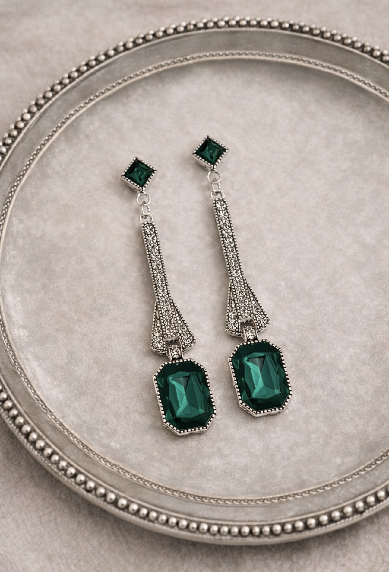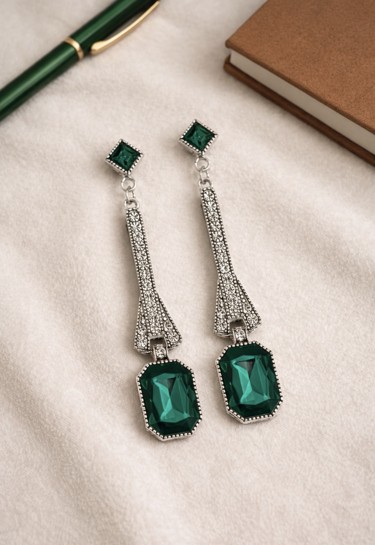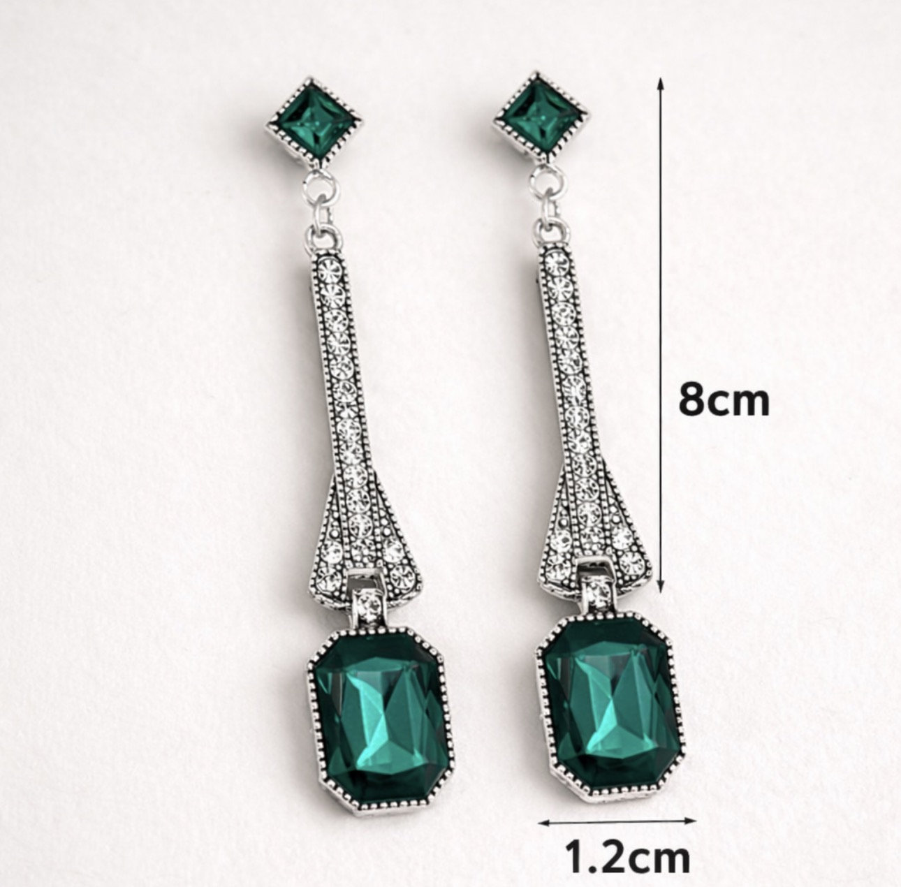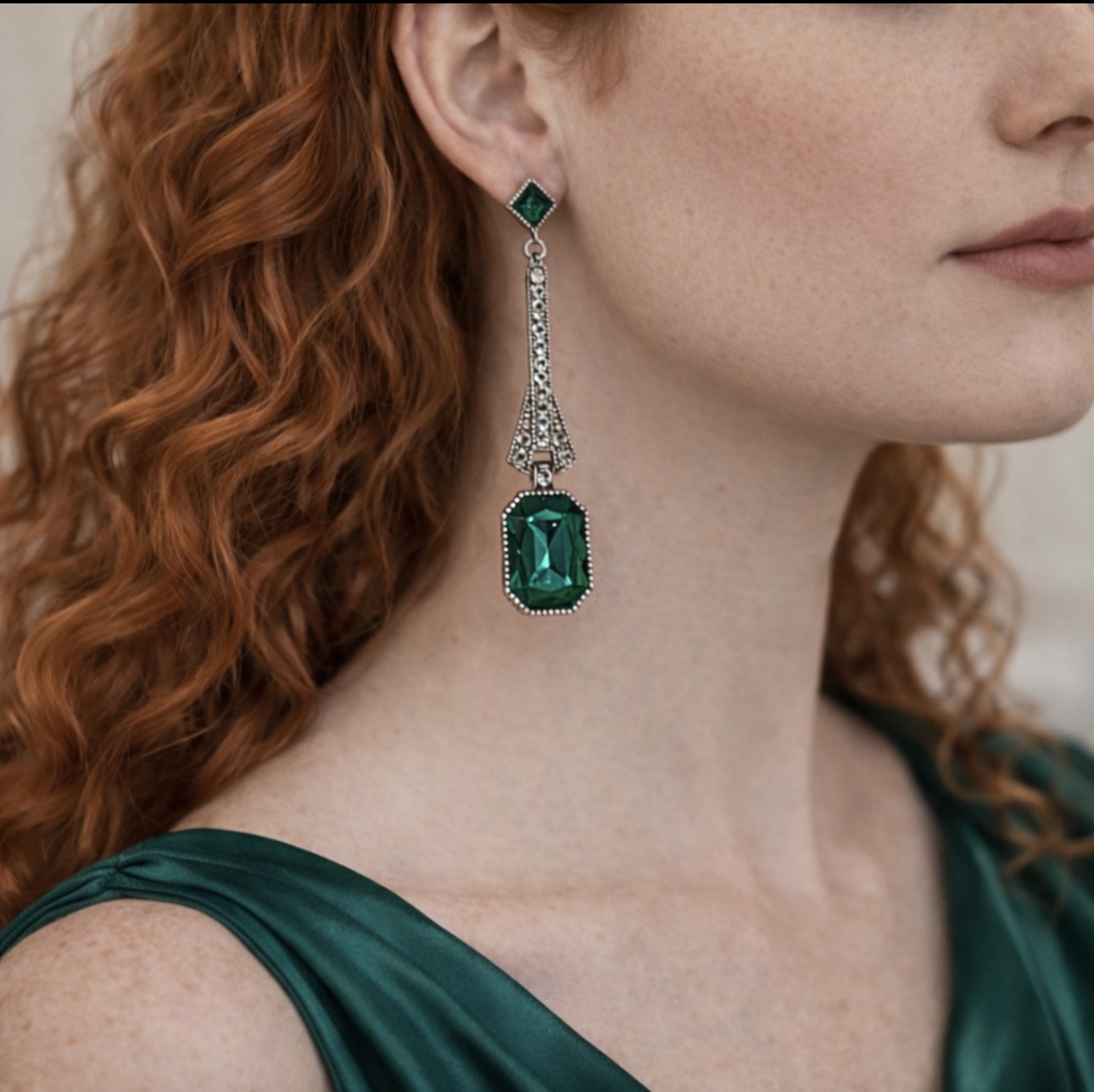 Wyjątkowe, luksusowe kolczyki o eleganckiej formie inspirowanej stylem art déco, stworzone z myślą o kobietach ceniących ponadczasową klasę i wyraziste detale. Centralnym punktem są głęboko zielone kryształy o szlifie prostokątnym, które pięknie odbijają światło i nadają biżuterii szlachetnego charakteru. Smukła, wysmuklająca linia kolczyków została ozdobiona drobnymi, połyskującymi cyrkoniami, tworząc efekt luksusowego blasku przy każdym ruchu.