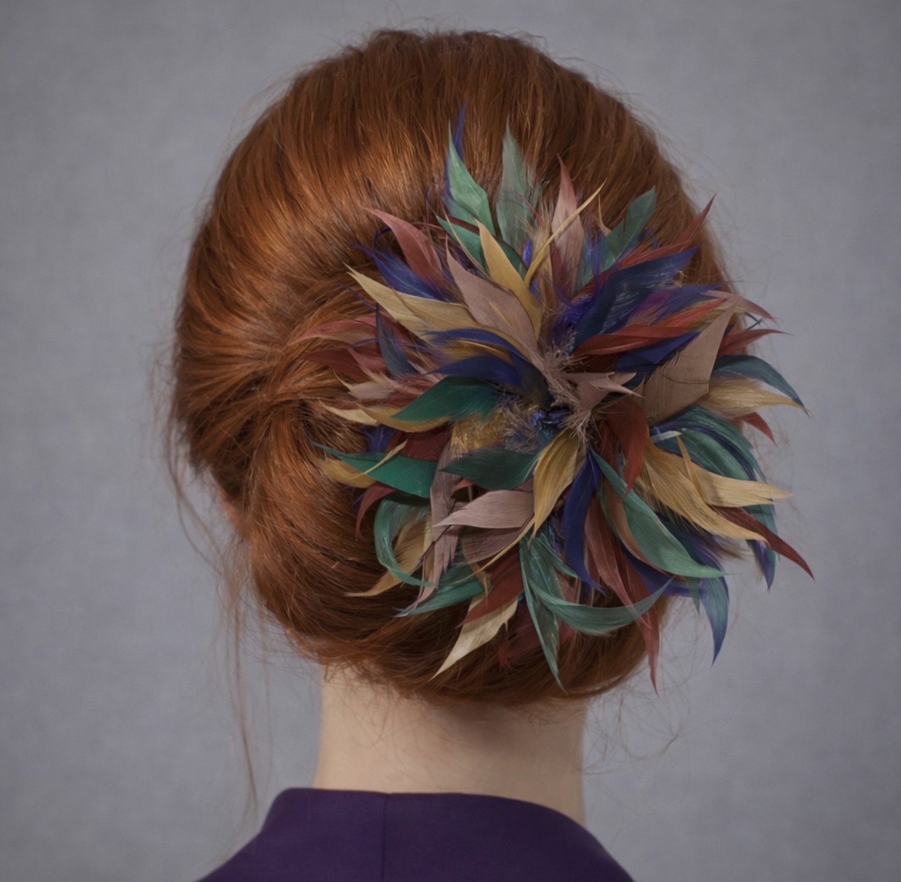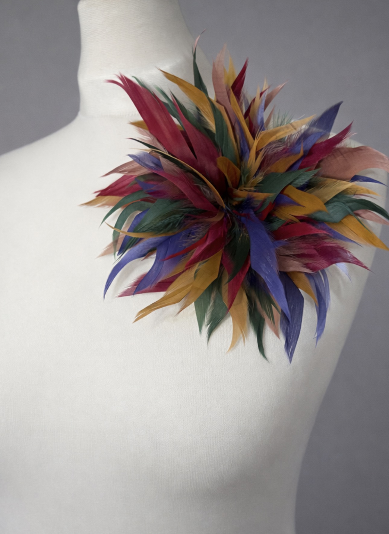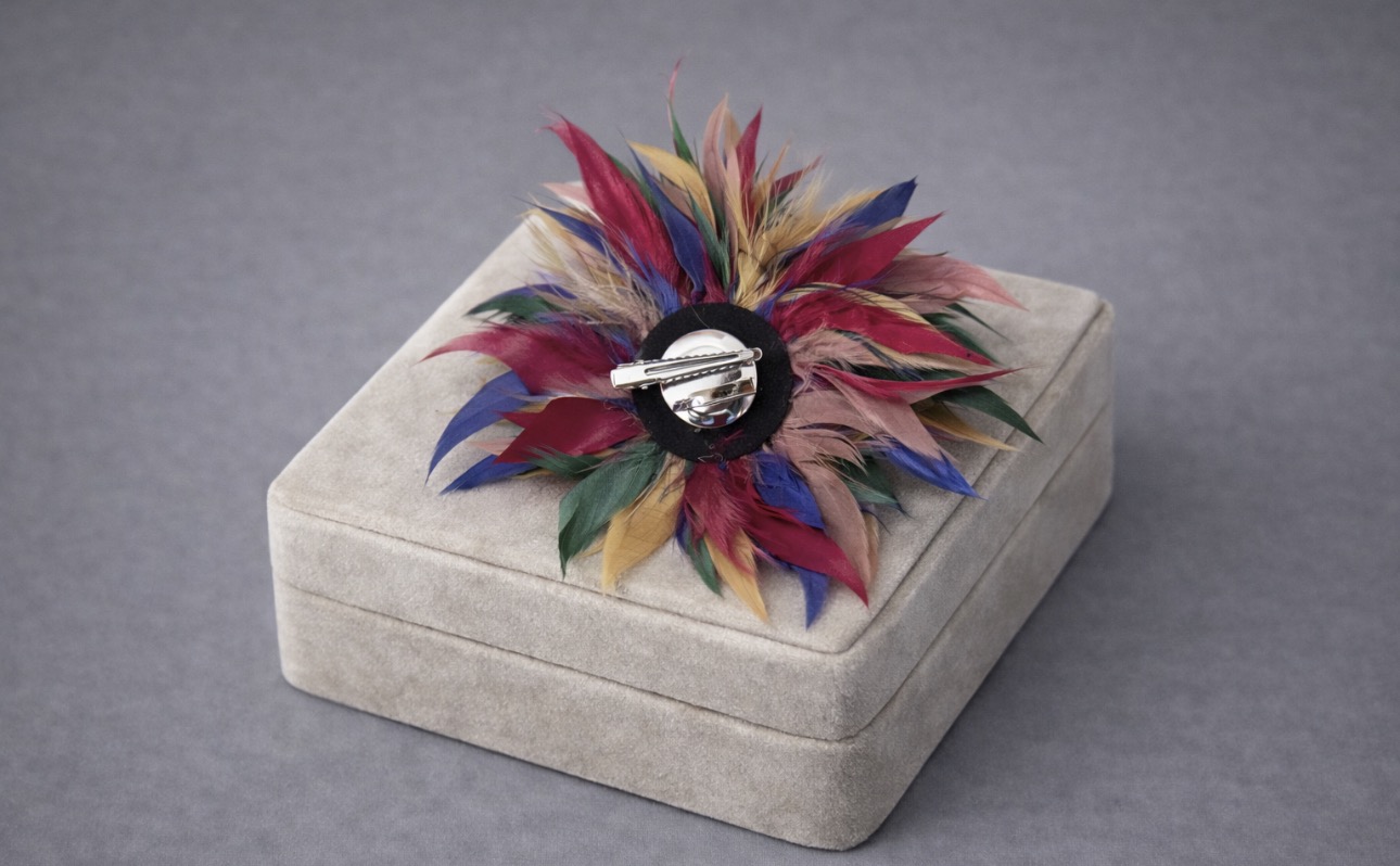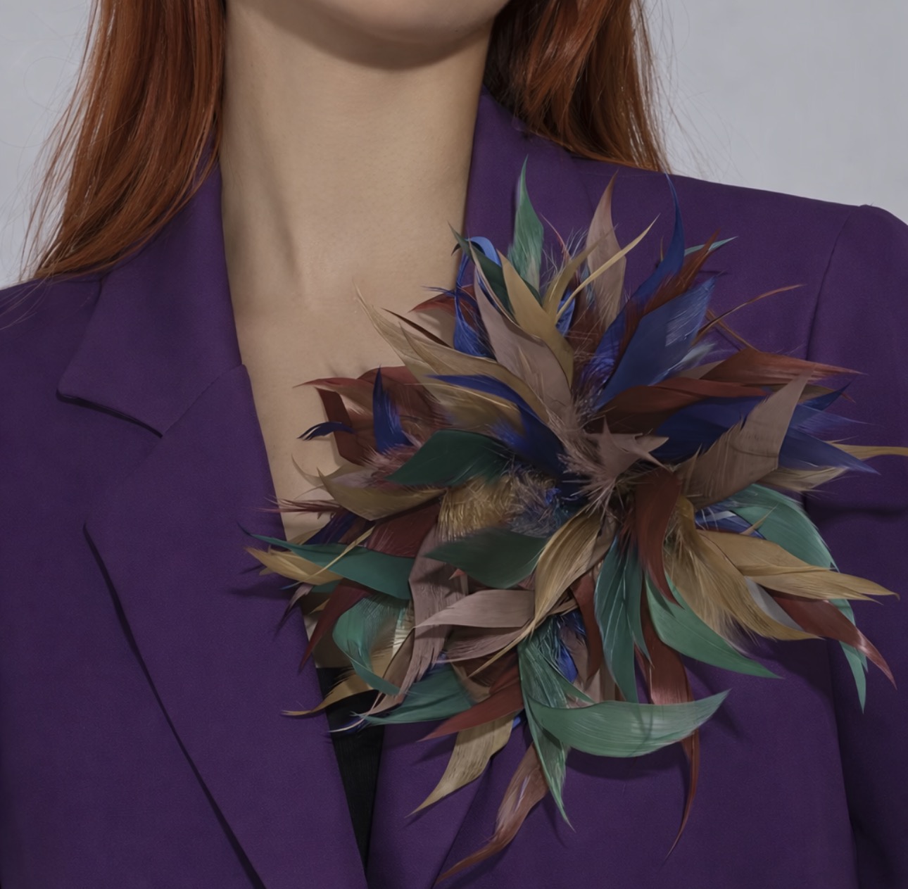 Wyjątkowy dodatek 2w1 w formie broszki i spinki, wykonany z lekkich, wielobarwnych piór ułożonych w efektowną, kwiatową kompozycję. Intensywne odcienie czerwieni, żółci, zieleni i niebieskiego tworzą dynamiczny, modowy akcent, który natychmiast przyciąga wzrok i nadaje stylizacji oryginalnego charakteru.