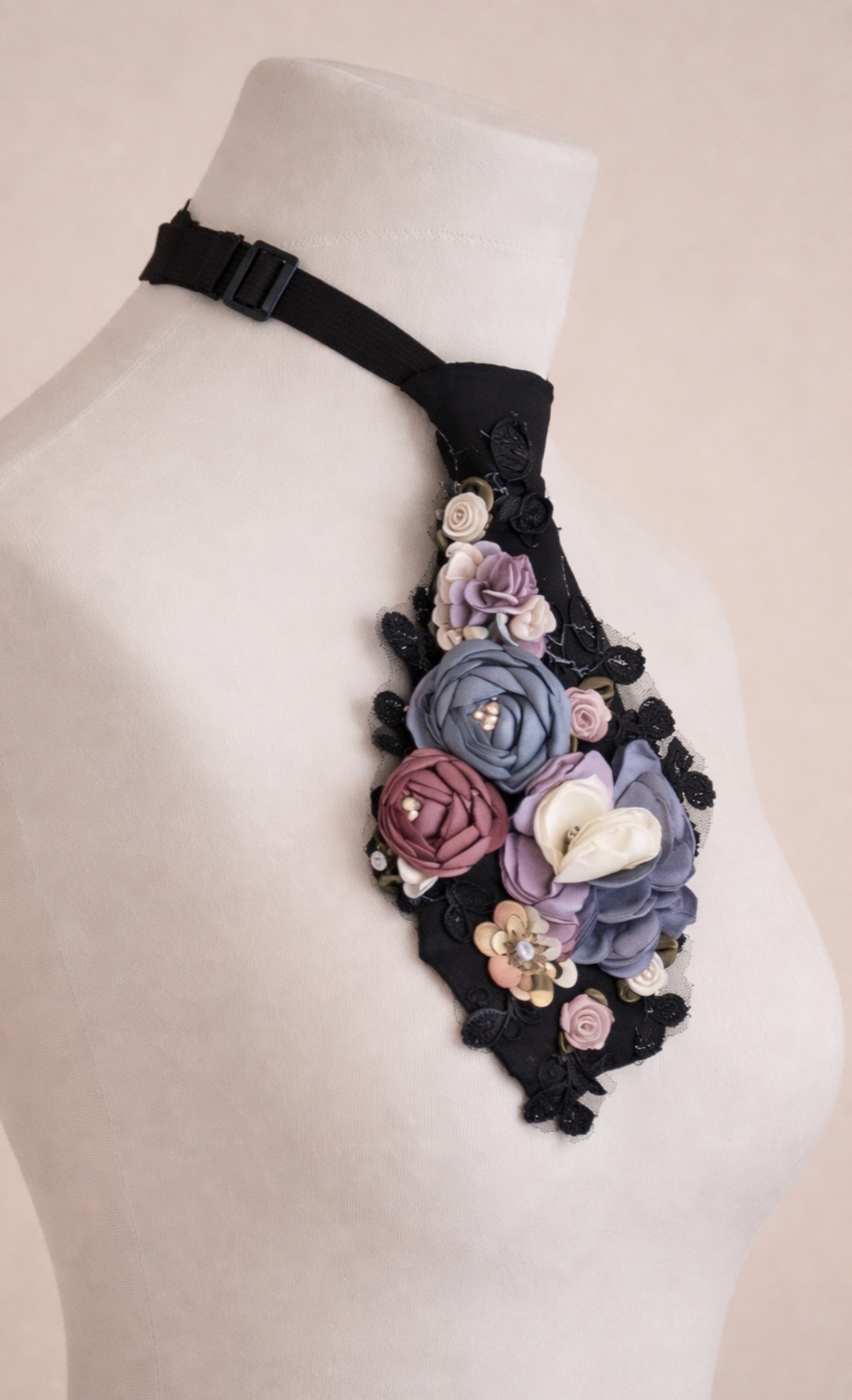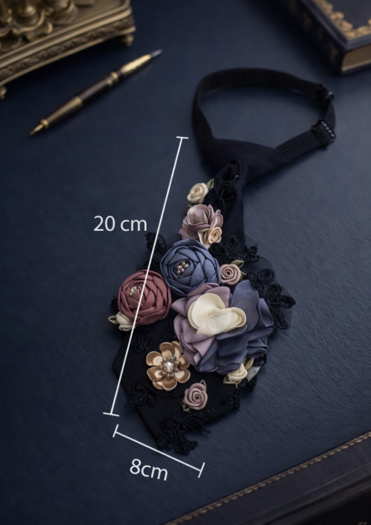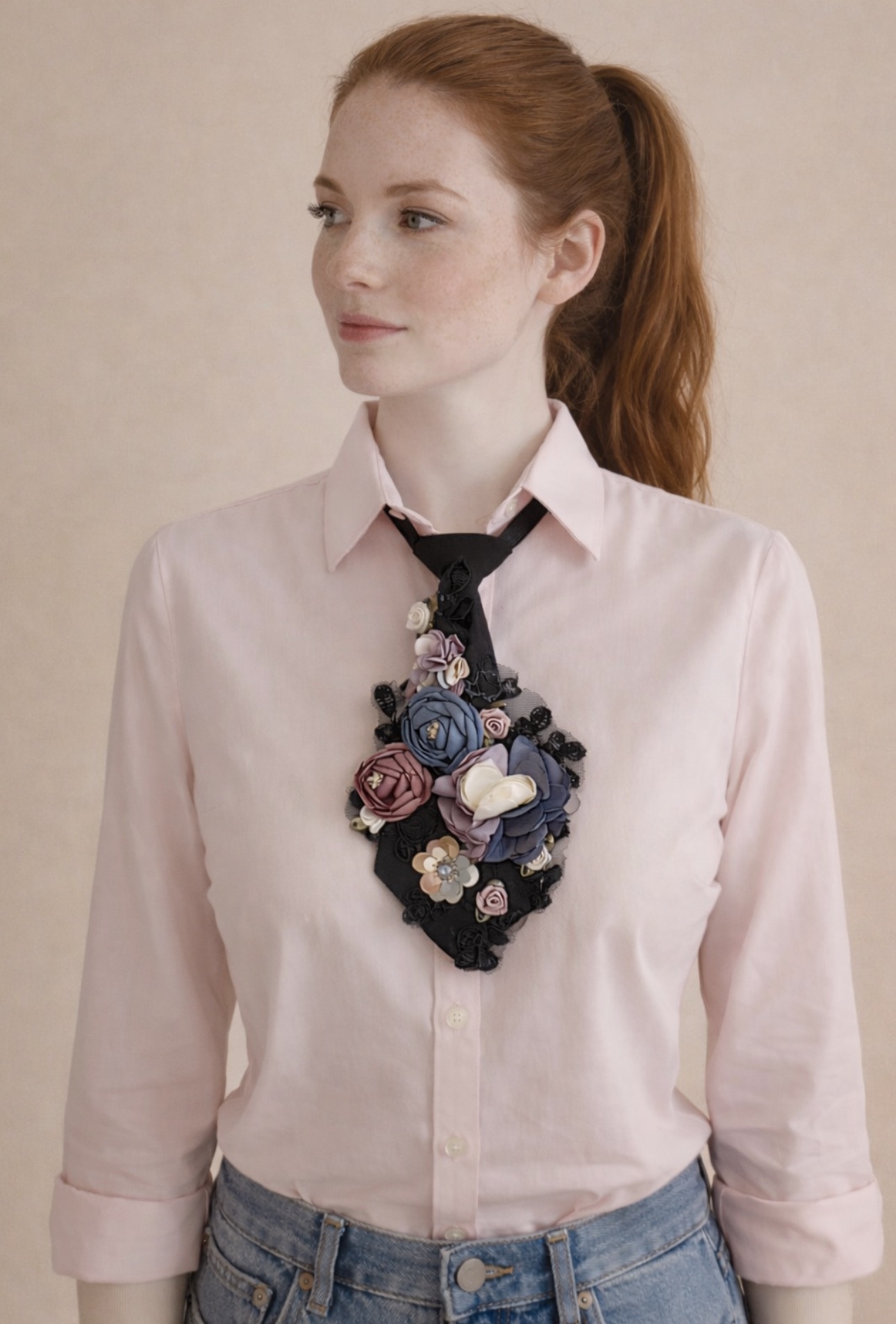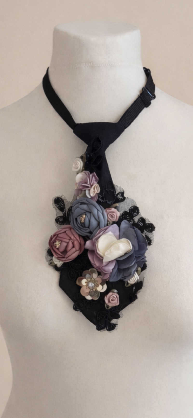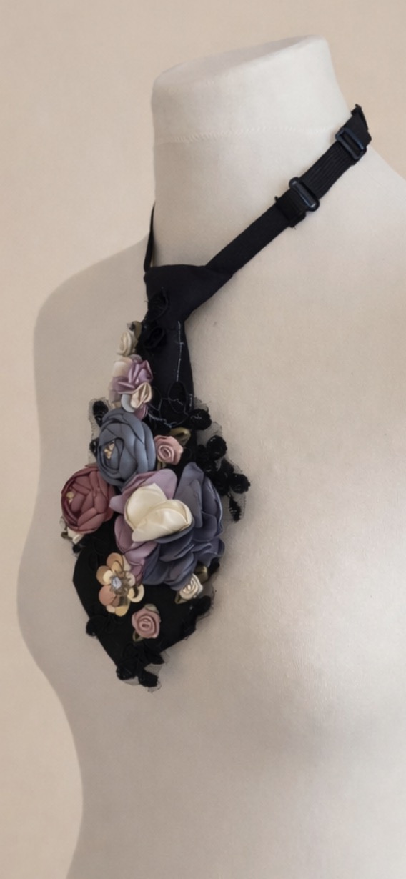 Wyjątkowy krawat w klasycznym czarnym kolorze ozdobiony bogatą kompozycją dekoracyjnych kwiatów 3D. Zestawienie różnych wielkości i faktur tworzy efektowną, biżuteryjną formę, która przyciąga spojrzenia i nadaje stylizacji wyrazistości.