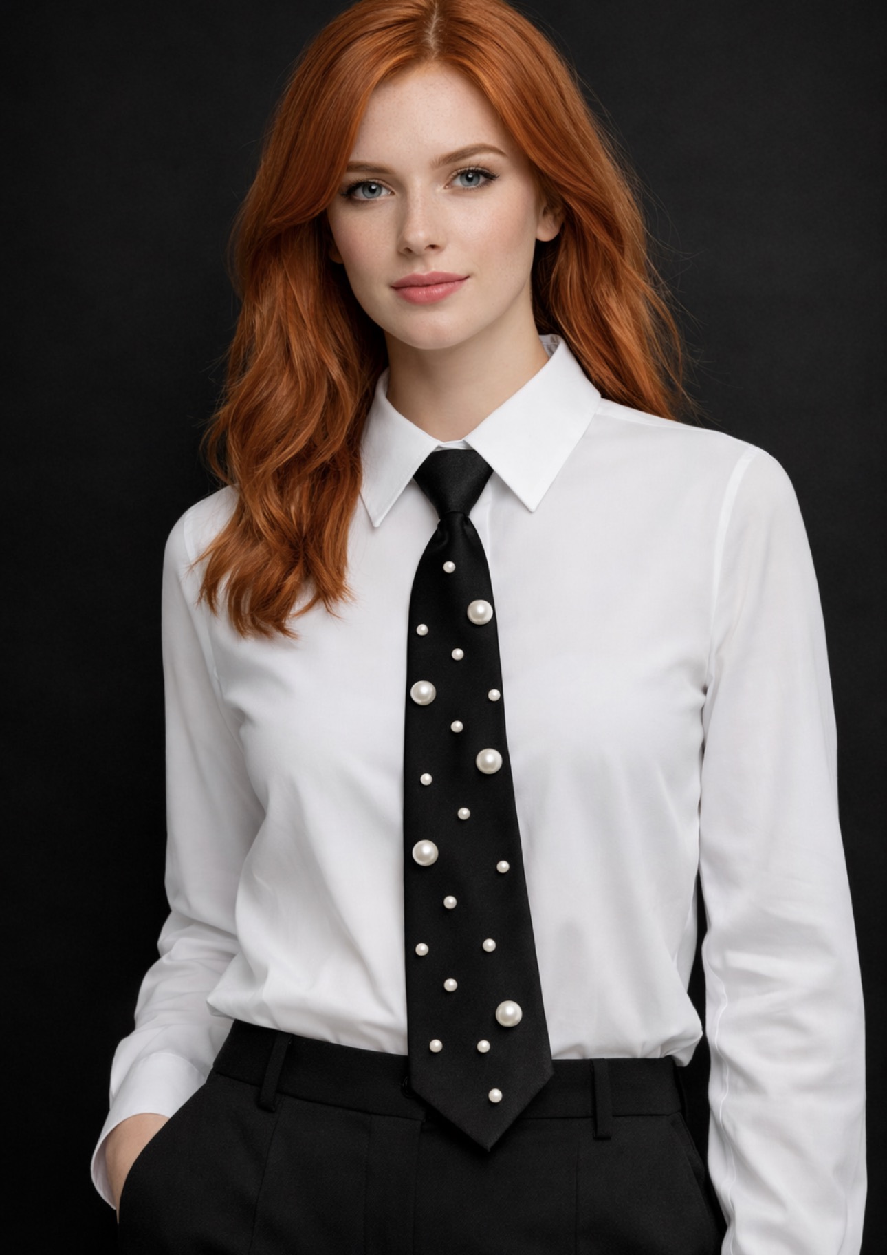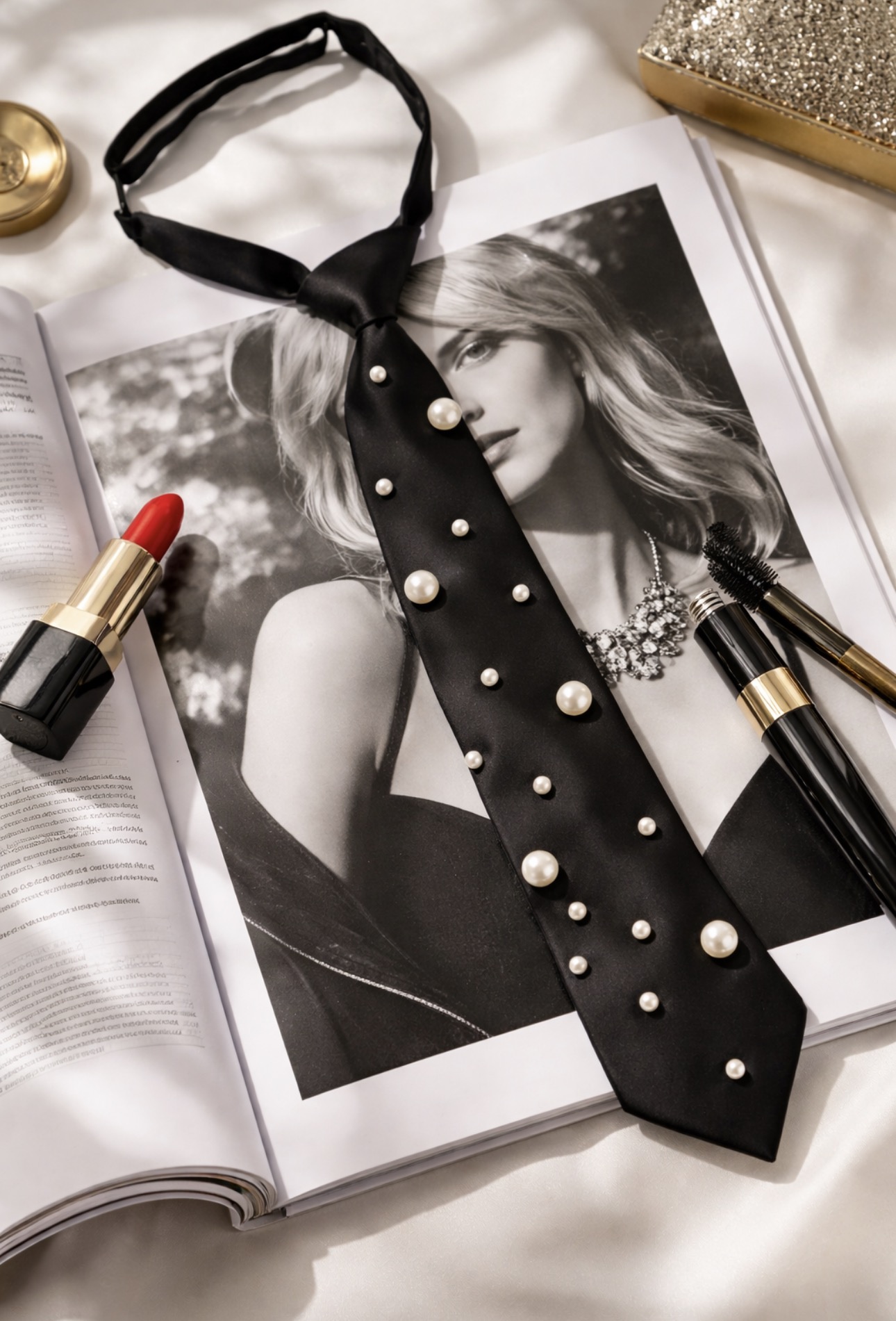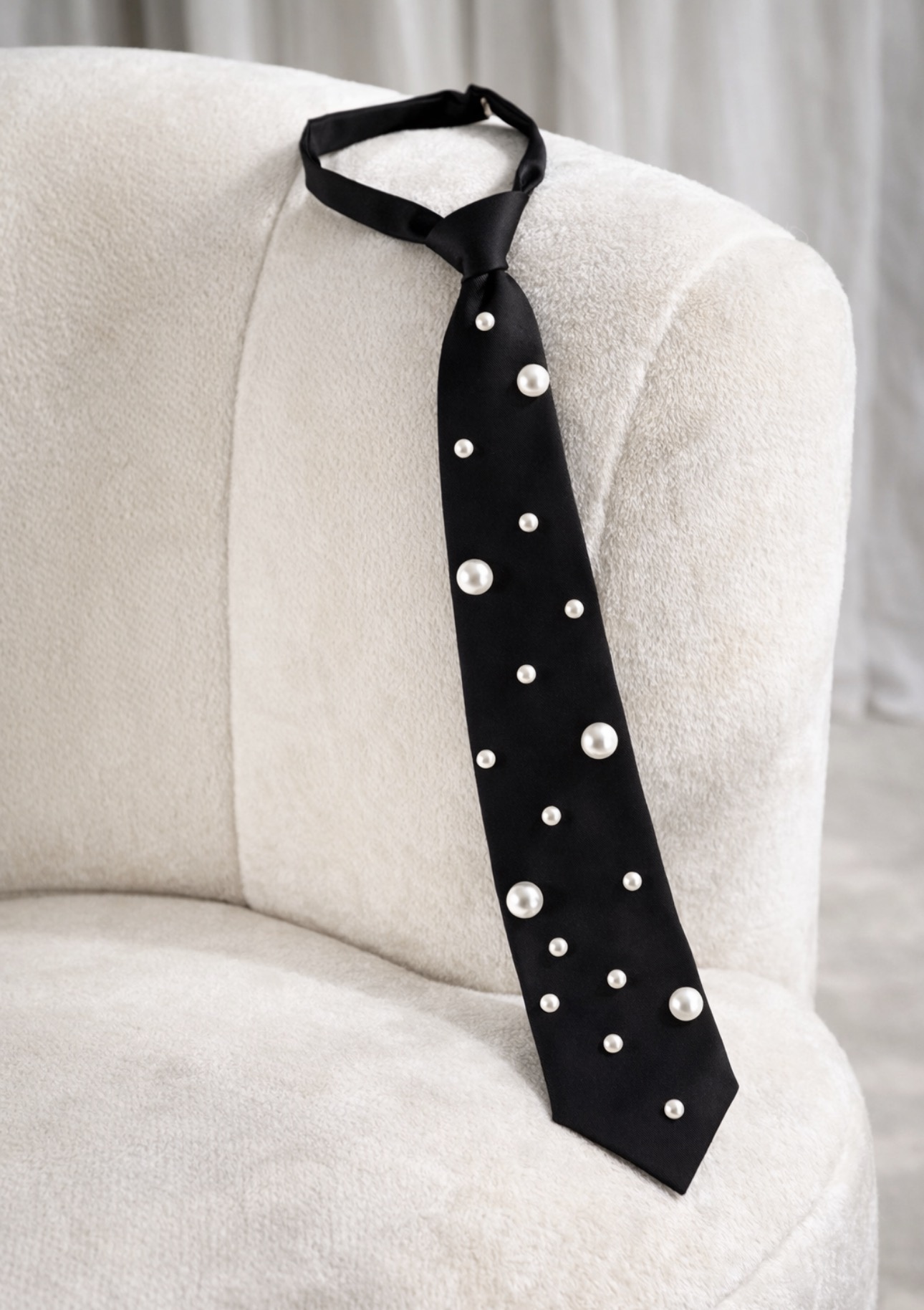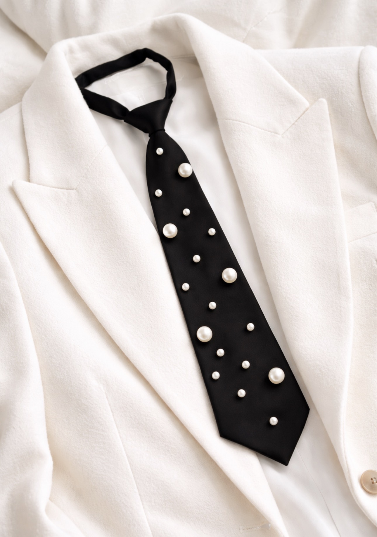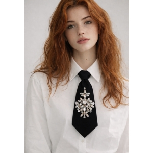 Wyjątkowy czarny krawat ozdobiony subtelnymi perełkami, który łączy klasyczną formę z nowoczesnym, biżuteryjnym detalem. To propozycja dla osób, które cenią elegancję, ale jednocześnie lubią wyróżniać się stylowym akcentem. Krawat doskonale przełamuje minimalistyczne stylizacje i nadaje im modowego charakteru.