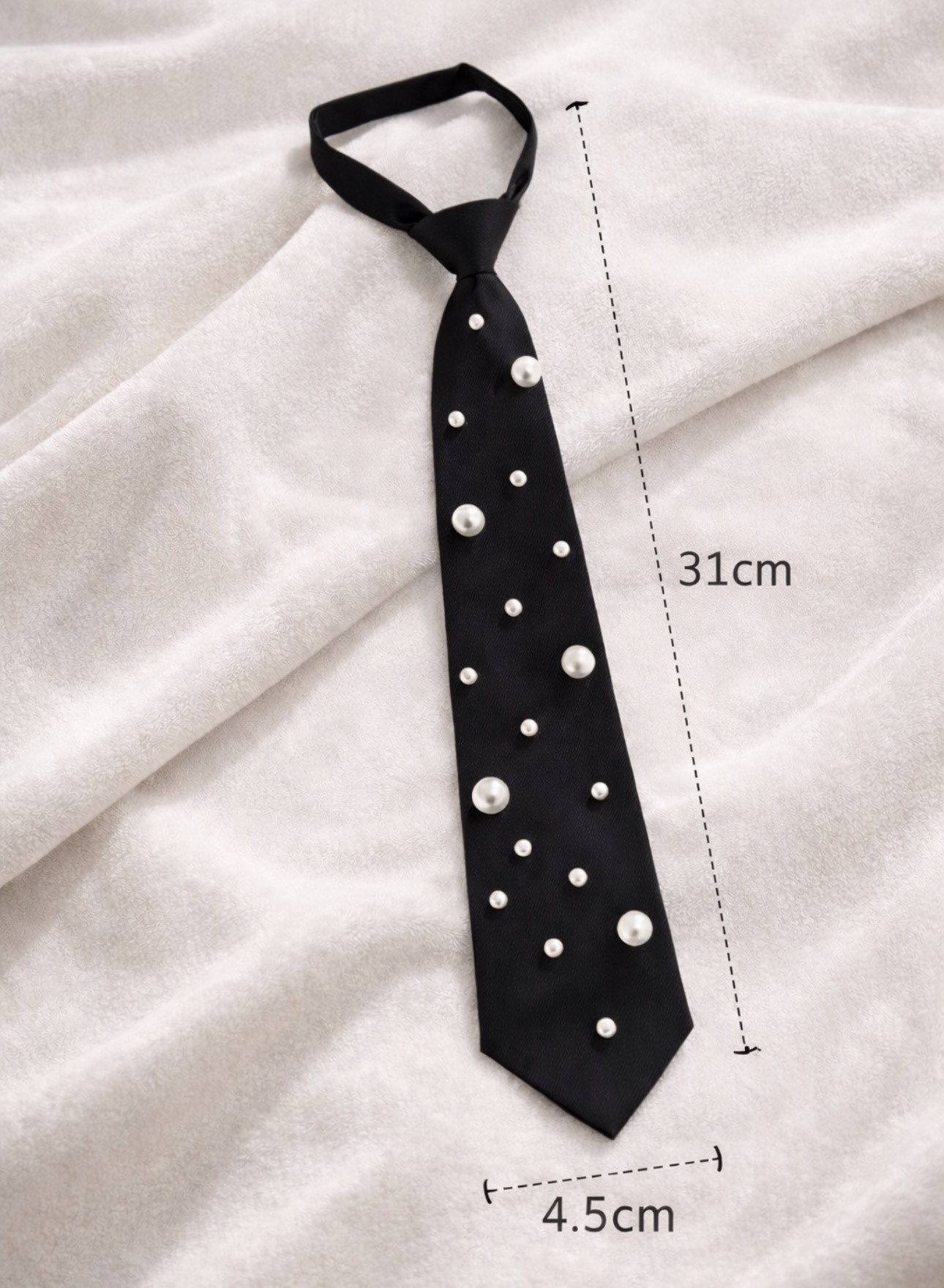 Świetnie sprawdzi się zarówno w stylizacjach formalnych, jak i fashionowych zestawach z koszulą, marynarką czy garniturem. Perełki są równomiernie rozmieszczone, dzięki czemu całość prezentuje się harmonijnie i bardzo estetycznie.