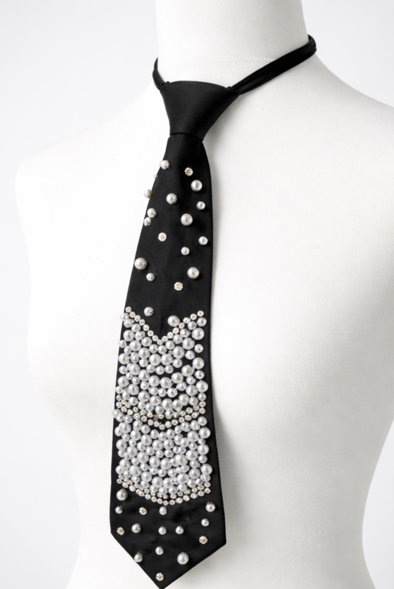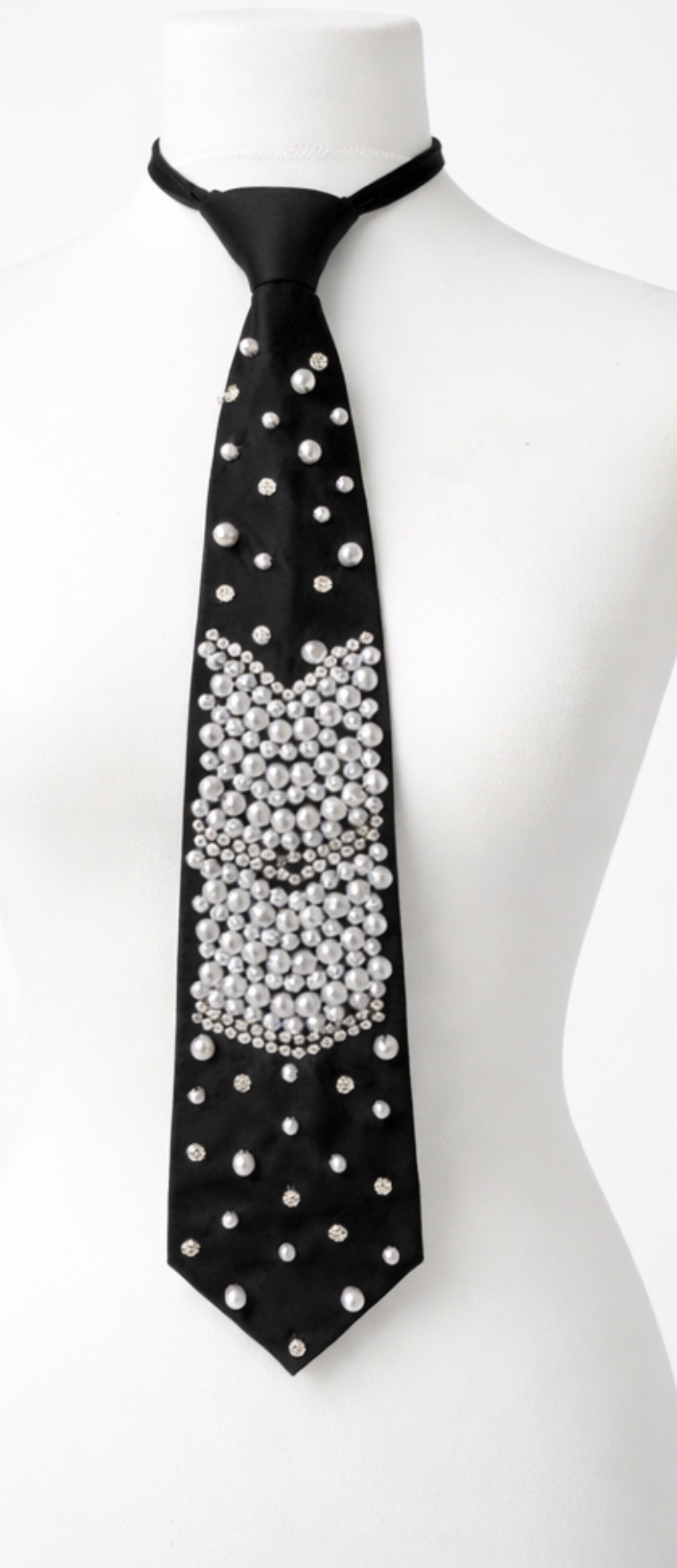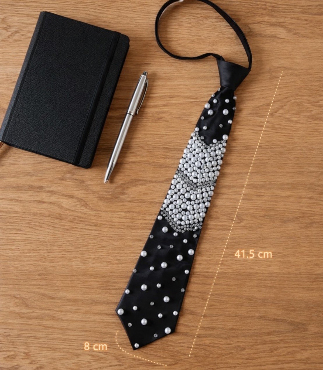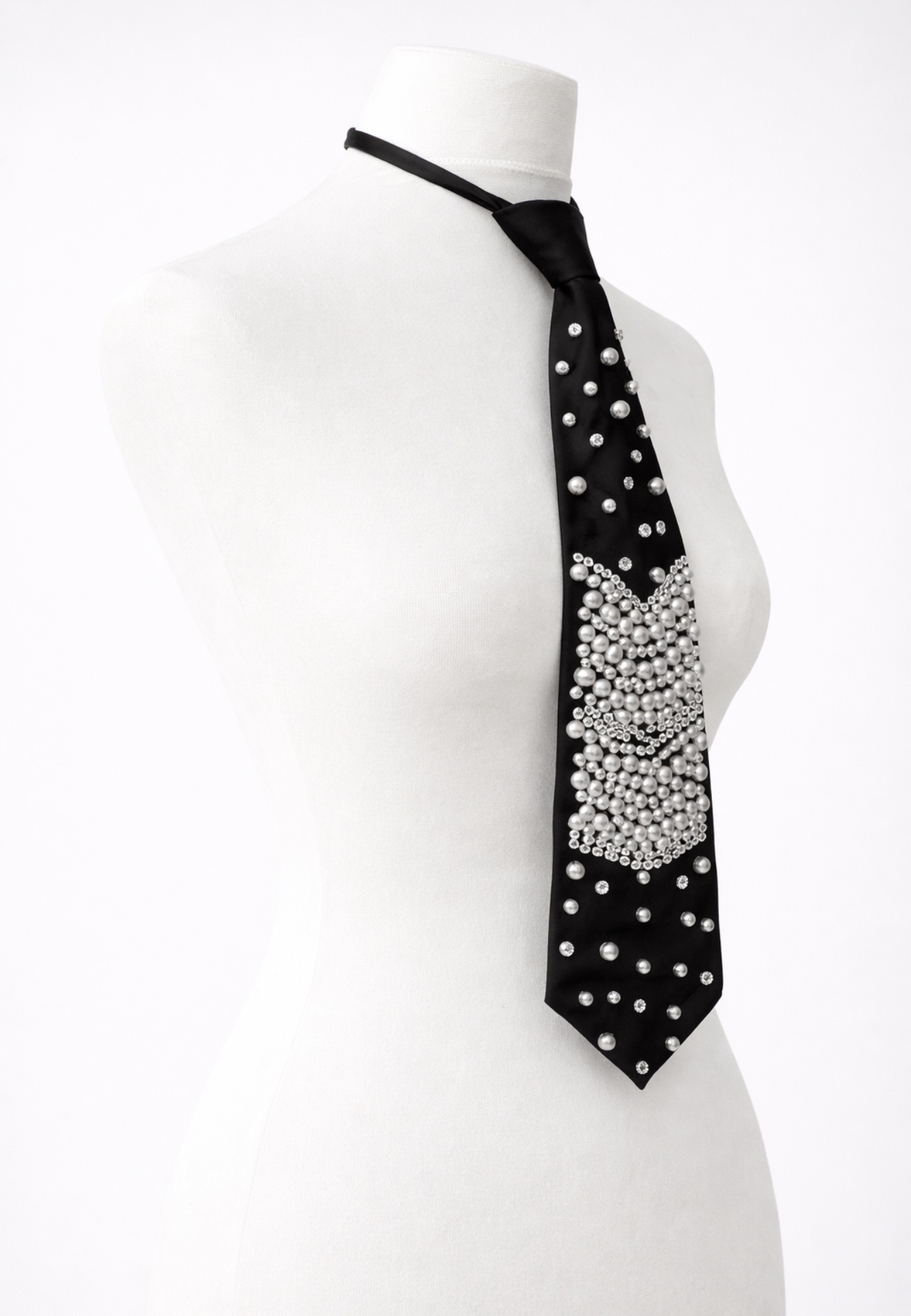 Perłowa aplikacja nadaje stylizacji luksusowy charakter