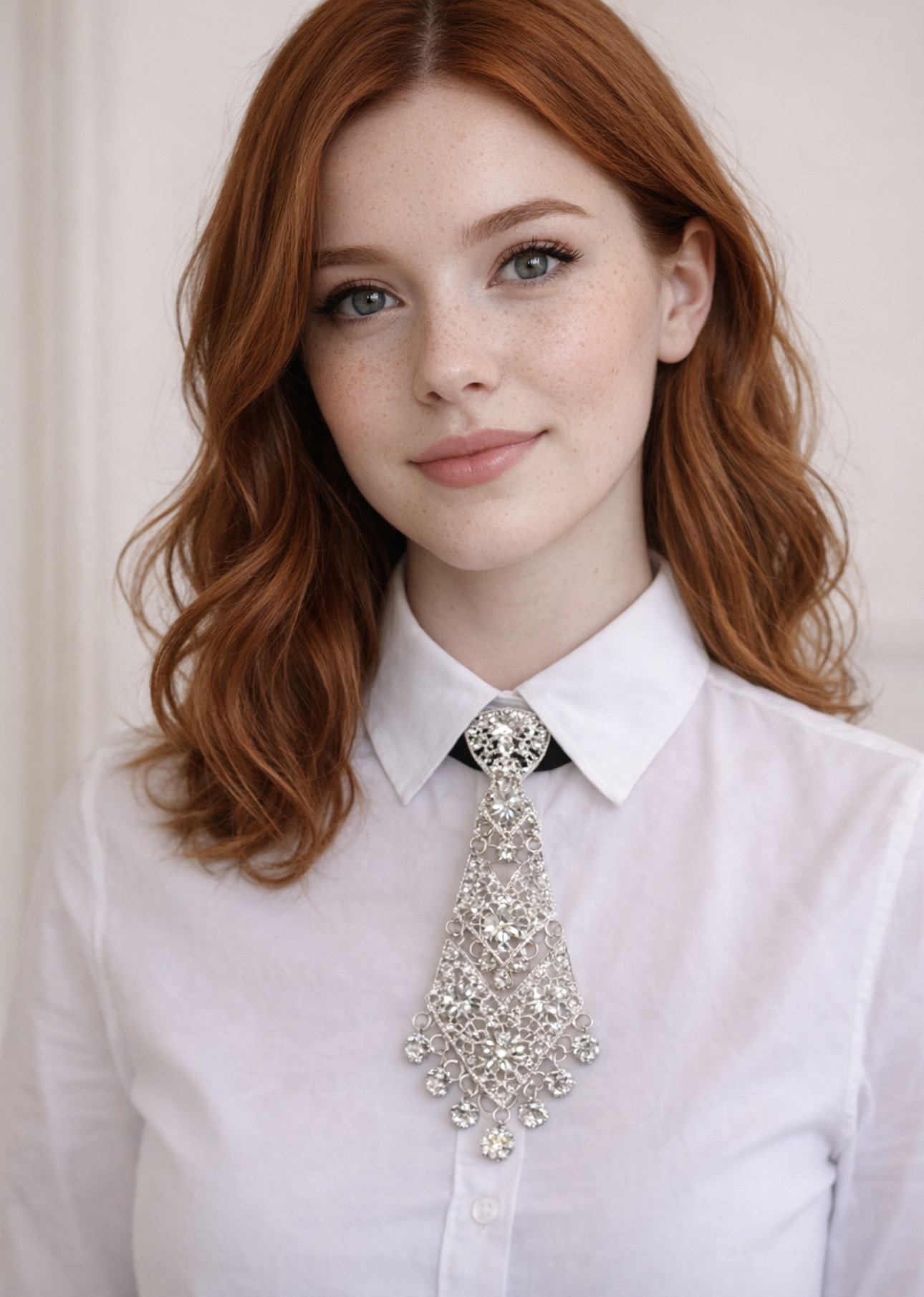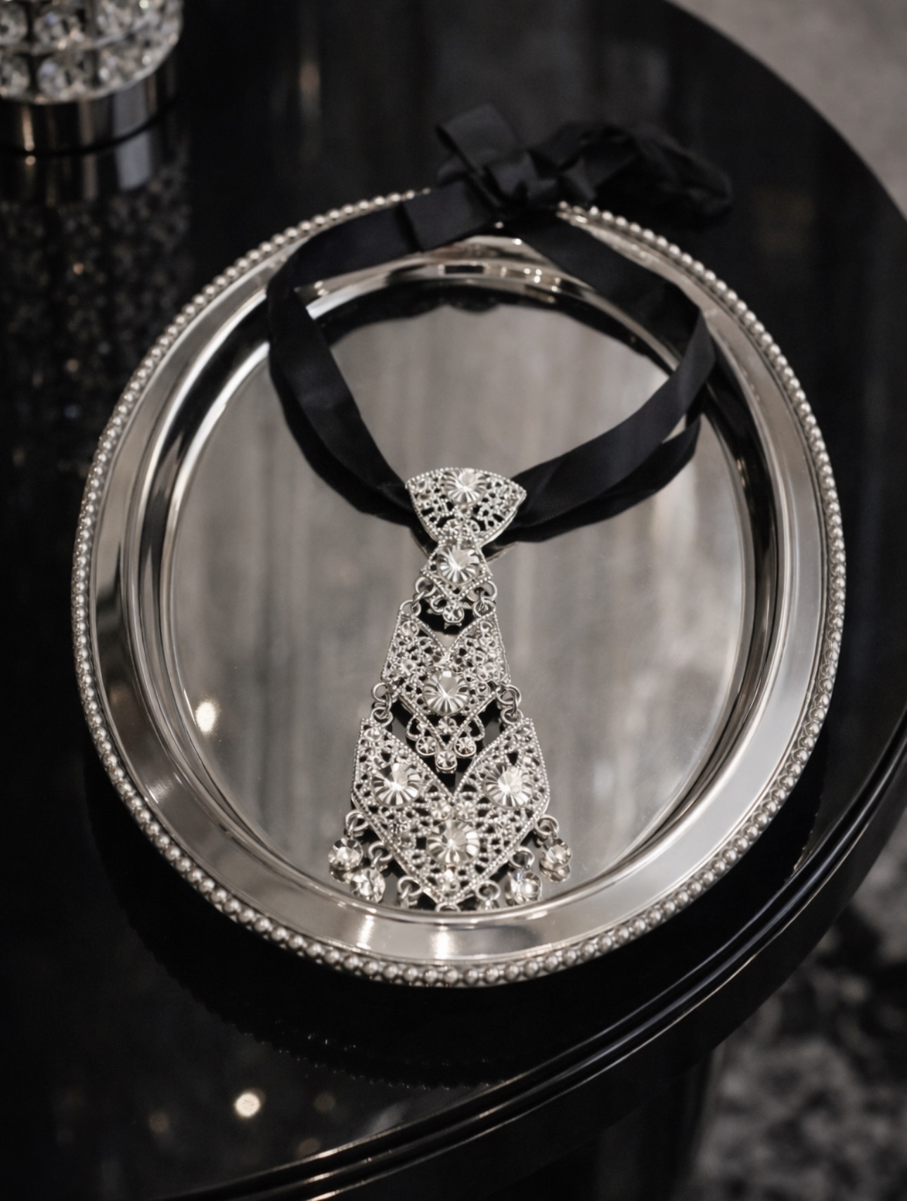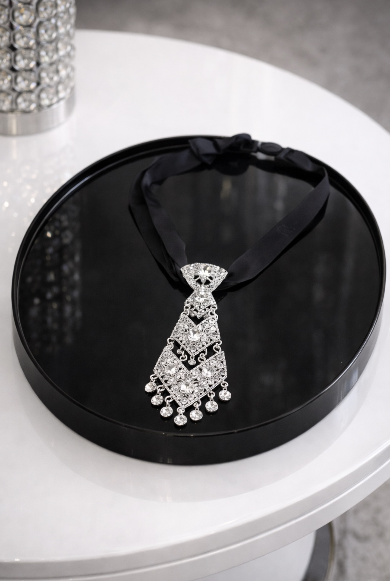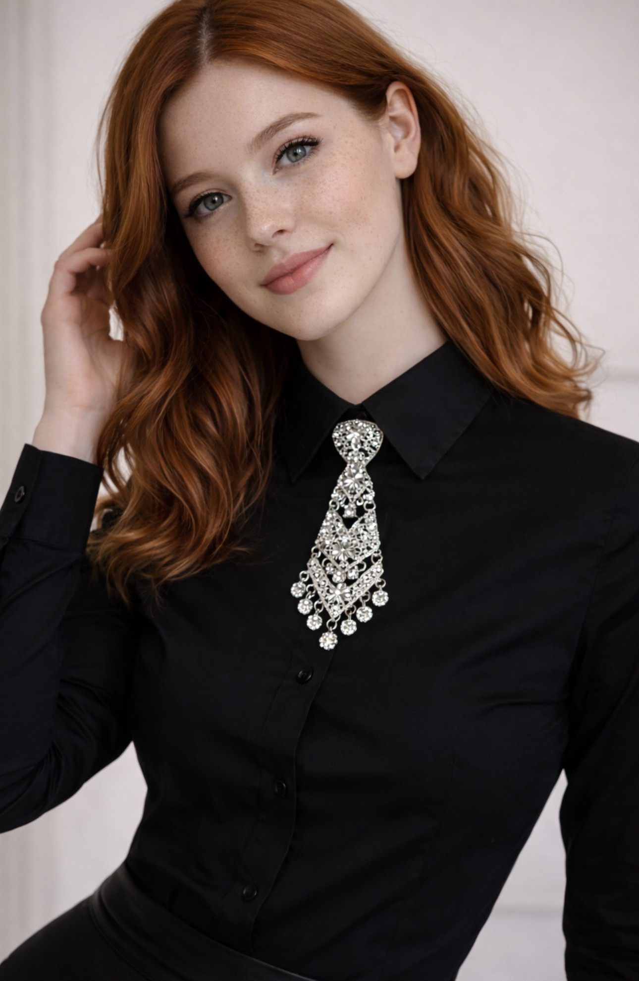 Ta krawatka to biżuteryjny akcent, który natychmiast przyciąga spojrzenia. Dekoracyjny, błyszczący element w połączeniu z delikatną, regulowaną tasiemką tworzy formę, która łączy elegancję z nowoczesnym charakterem. To detal, który zamienia prostą koszulę lub klasyczną sukienkę w stylizację pełną wyrafinowania i światła.