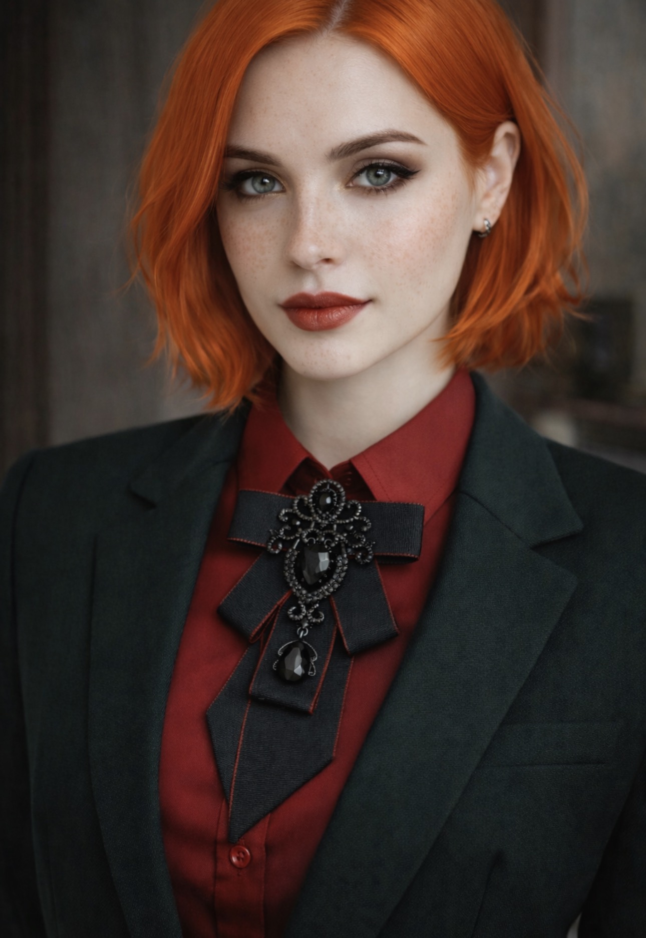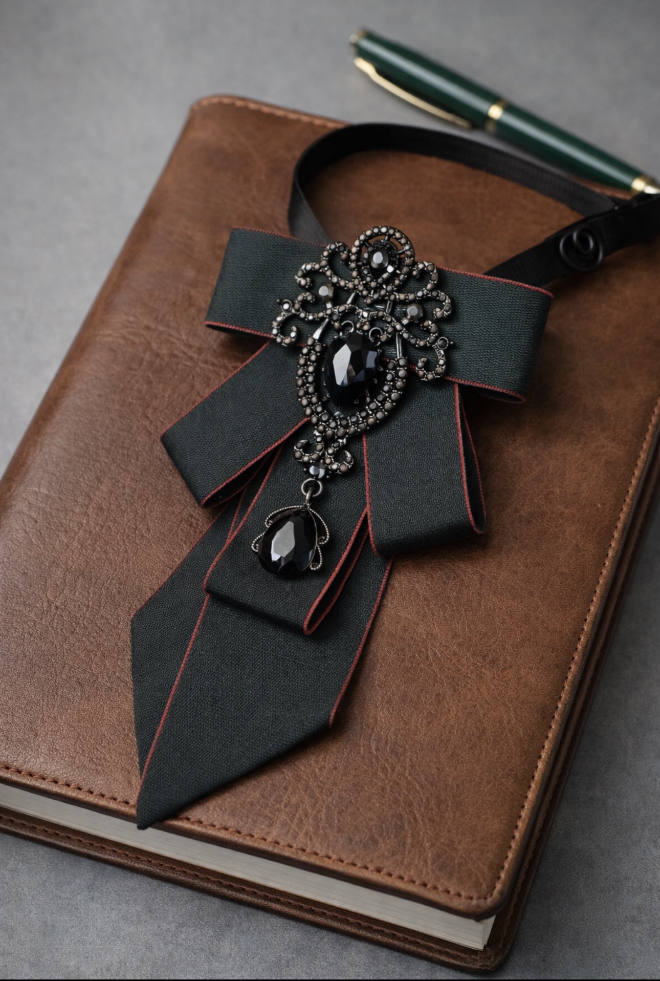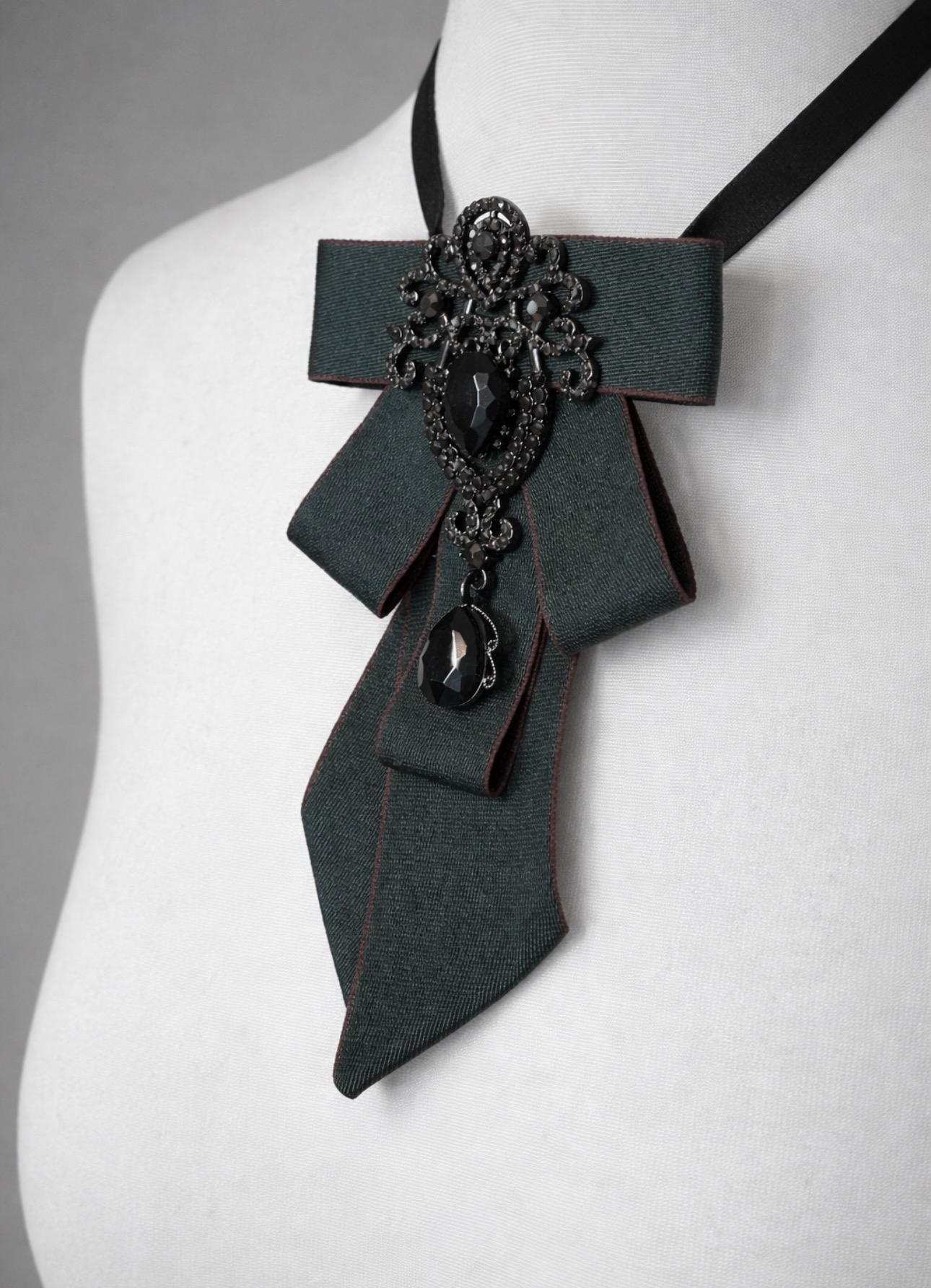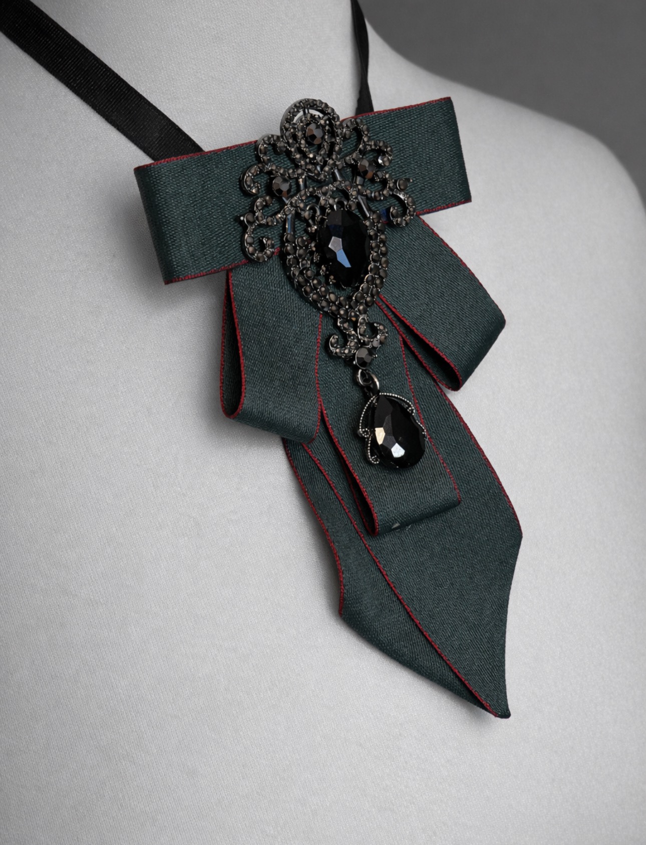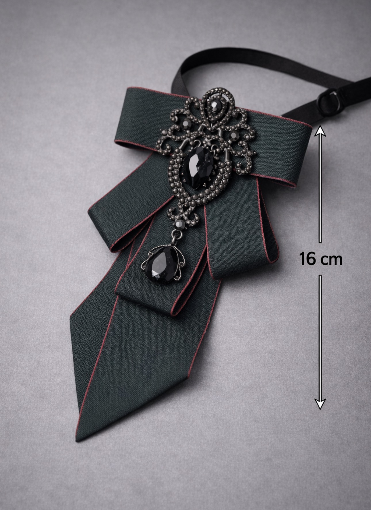 Wyrazista krawatka w stylu gothic glamour, wykonana w eleganckim, ciemnozielonym kolorze z subtelnym, czerwonym akcentem, który dodaje całości charakteru i głębi. Klasyczna forma wstążki została połączona z bogato zdobioną broszką o biżuteryjnym wyglądzie, stanowiącą centralny, przyciągający wzrok element.