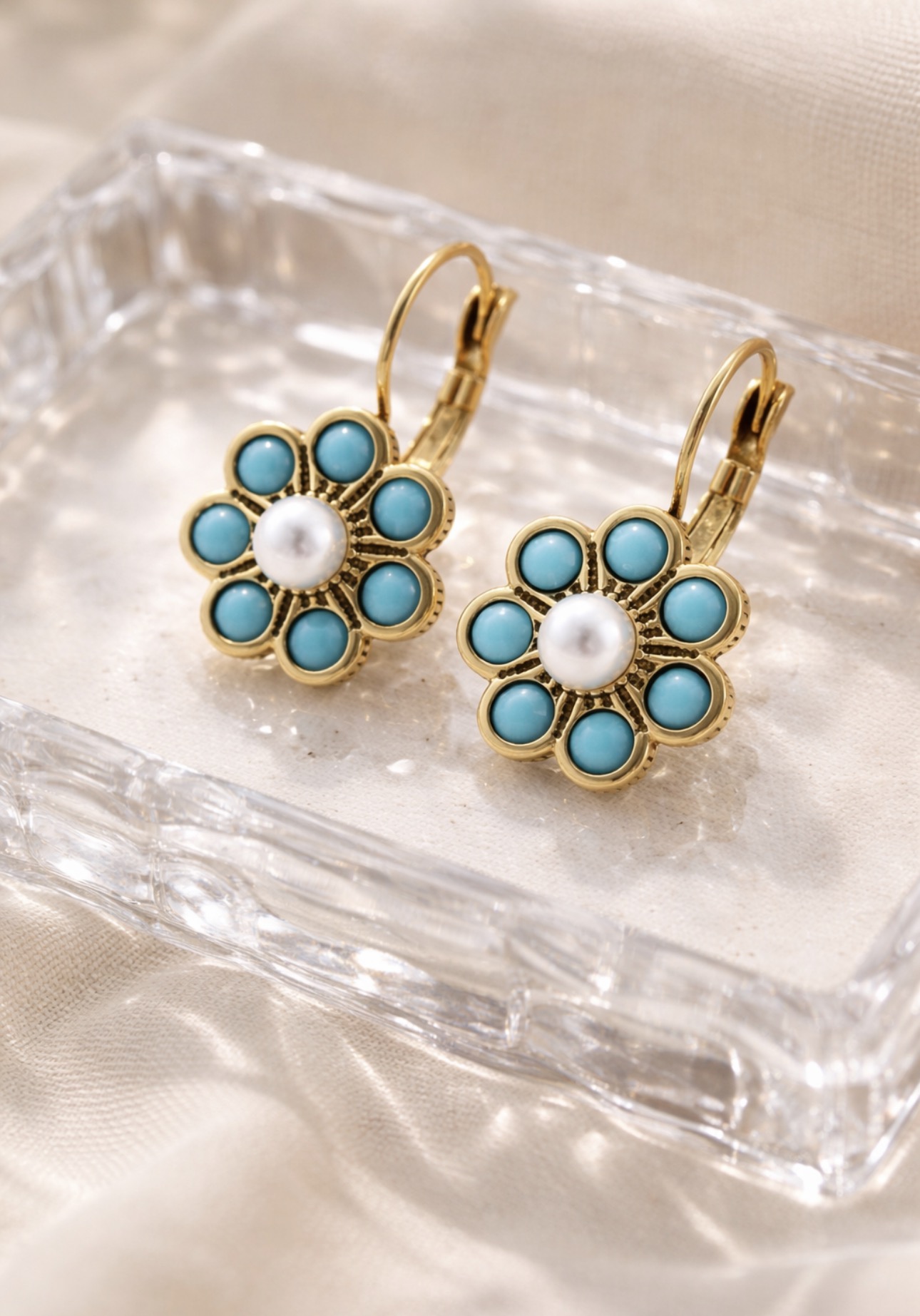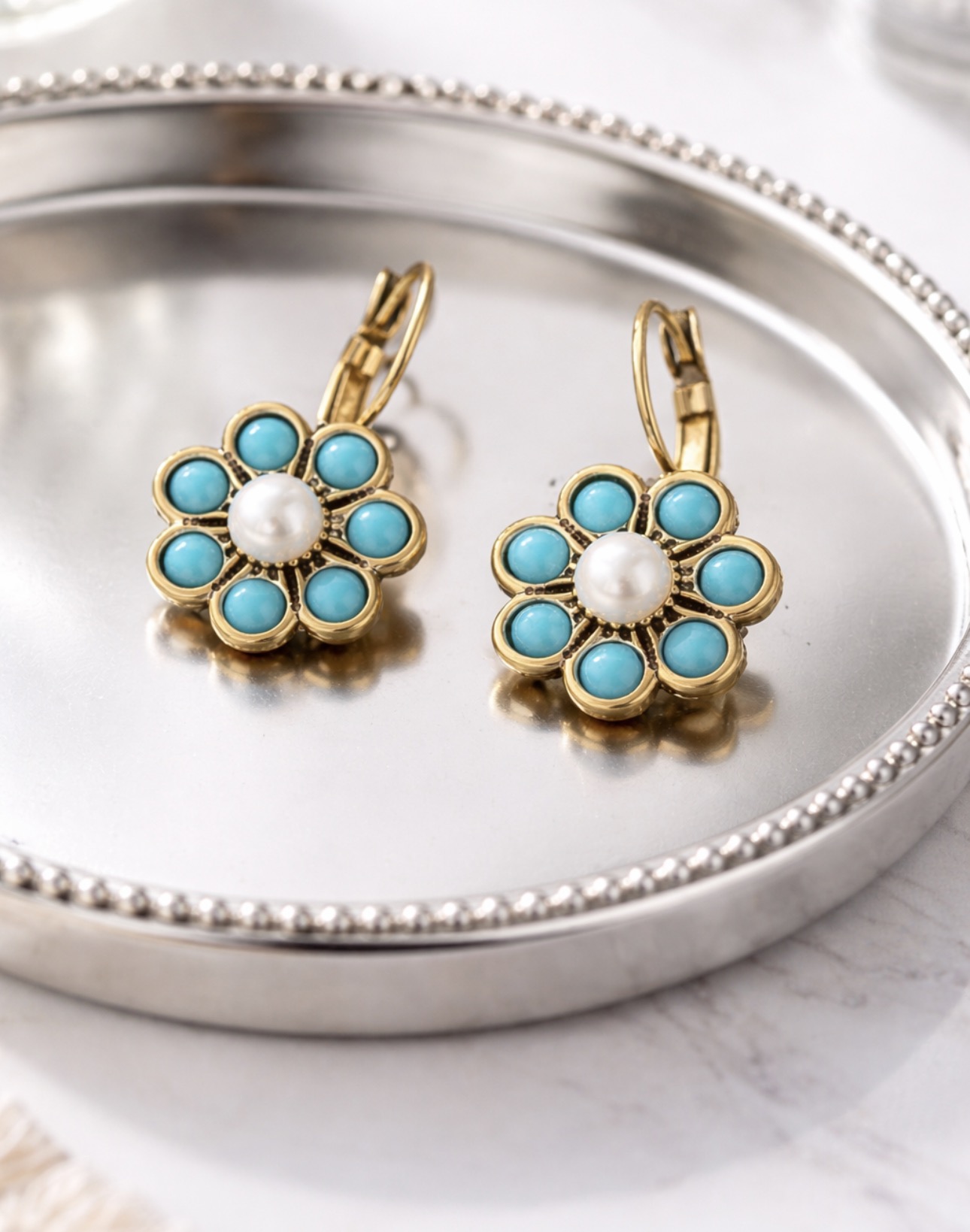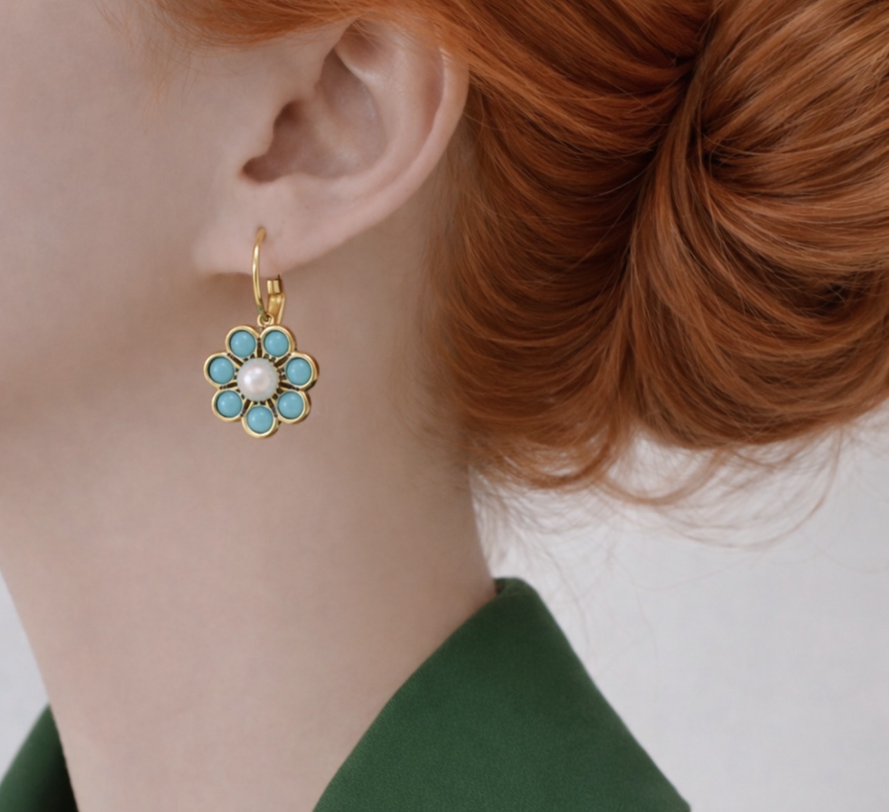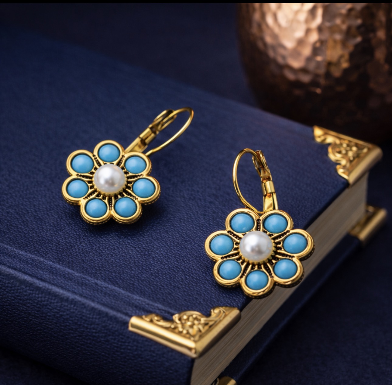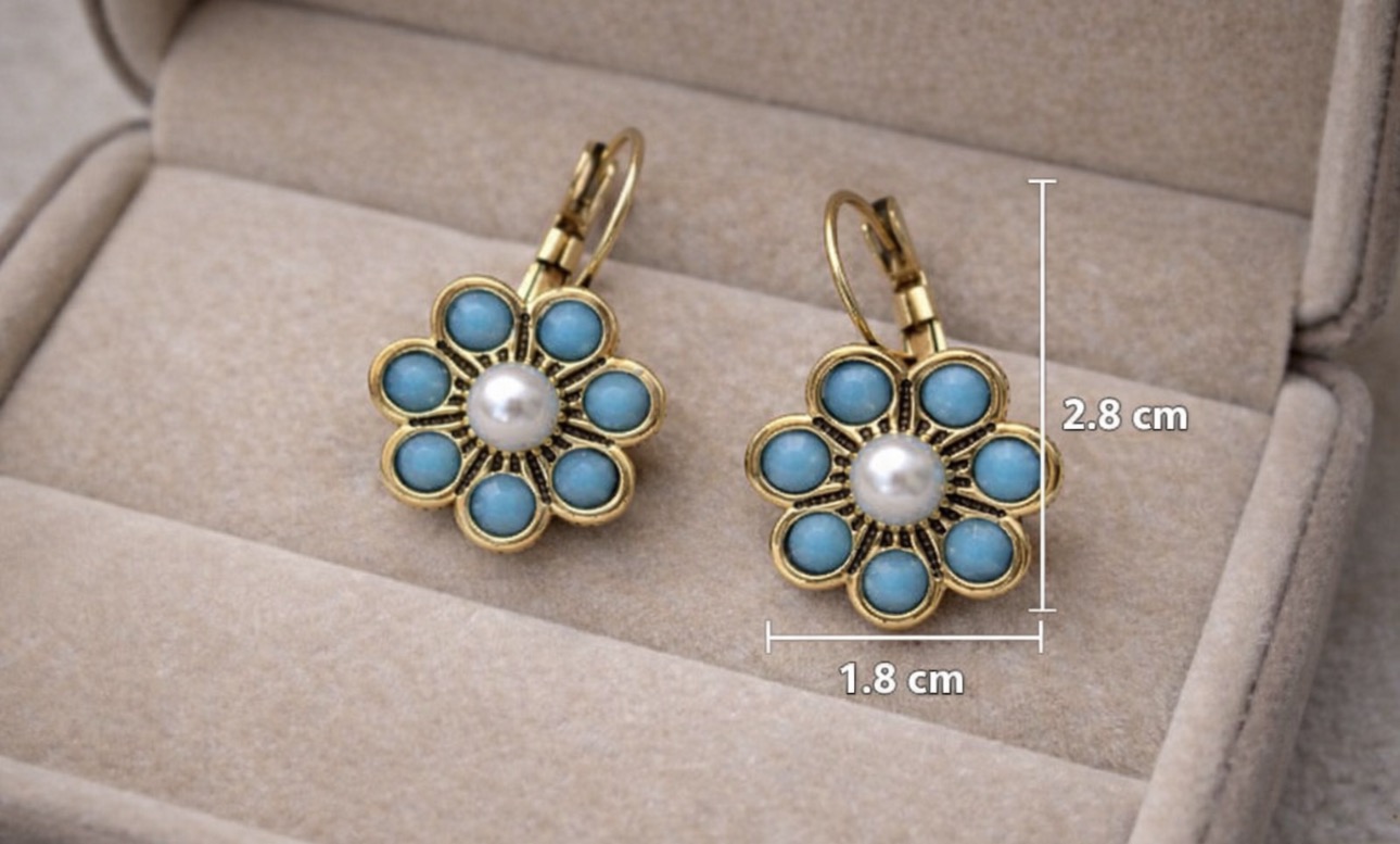 Wyjątkowe kolczyki w kształcie kwiatu, wykonane z miedzi, zdobione turkusem syntetycznym oraz jasnym, perłowym akcentem w centrum. Bogata, dekoracyjna forma inspirowana stylem vintage nadaje biżuterii eleganckiego, a jednocześnie artystycznego charakteru.