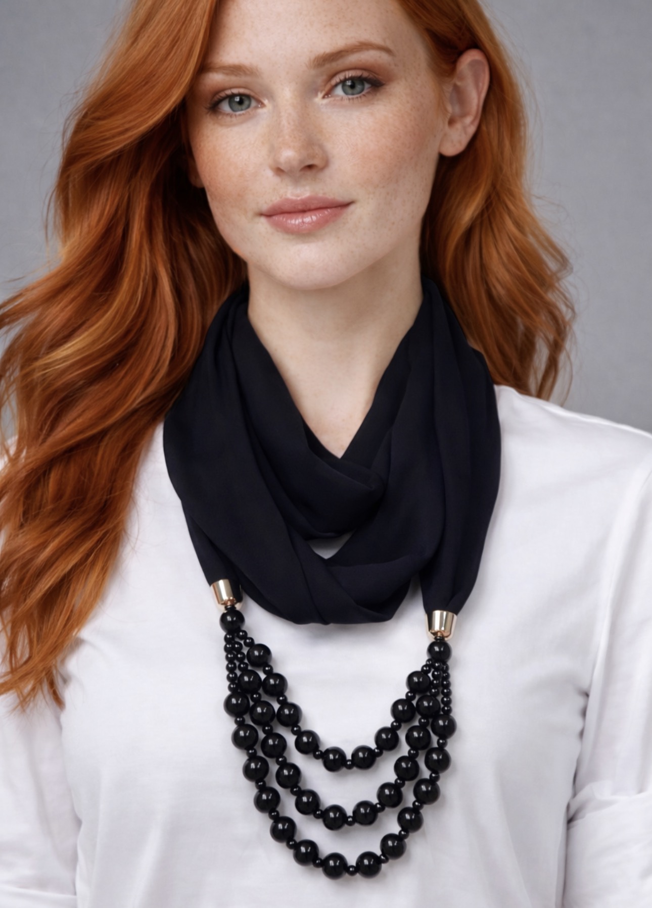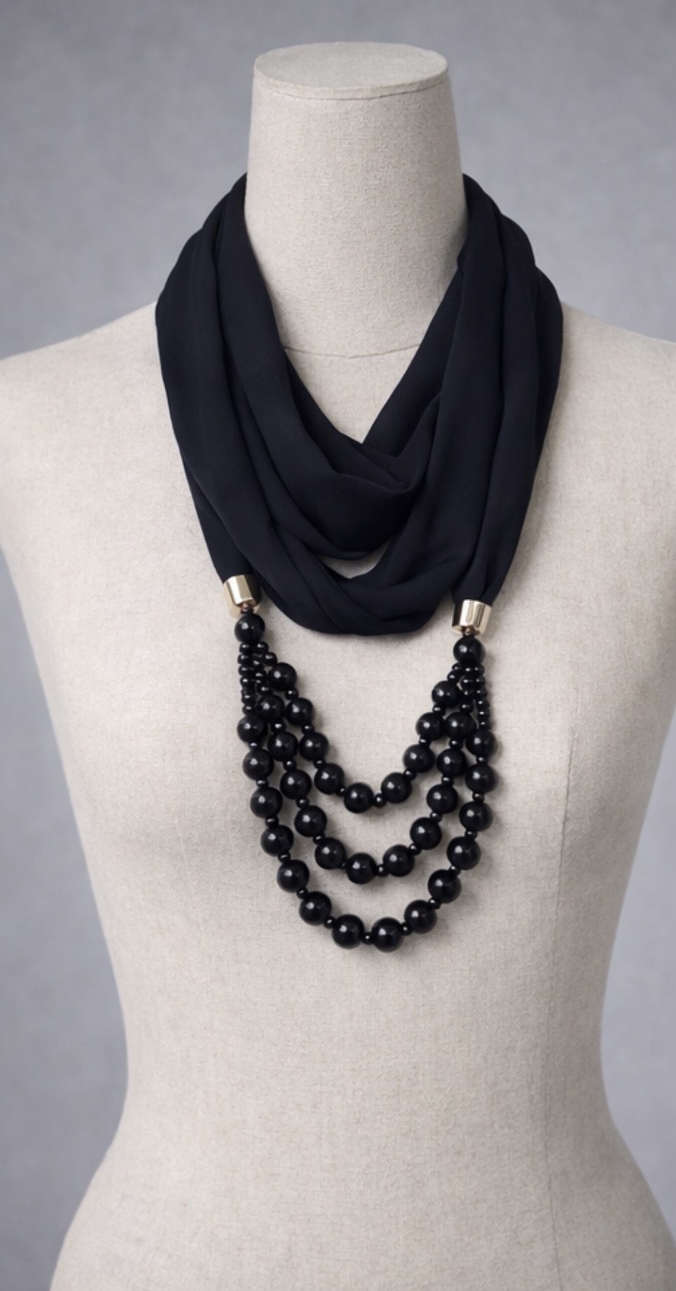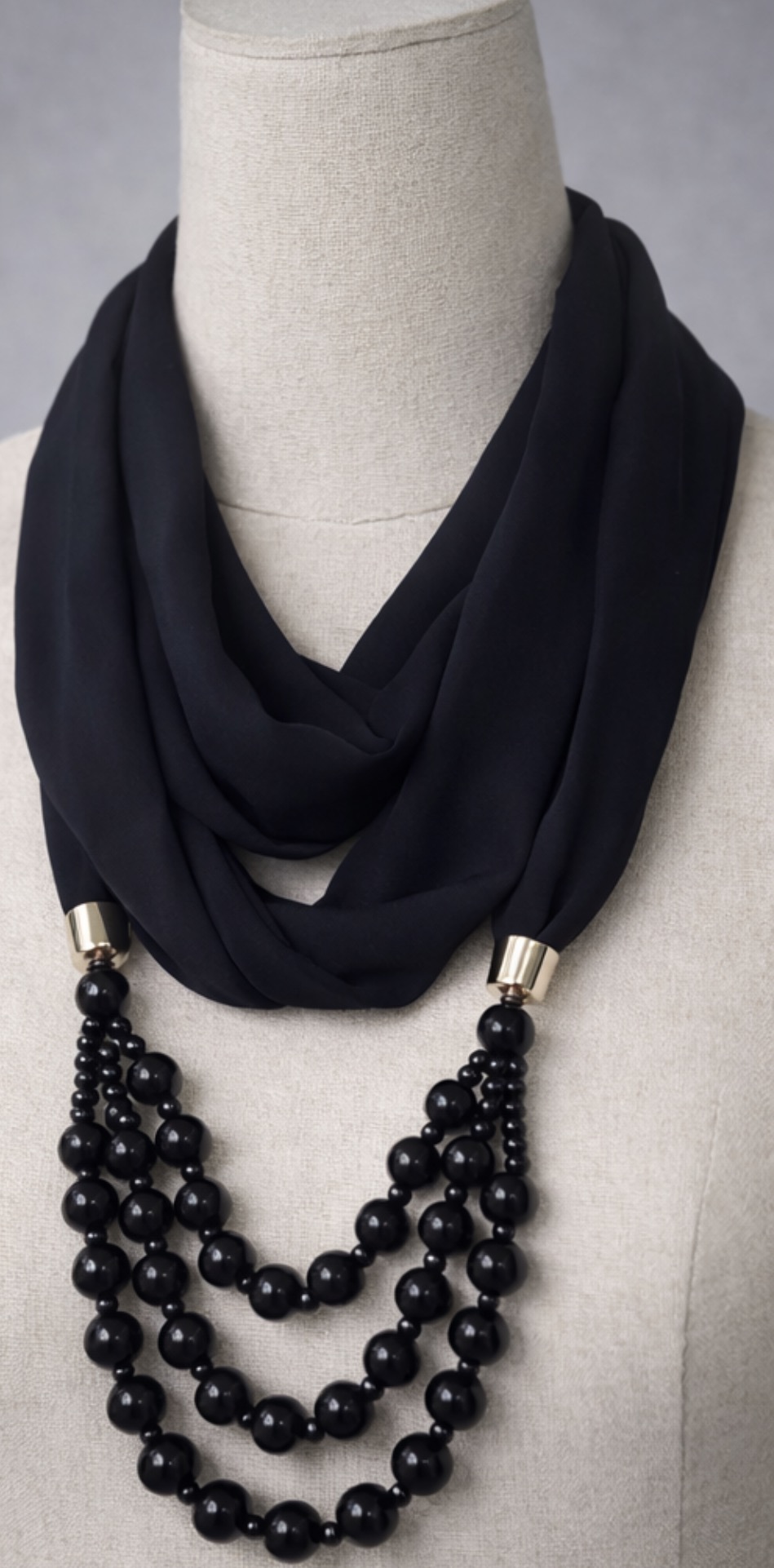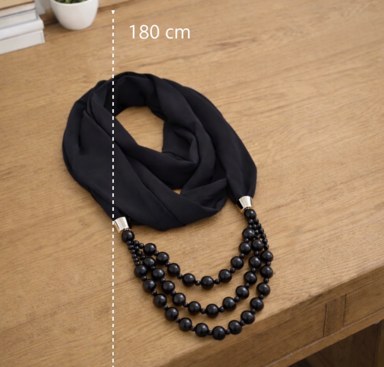 Stylowy naszyjnik łączący miękką, czarną apaszkę z efektownymi, czarnymi koralikami ułożonymi w kilku rzędach. To połączenie biżuterii i tkaniny nadaje całości wyjątkowego charakteru i sprawia, że dodatek pięknie układa się przy szyi.