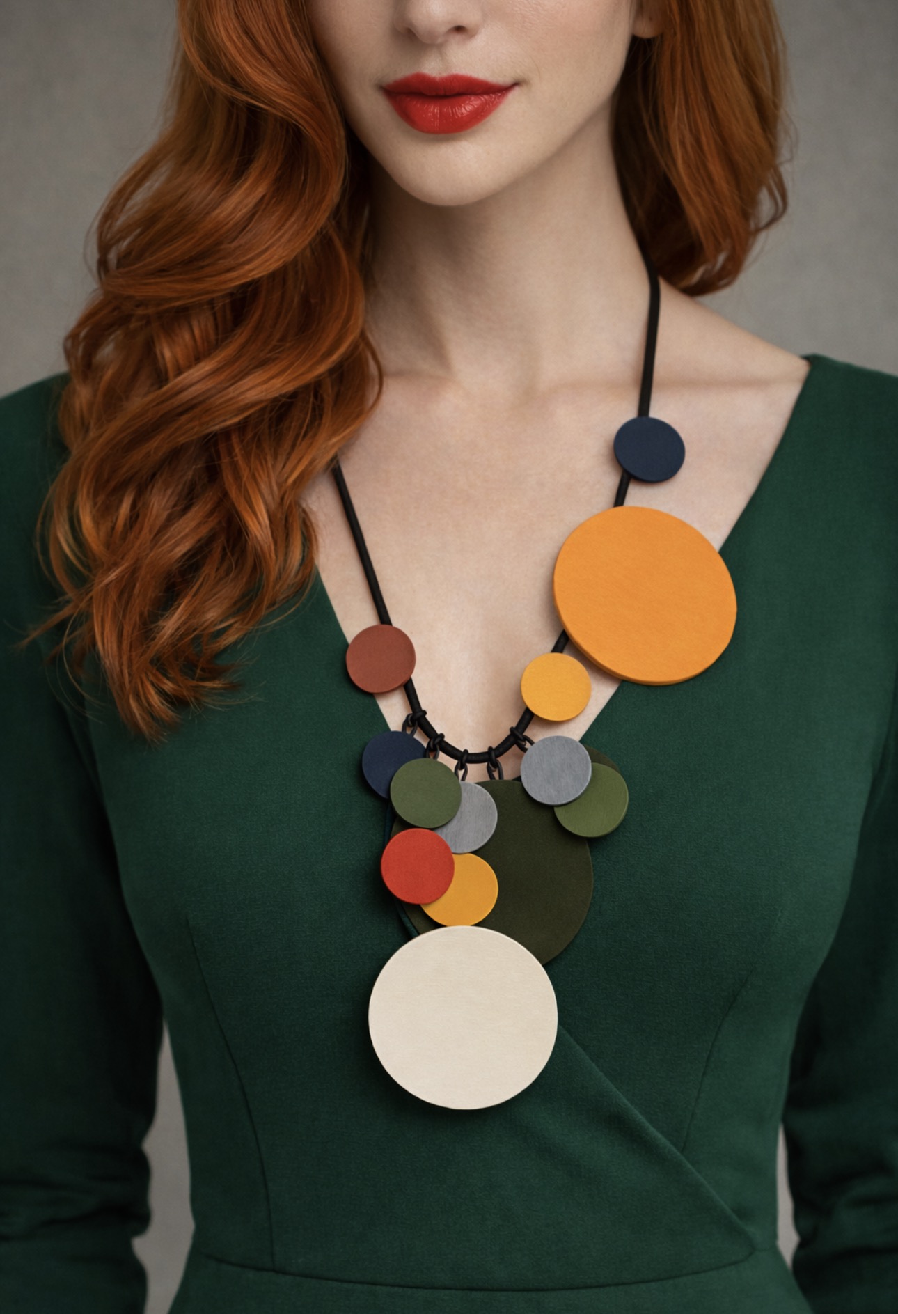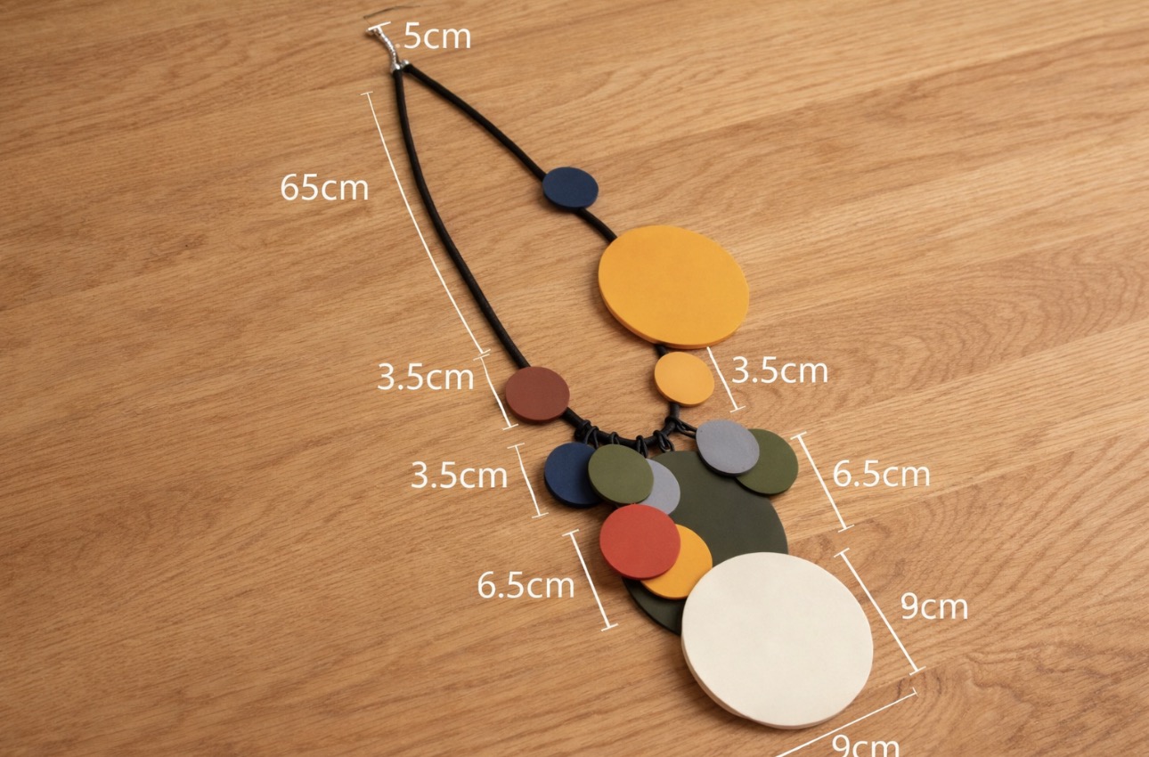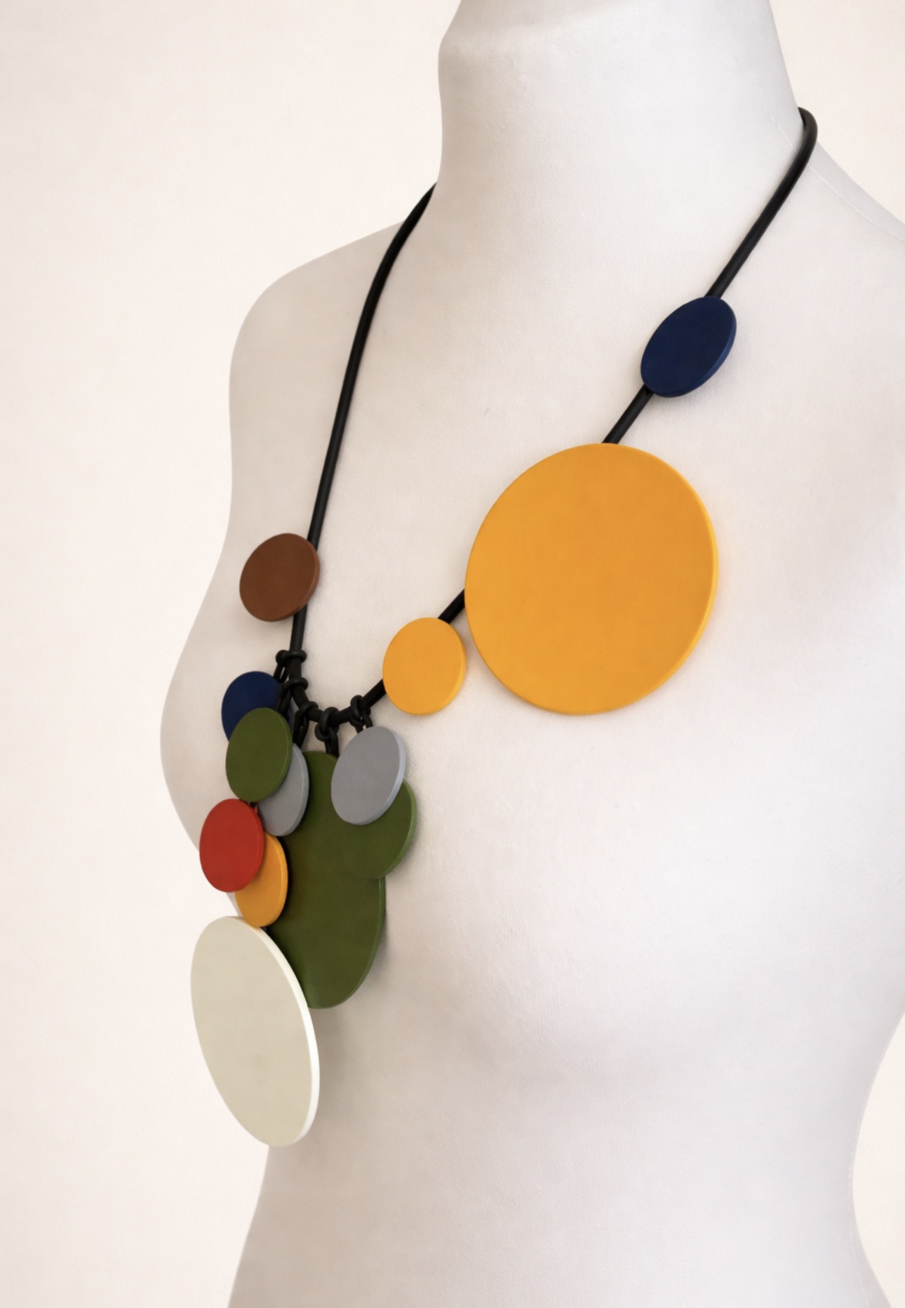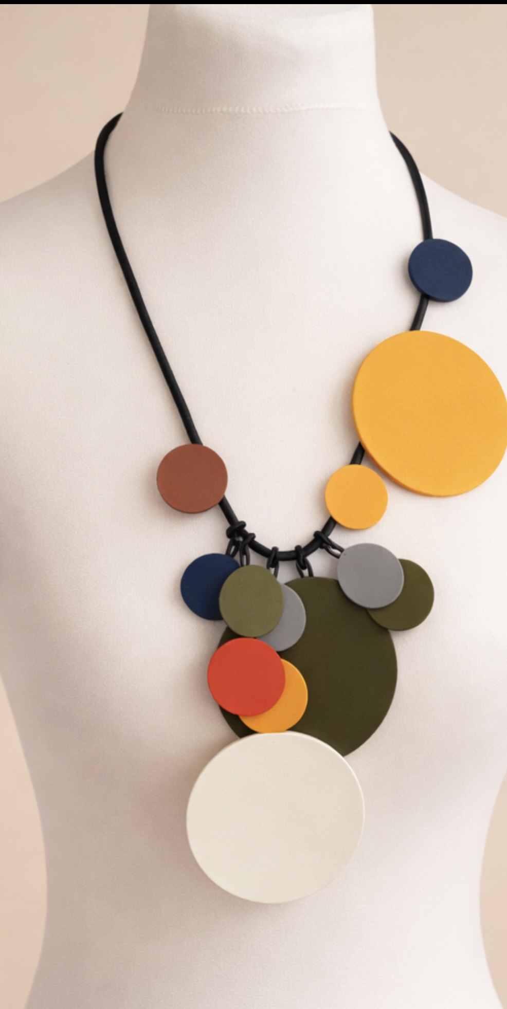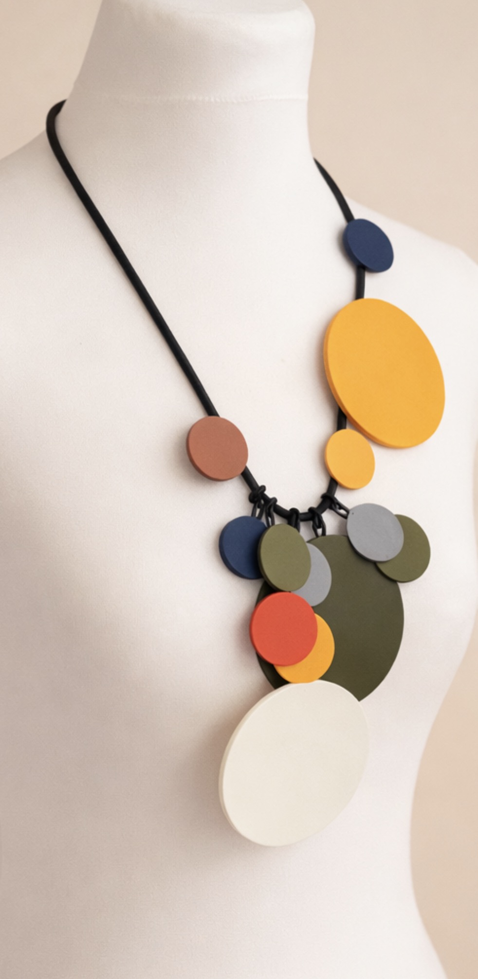 Wyrazisty naszyjnik z dekoracyjnymi, drewnianymi elementami w formie kół o różnych wielkościach. Kompozycja kolorów i geometrycznych kształtów tworzy nowoczesny, artystyczny efekt, który pięknie podkreśla stylizację i przyciąga spojrzenia.