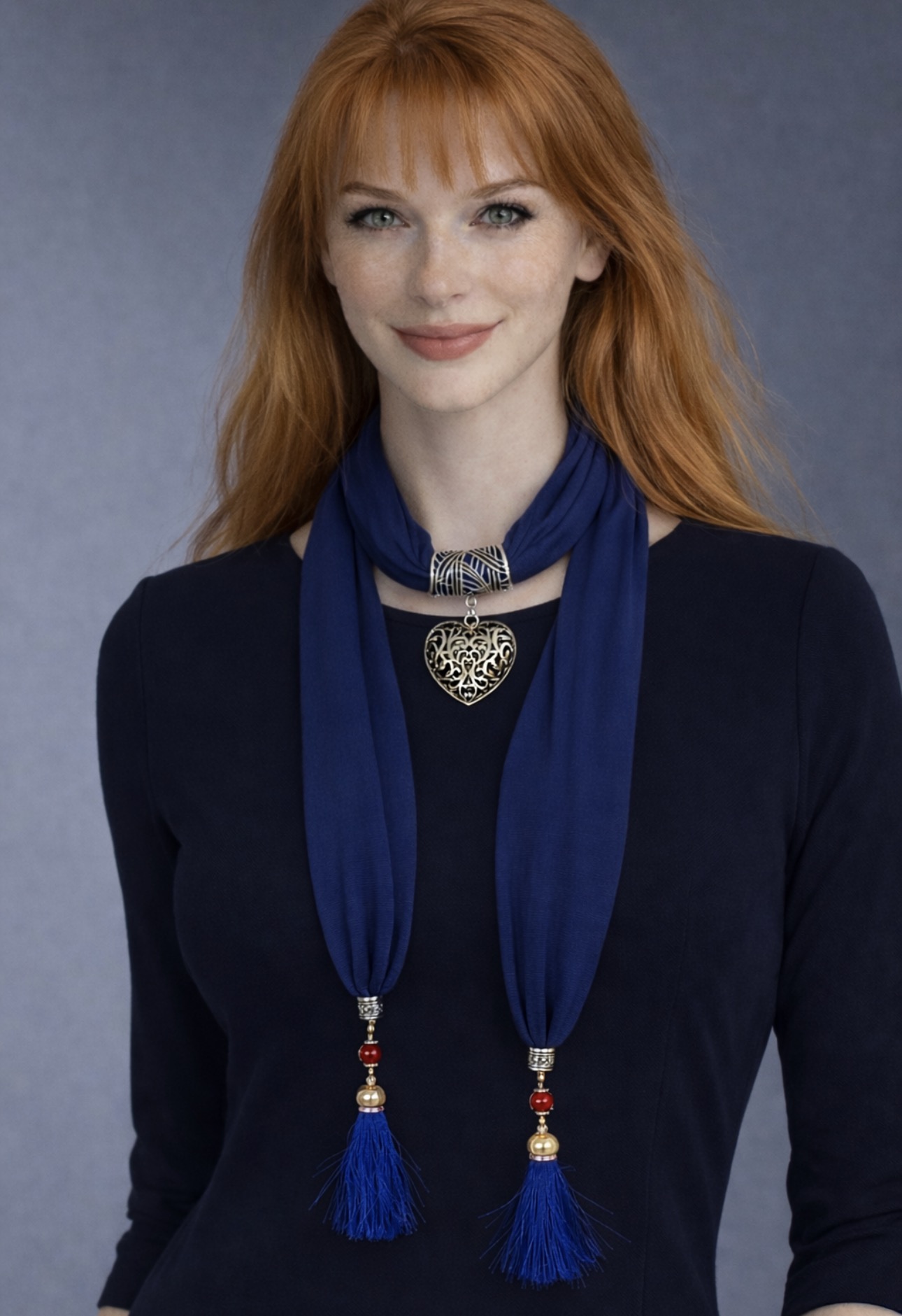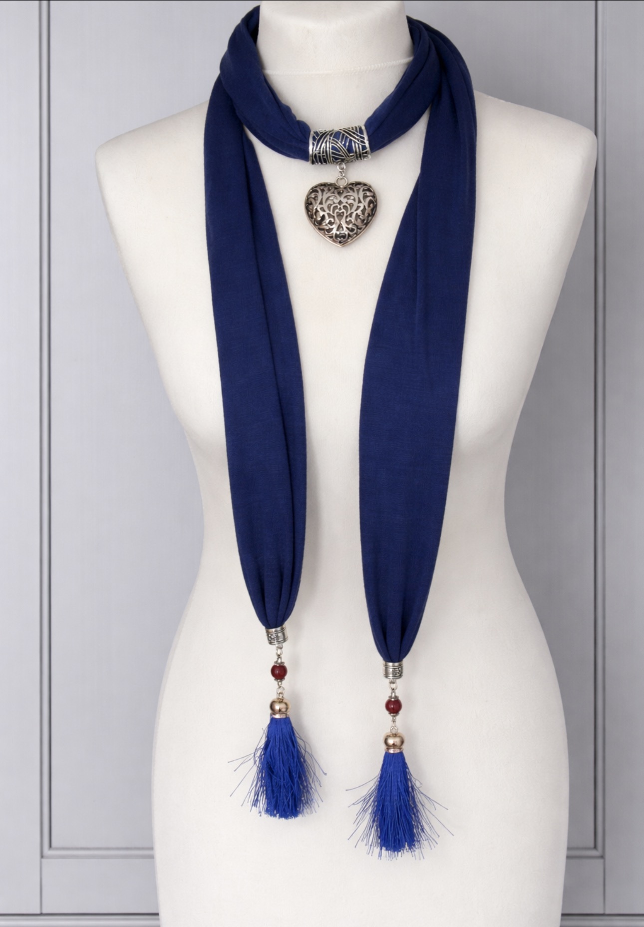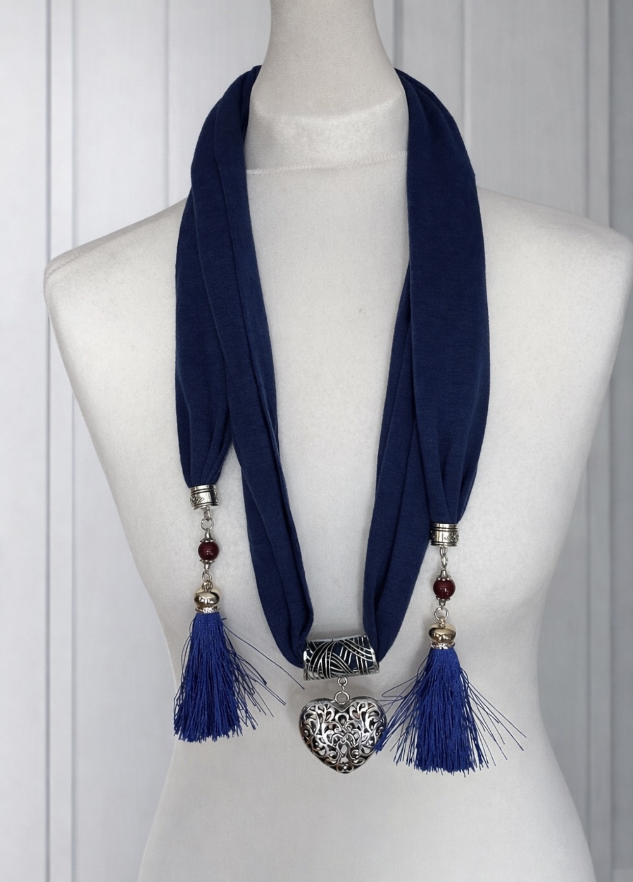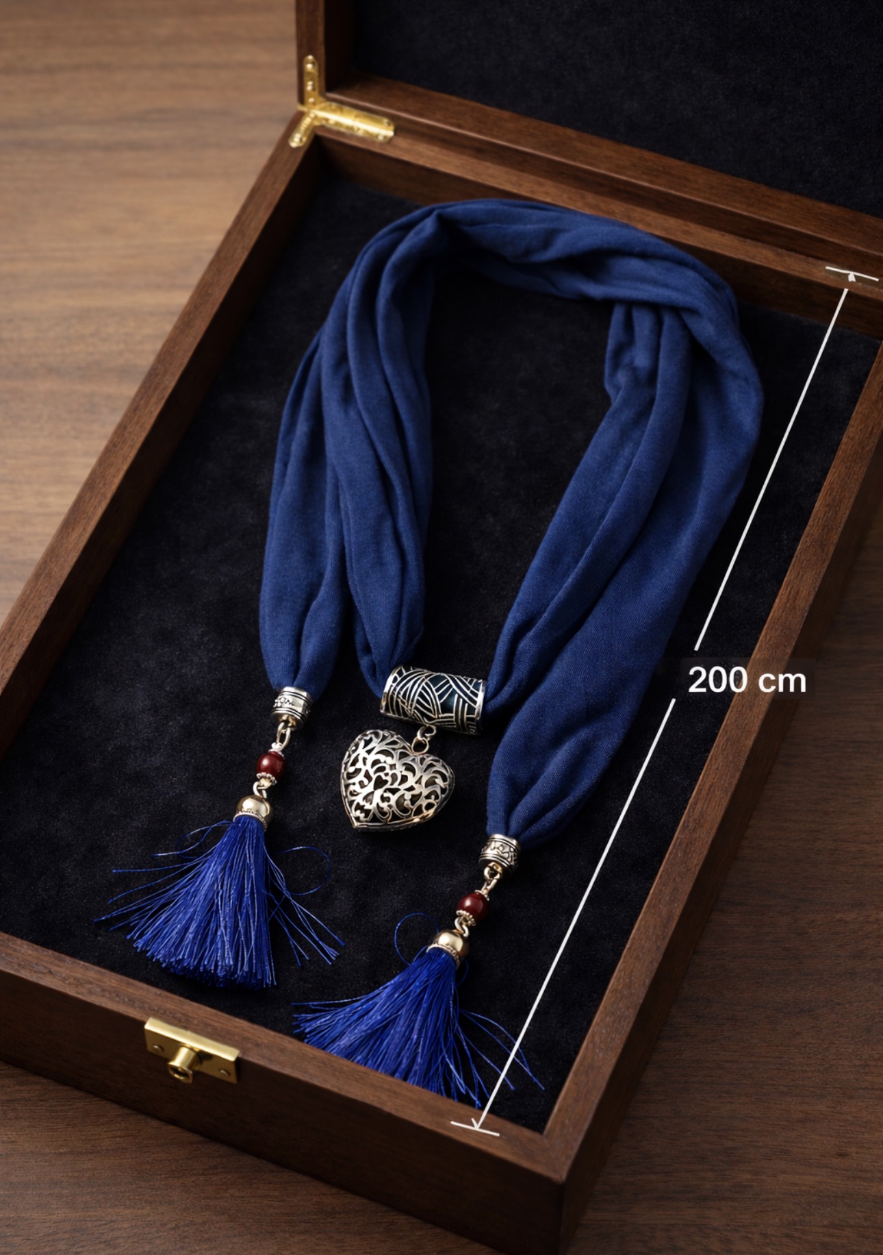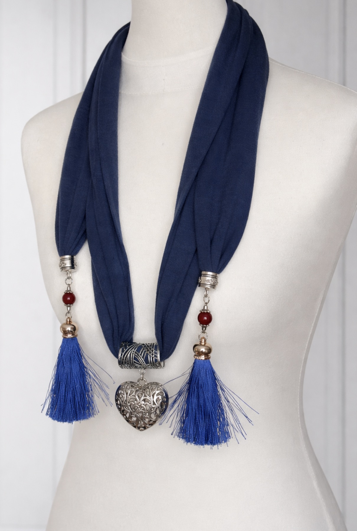 Elegancki, biżuteryjny szal w głębokim granatowym kolorze, który łączy funkcję ozdobnego naszyjnika i modnego dodatku do stylizacji. Centralnym elementem jest dekoracyjne, metalowe serce o ażurowym wzorze, które nadaje całości wyjątkowego, romantycznego charakteru. Zakończenia szala zdobią efektowne chwosty z ozdobnymi koralikami, dodające lekkości i ruchu.