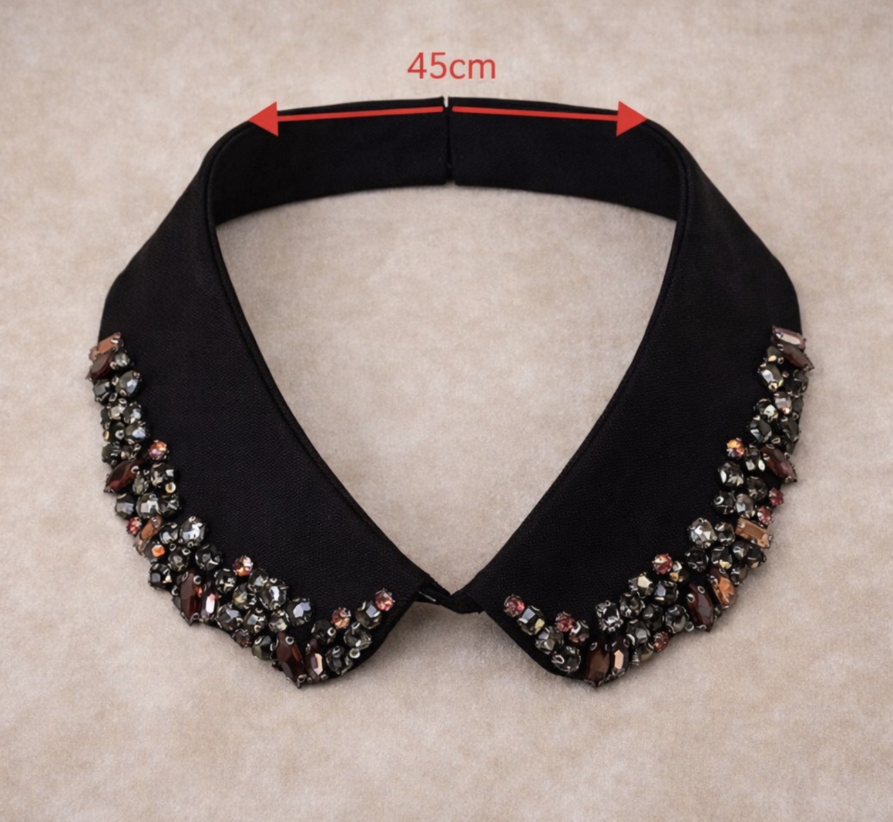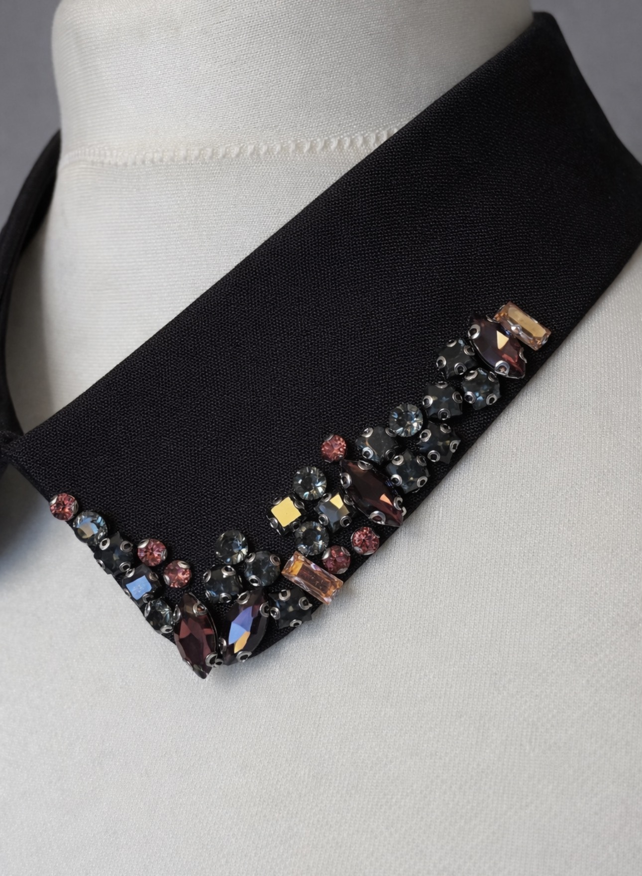 Stylowy, odpinany kołnierzyk w eleganckim czarnym kolorze, ozdobiony drobnymi, wielobarwnymi kryształkami tworzącymi biżuteryjną, subtelną kompozycję. Zdobienie pięknie mieni się w świetle i nadaje stylizacji wyrafinowanego, modowego charakteru, nie przytłaczając całości.
