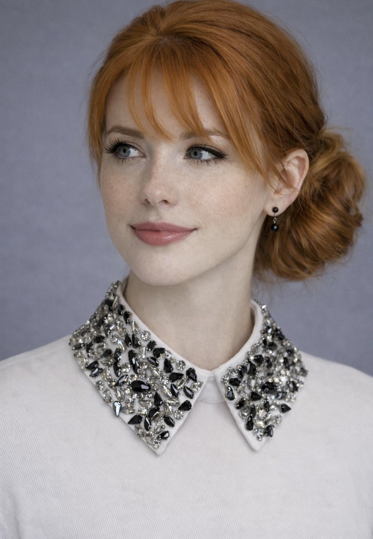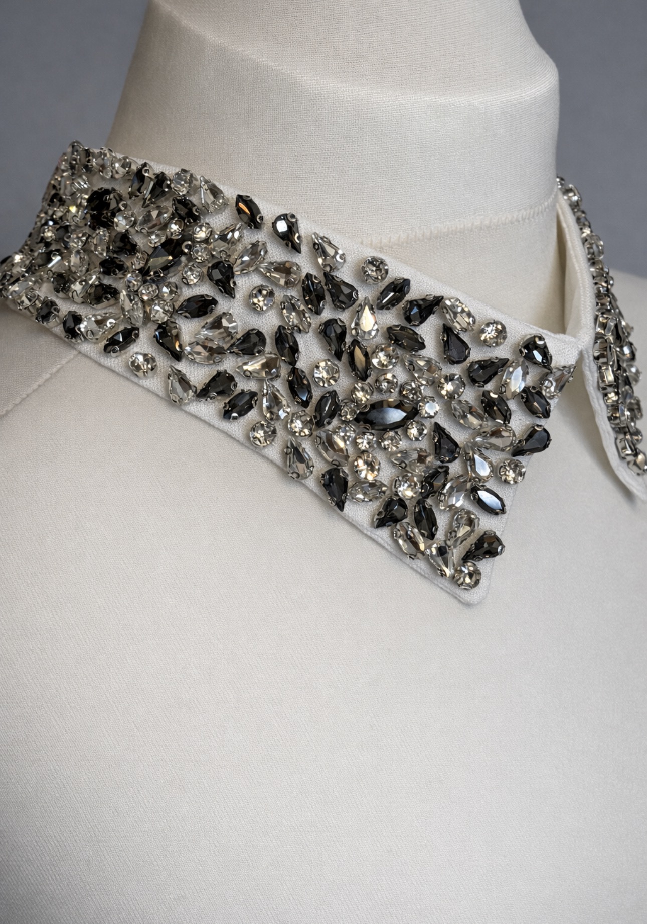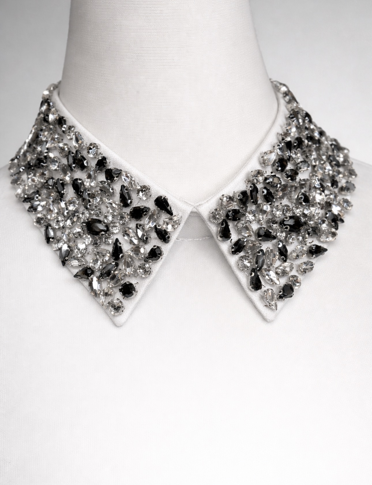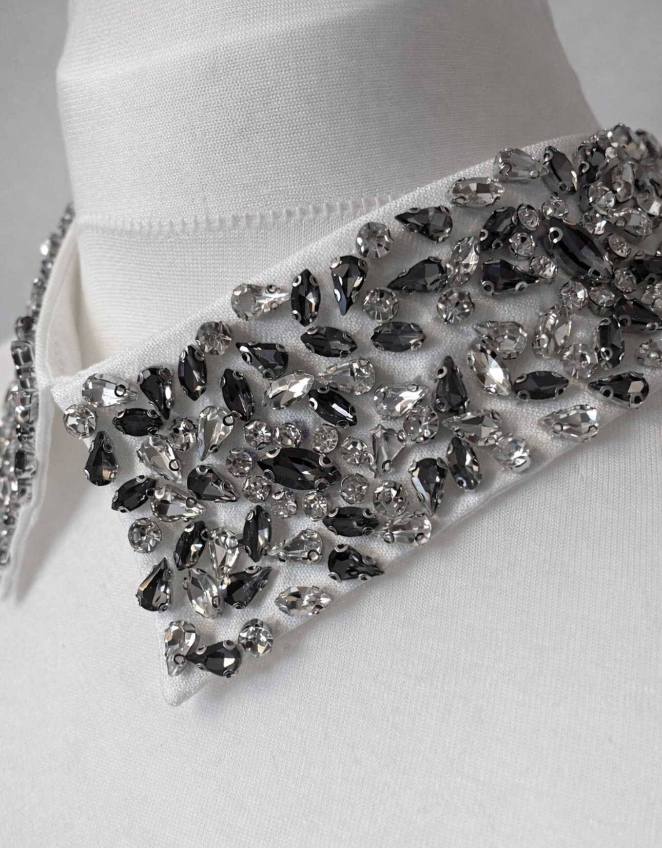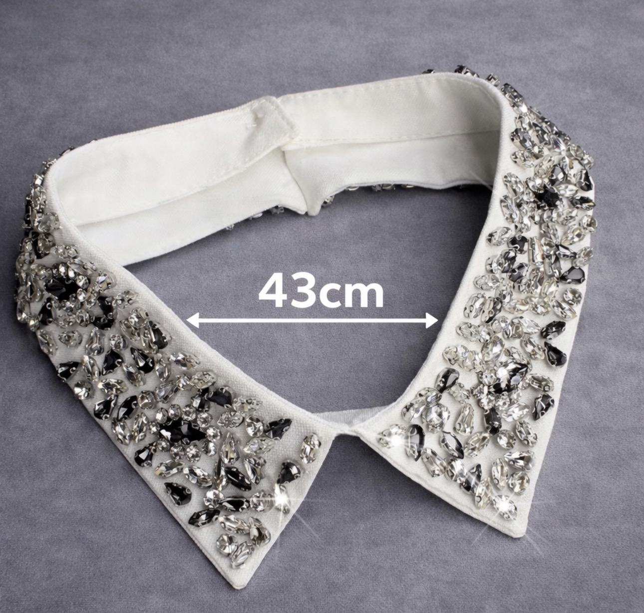 Elegancki, odpinany kołnierzyk w klasycznym białym kolorze, bogato zdobiony lśniącymi kryształkami ułożonymi w efektowną, biżuteryjną kompozycję. Zdobienia pięknie odbijają światło, nadając stylizacji luksusowego i wyrazistego charakteru. To idealny sposób, aby w prosty sposób odmienić koszulę, sukienkę lub sweter.