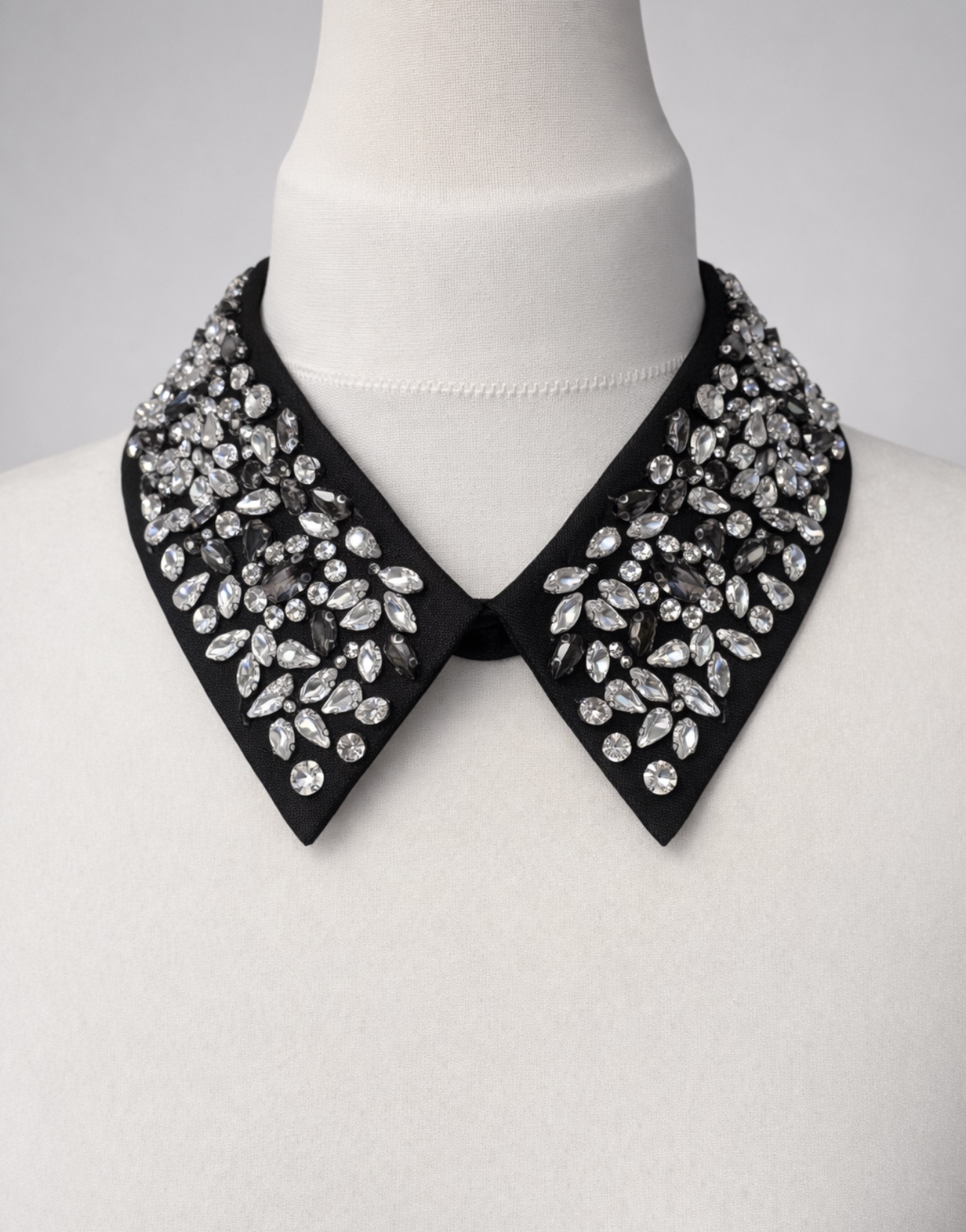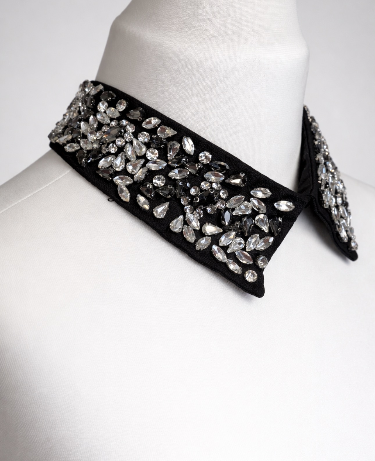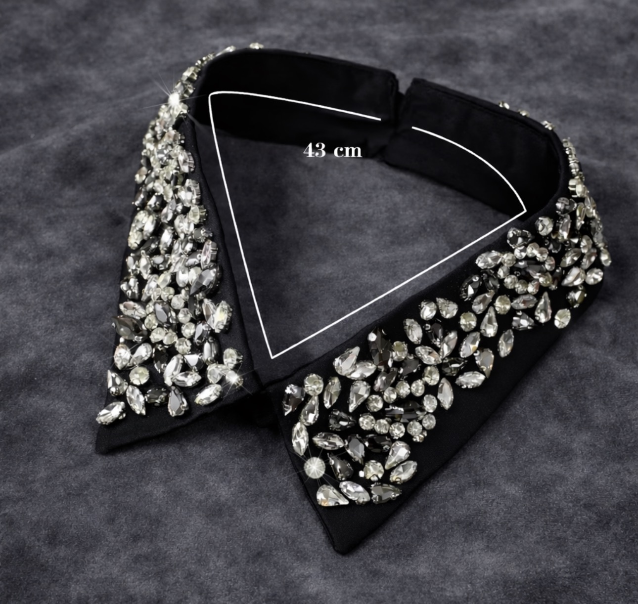Efektowny, odpinany kołnierzyk w eleganckim czarnym kolorze, bogato zdobiony lśniącymi kryształkami ułożonymi w gęsty, biżuteryjny wzór. Zdobienia pięknie odbijają światło, nadając stylizacji luksusowego i wyrazistego charakteru. To idealny sposób, aby w prosty sposób odmienić klasyczną koszulę, sukienkę lub top.