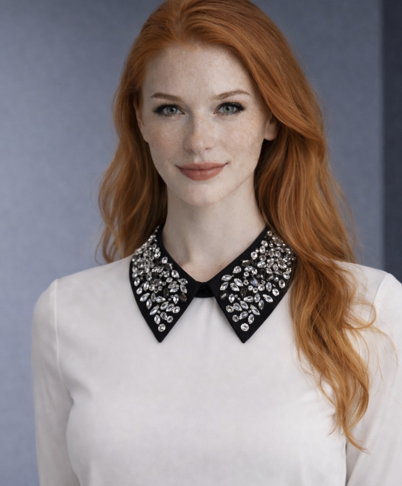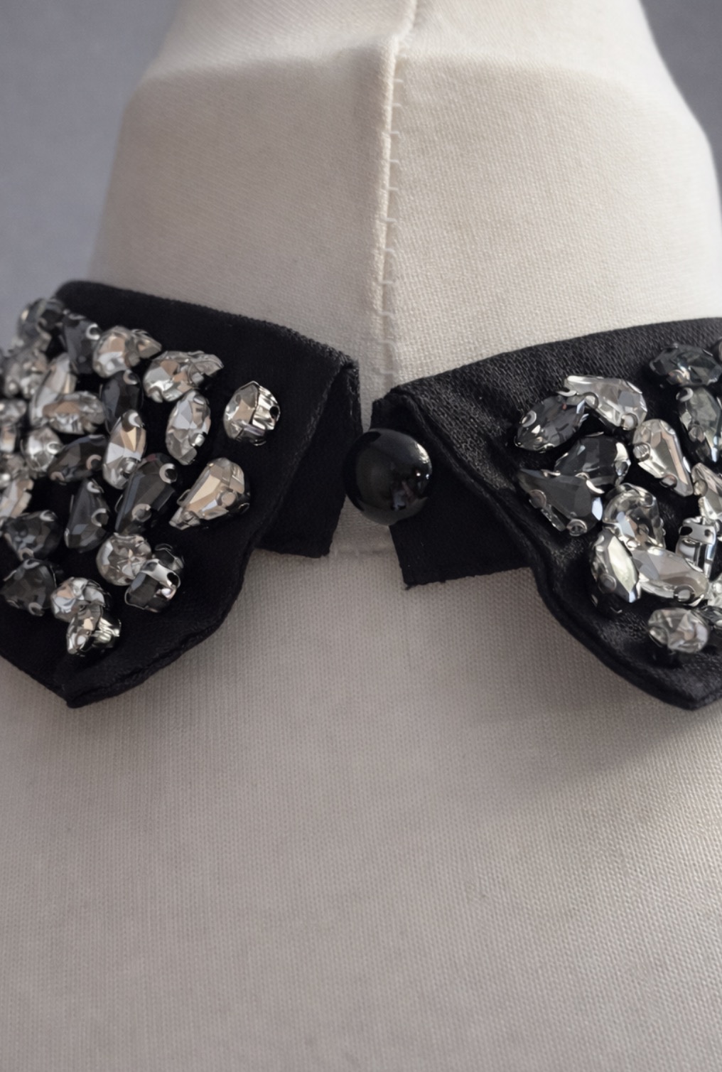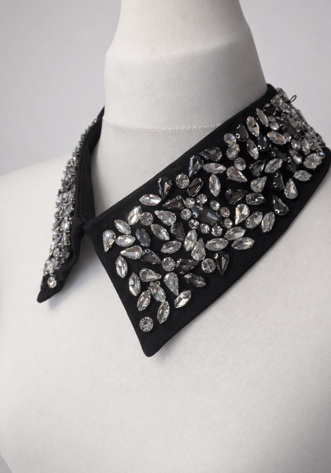 Efektowny, odpinany kołnierzyk w eleganckim czarnym kolorze, bogato zdobiony lśniącymi kryształkami ułożonymi w gęsty, biżuteryjny wzór. Zdobienia pięknie odbijają światło, nadając stylizacji luksusowego i wyrazistego charakteru. To idealny sposób, aby w prosty sposób odmienić klasyczną koszulę, sukienkę lub top.