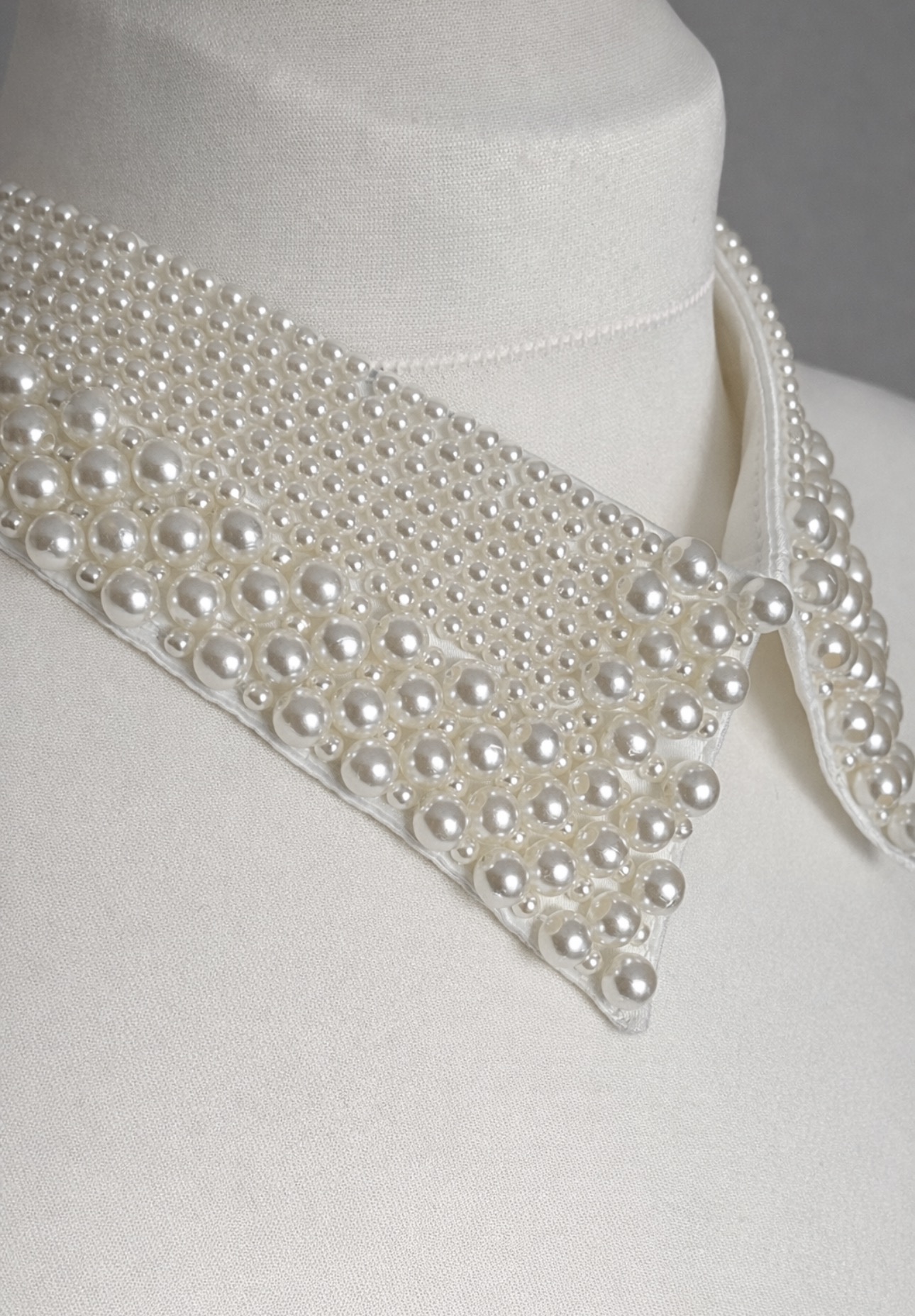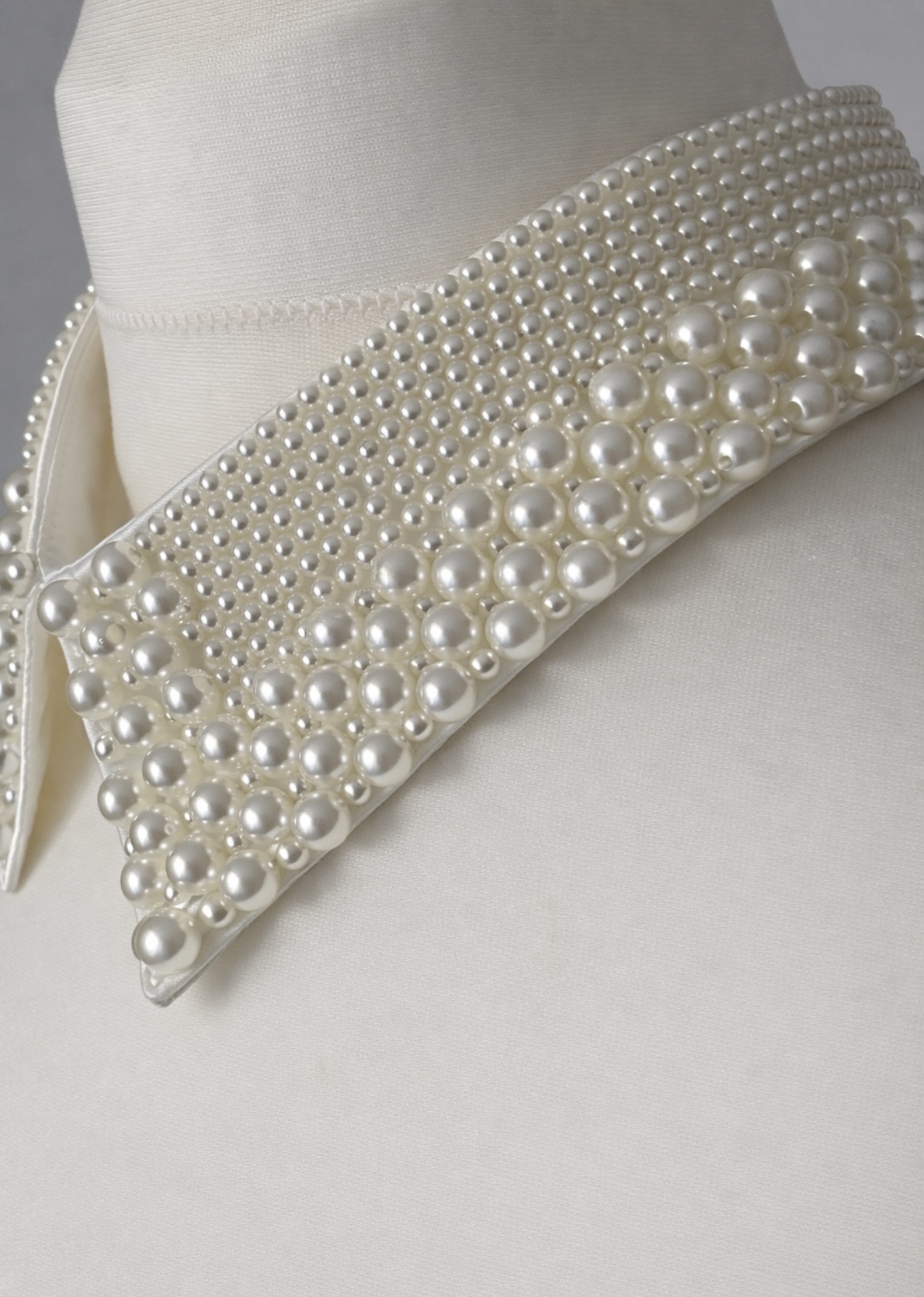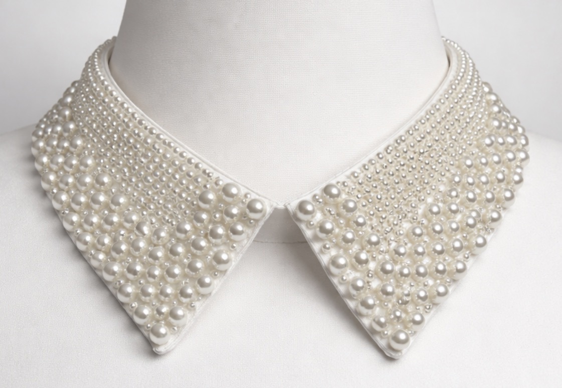 Elegancki, odpinany kołnierzyk w delikatnym kolorze ecru, bogato zdobiony gęsto rozmieszczonymi perełkami w różnych rozmiarach, które tworzą luksusowy, biżuteryjny efekt. Subtelny, ciepły odcień ecru pięknie rozświetla stylizację i nadaje jej wyjątkowej klasy oraz ponadczasowej elegancji.