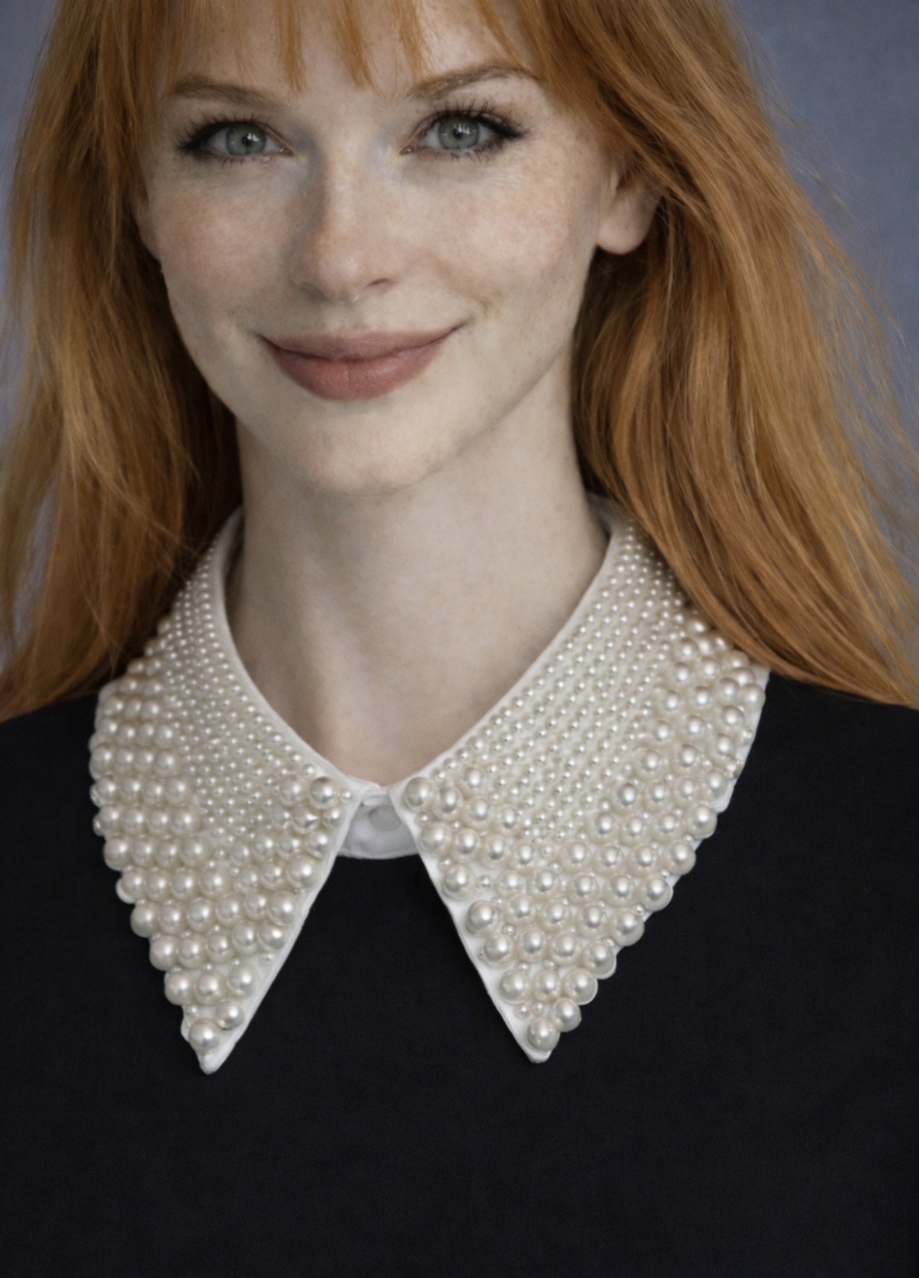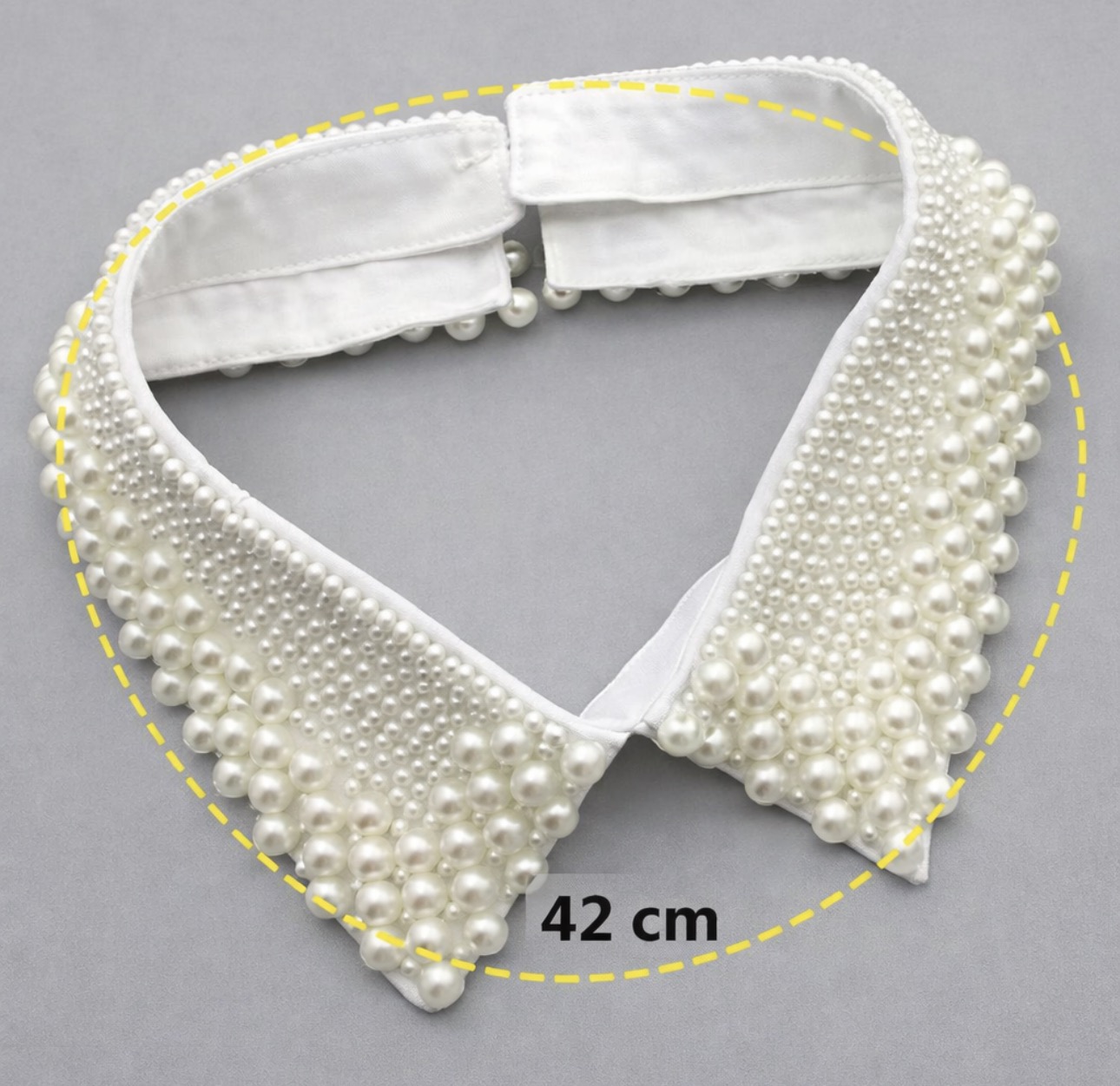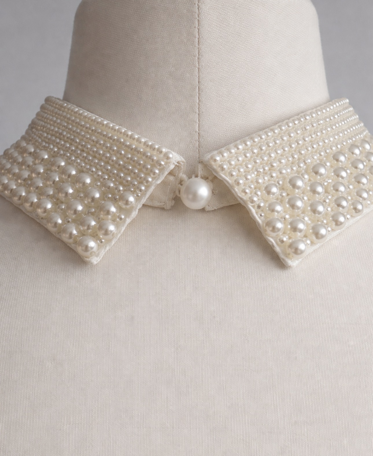 Elegancki, odpinany kołnierzyk w delikatnym kolorze ecru, bogato zdobiony gęsto rozmieszczonymi perełkami w różnych rozmiarach, które tworzą luksusowy, biżuteryjny efekt. Subtelny, ciepły odcień ecru pięknie rozświetla stylizację i nadaje jej wyjątkowej klasy oraz ponadczasowej elegancji.