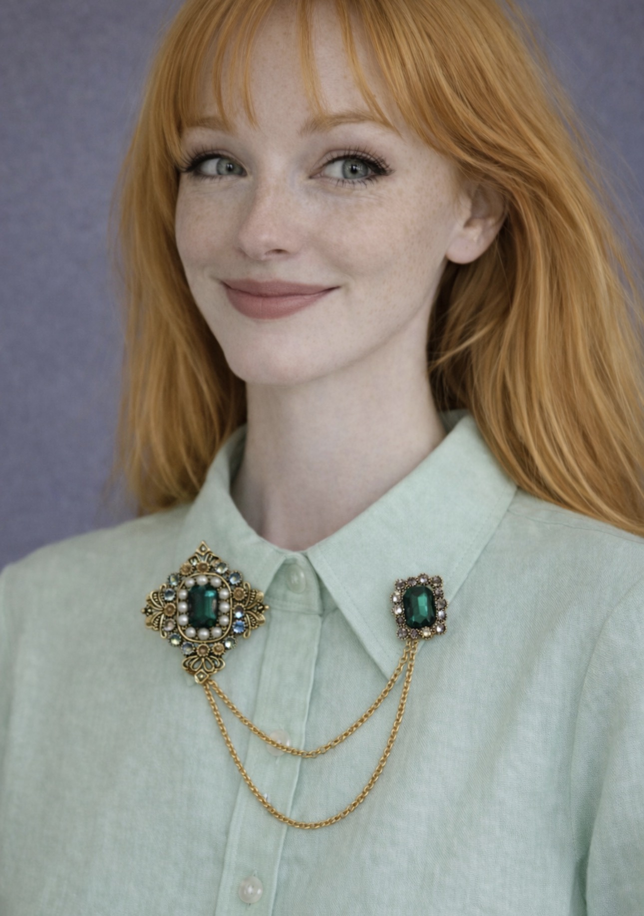 przypiętą do kołnierzyka koszuli — zamiast naszyjnika