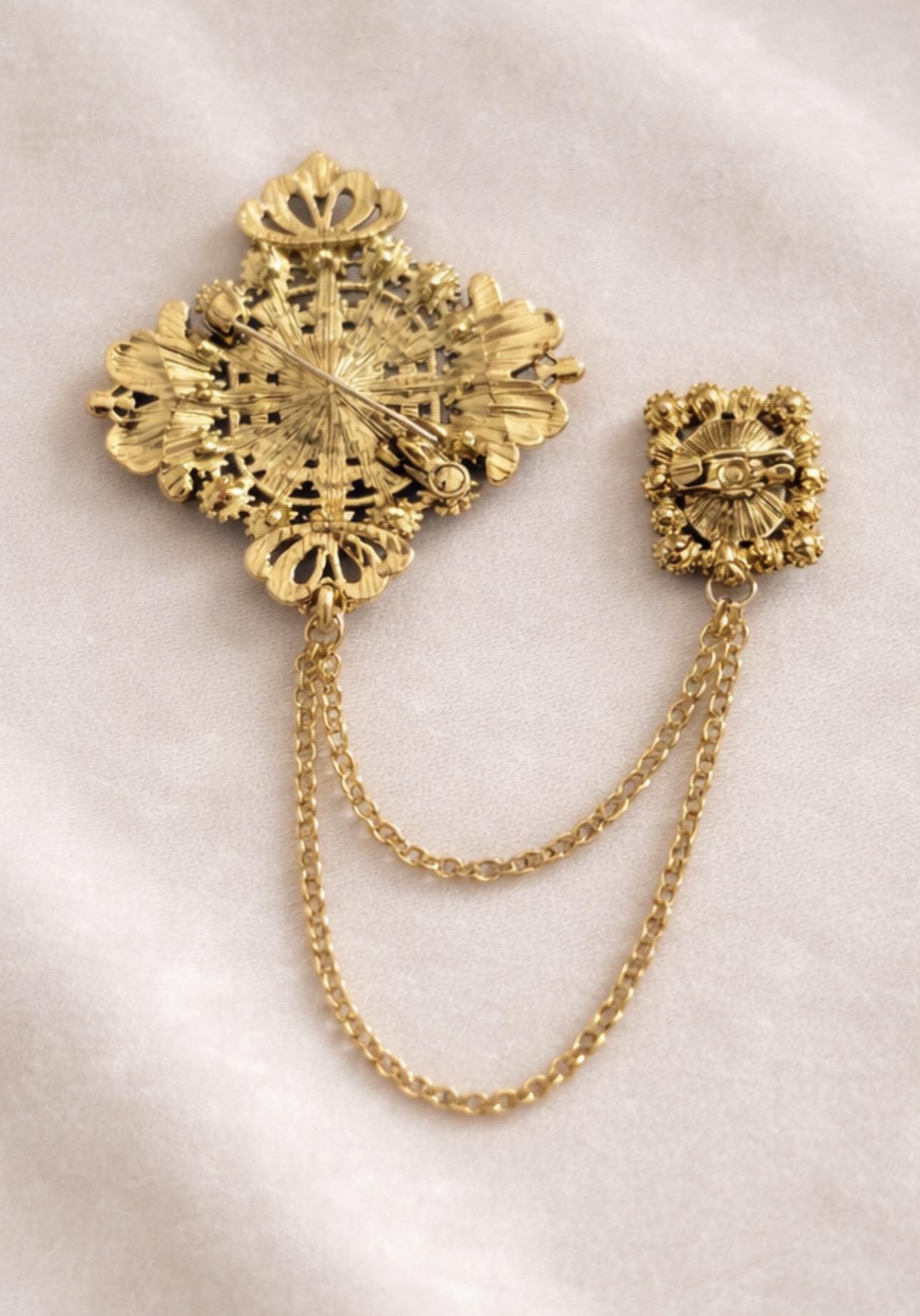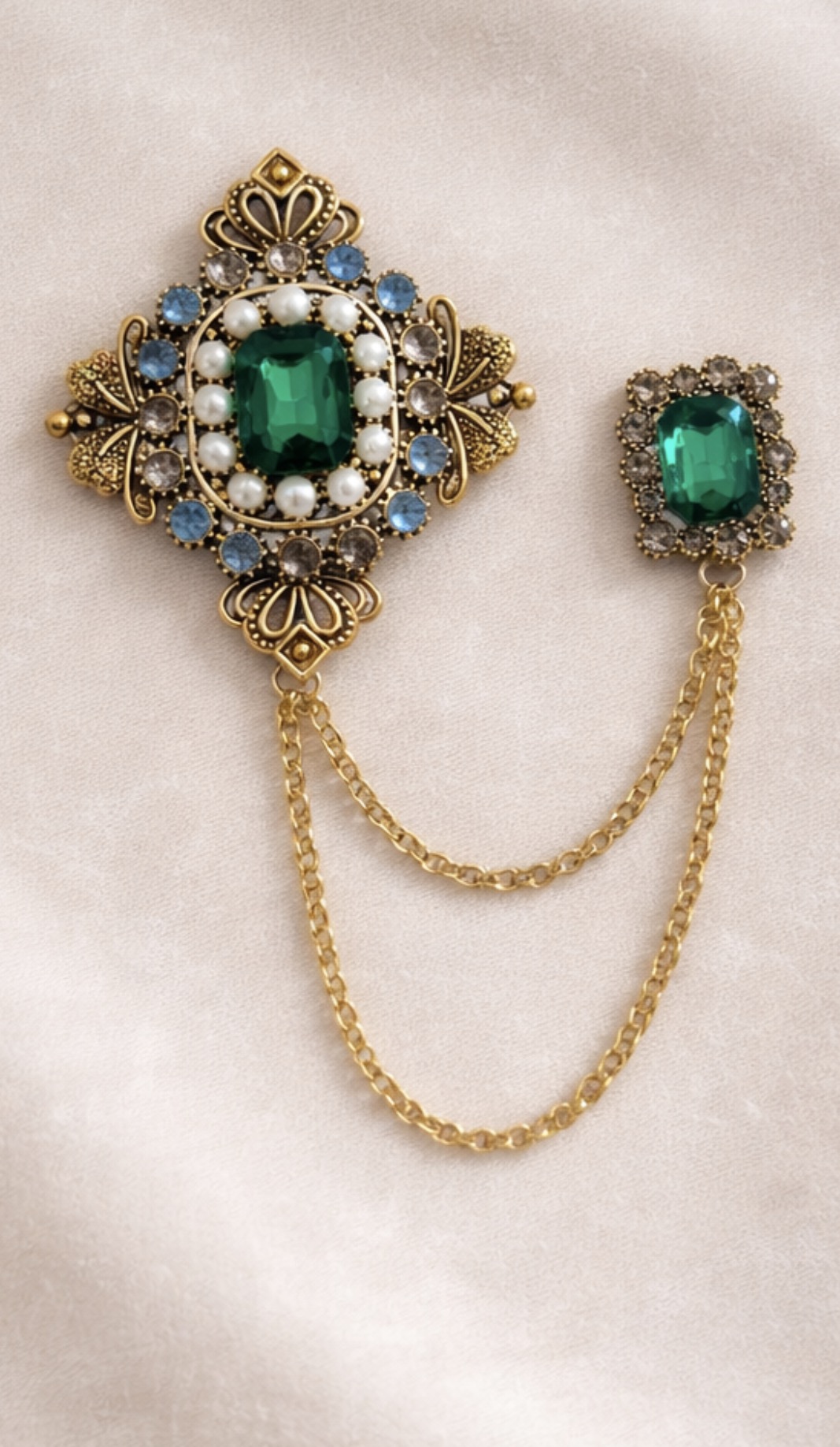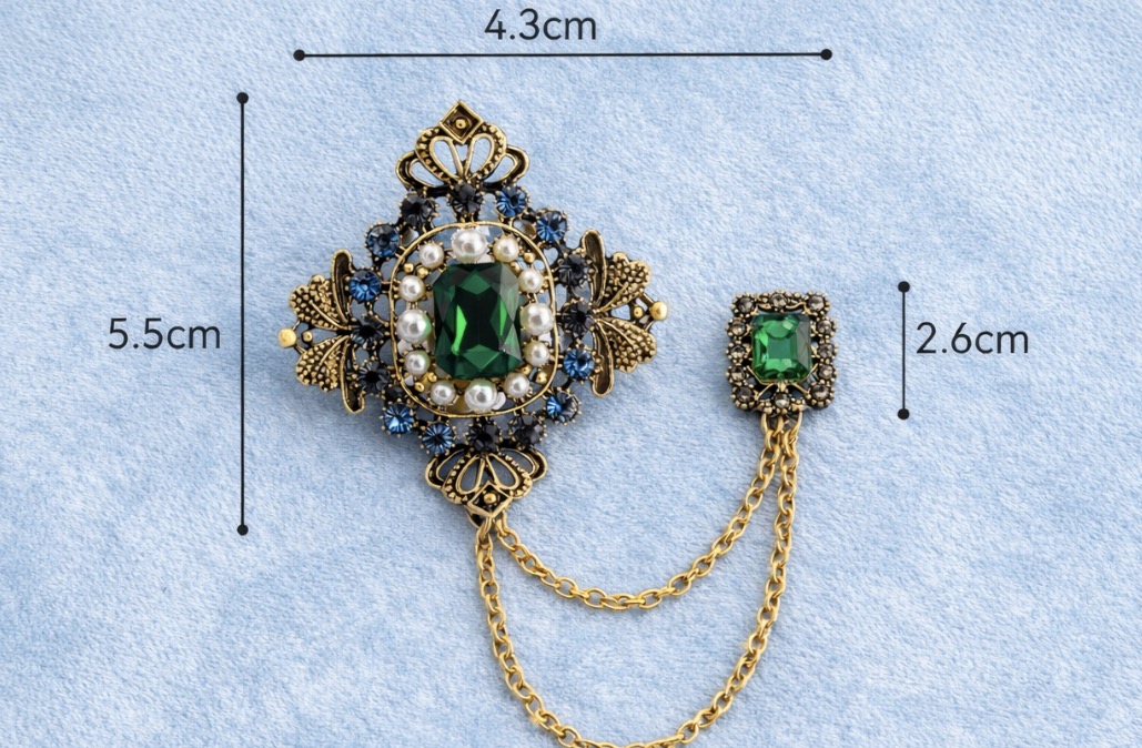 Ta podwójna broszka to biżuteria, która natychmiast nadaje stylizacji wyrazistości. Dwa dekoracyjne elementy połączone delikatnym łańcuszkiem tworzą harmonijną kompozycję inspirowaną estetyką vintage. To detal, który potrafi zmienić klasyczną marynarkę, koszulę czy płaszcz w świadomie dopracowany look z osobowością.