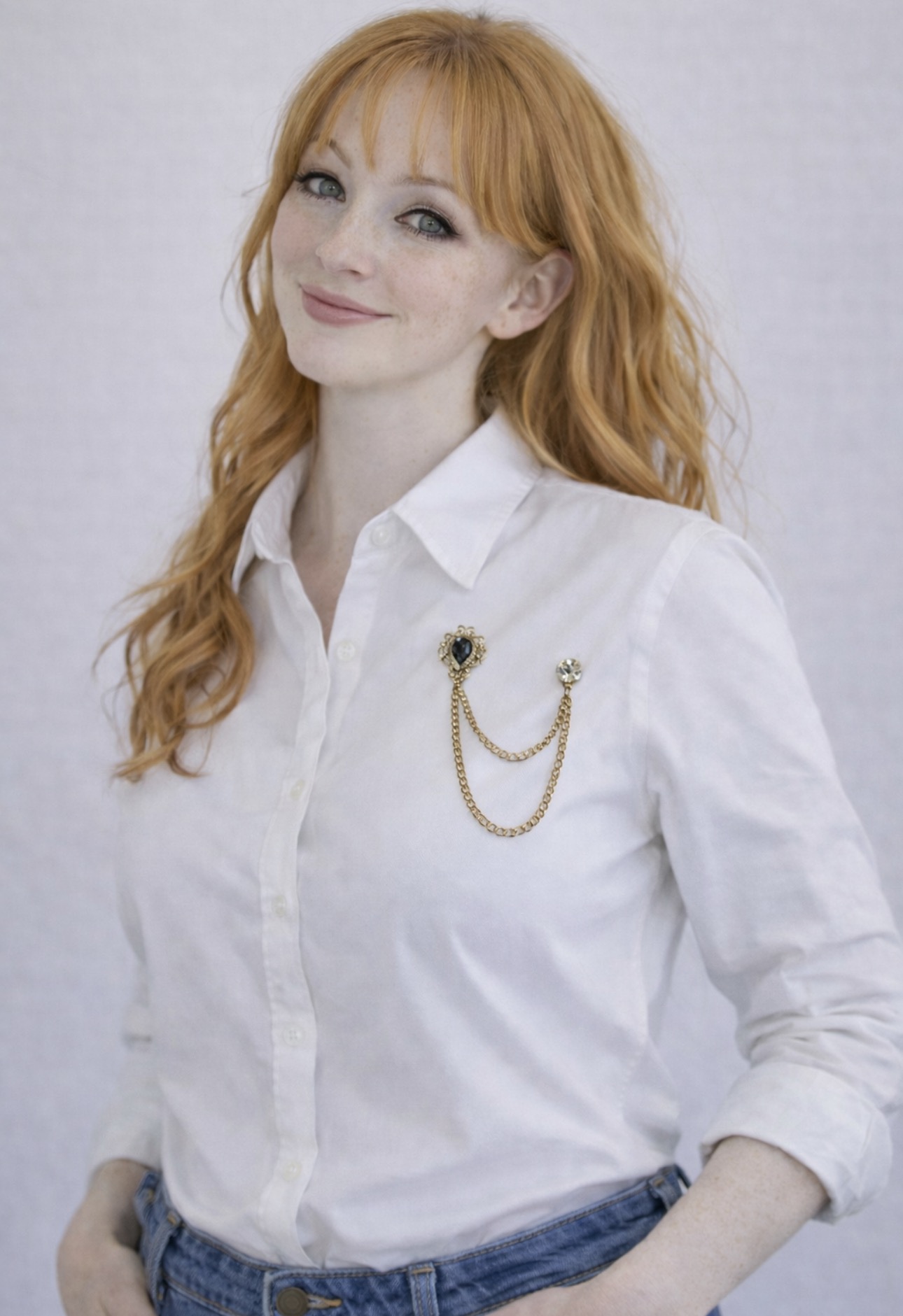 przypiętą do kołnierzyka koszuli — zamiast naszyjnika