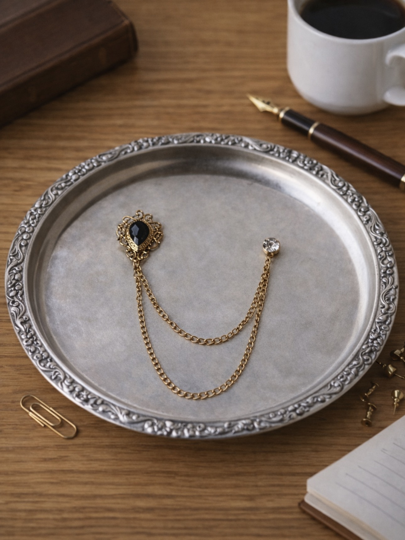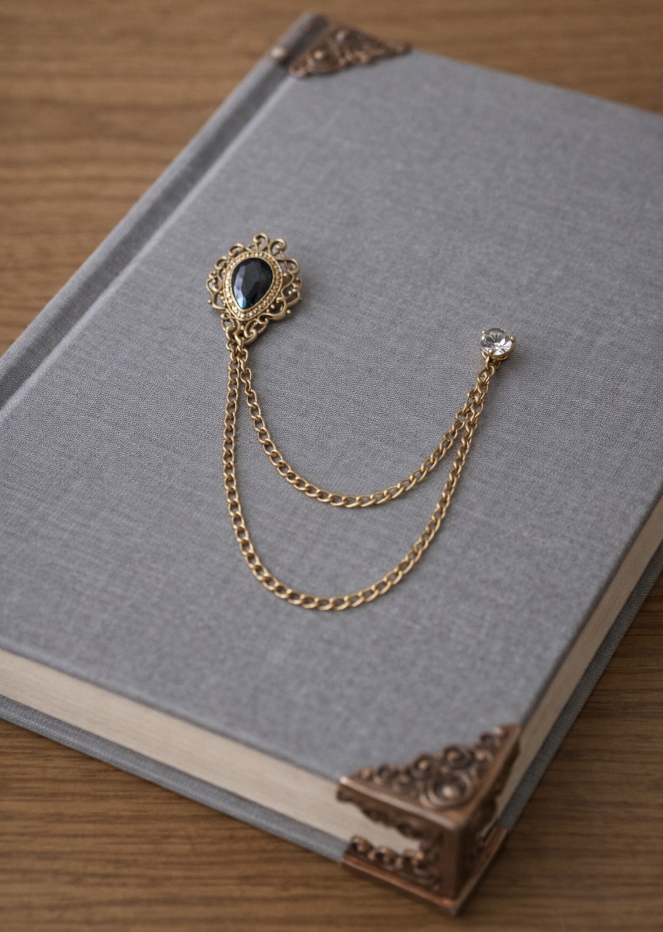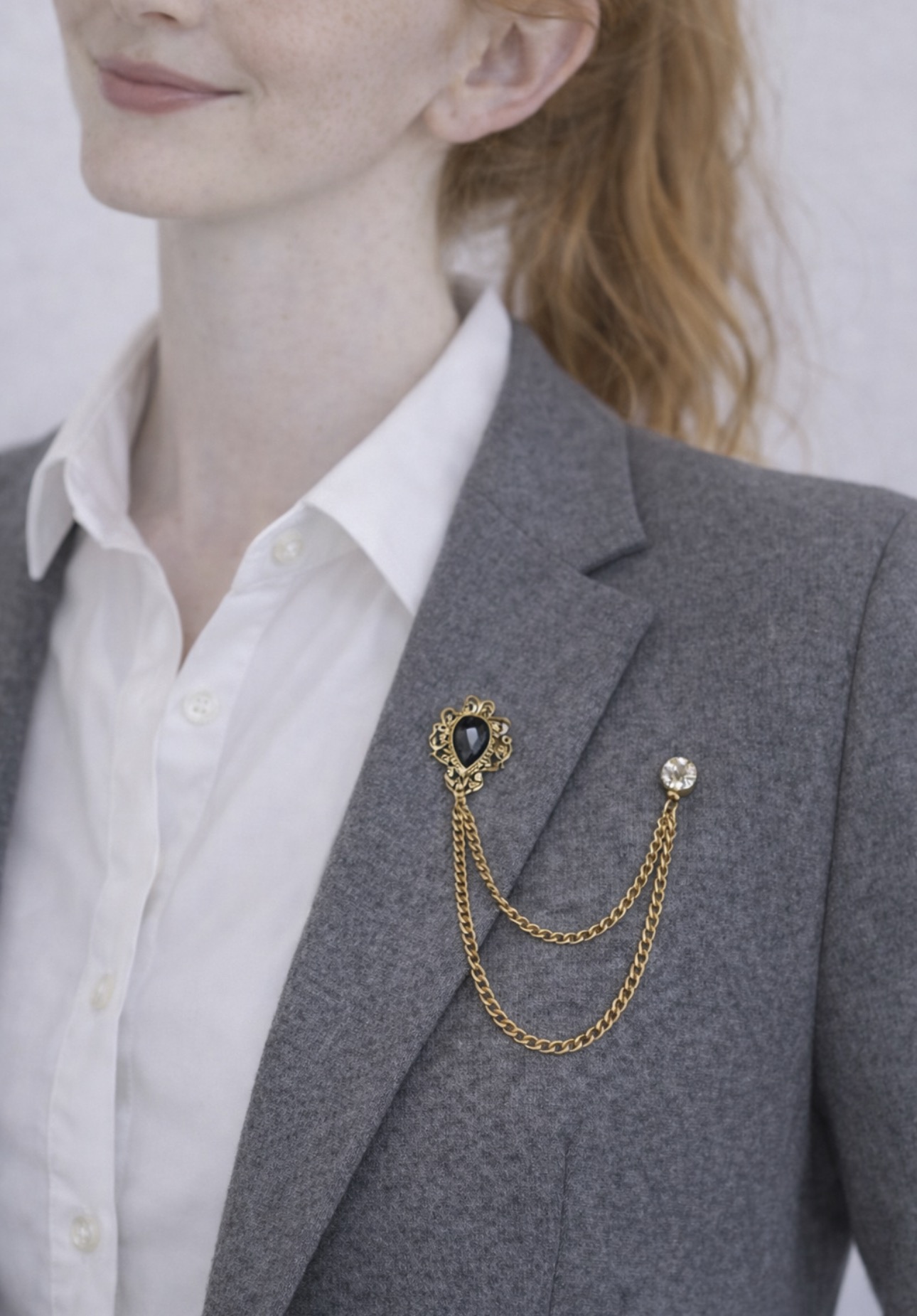 Ta podwójna broszka to delikatny, ale wyrazisty akcent, który dodaje stylizacji klasy i harmonii. Szary kamień osadzony w złotej oprawie w połączeniu z cienkim, podwójnym łańcuszkiem tworzy kompozycję inspirowaną ponadczasową elegancją. To detal, który podkreśla charakter marynarki, koszuli czy płaszcza — bez dominowania całości.