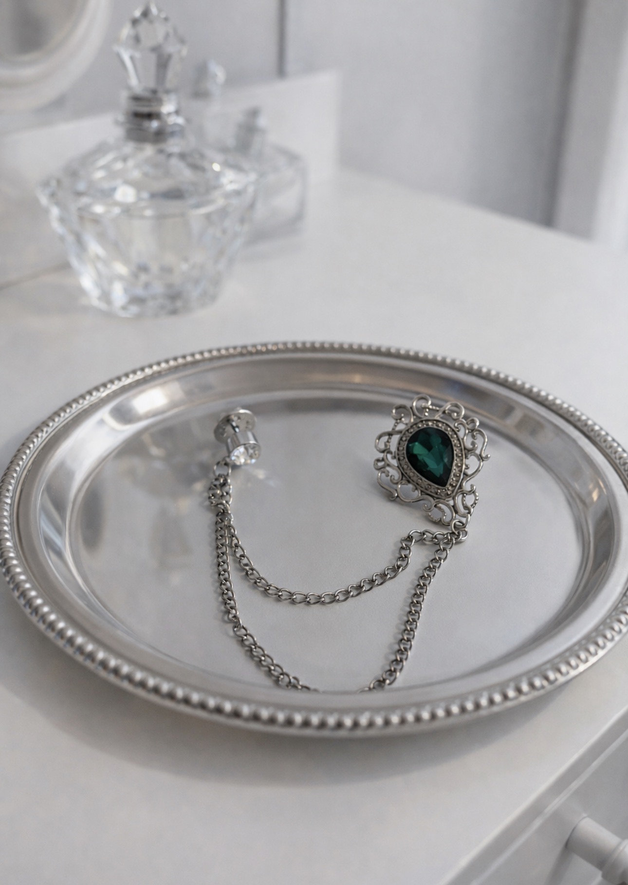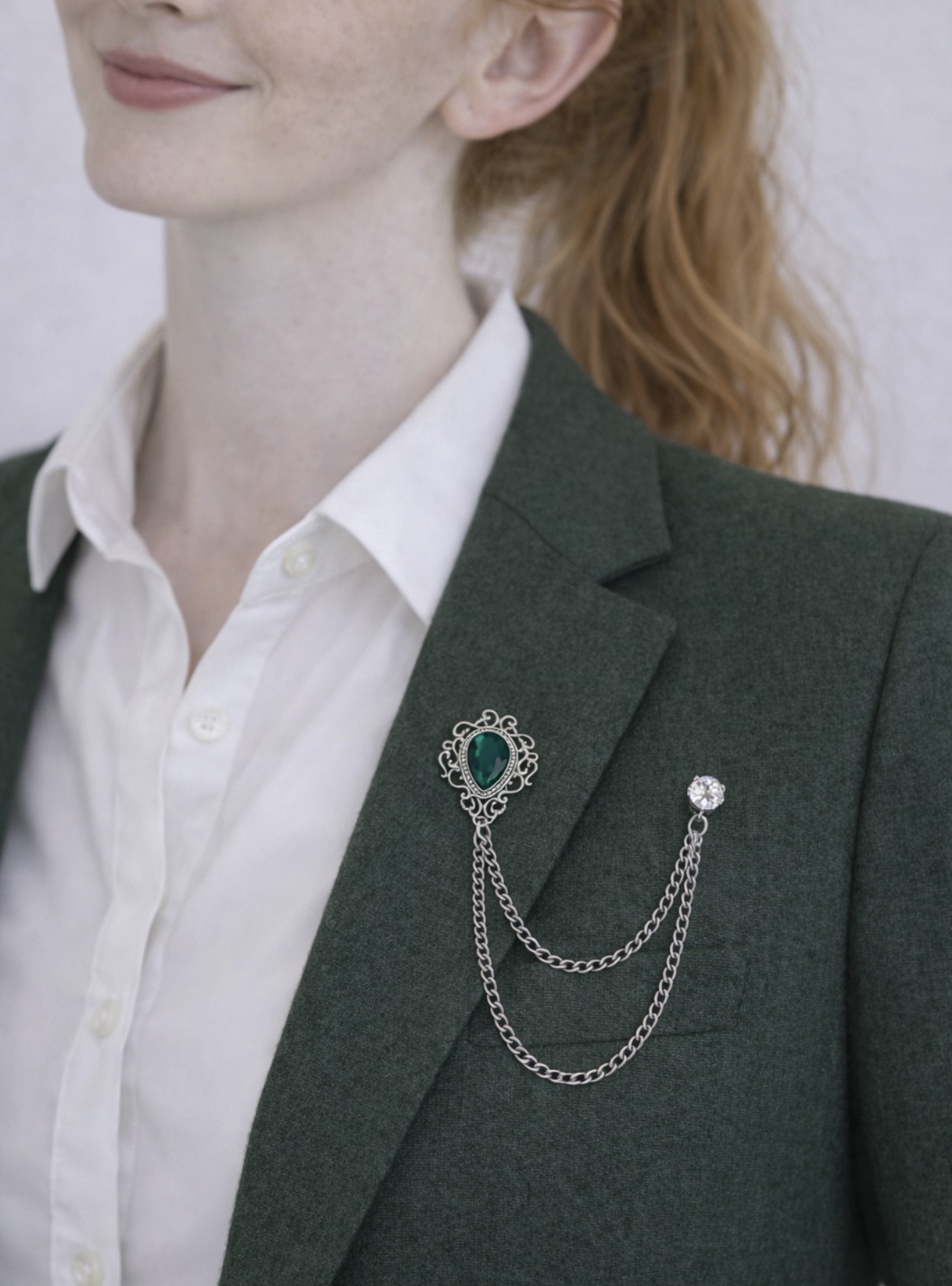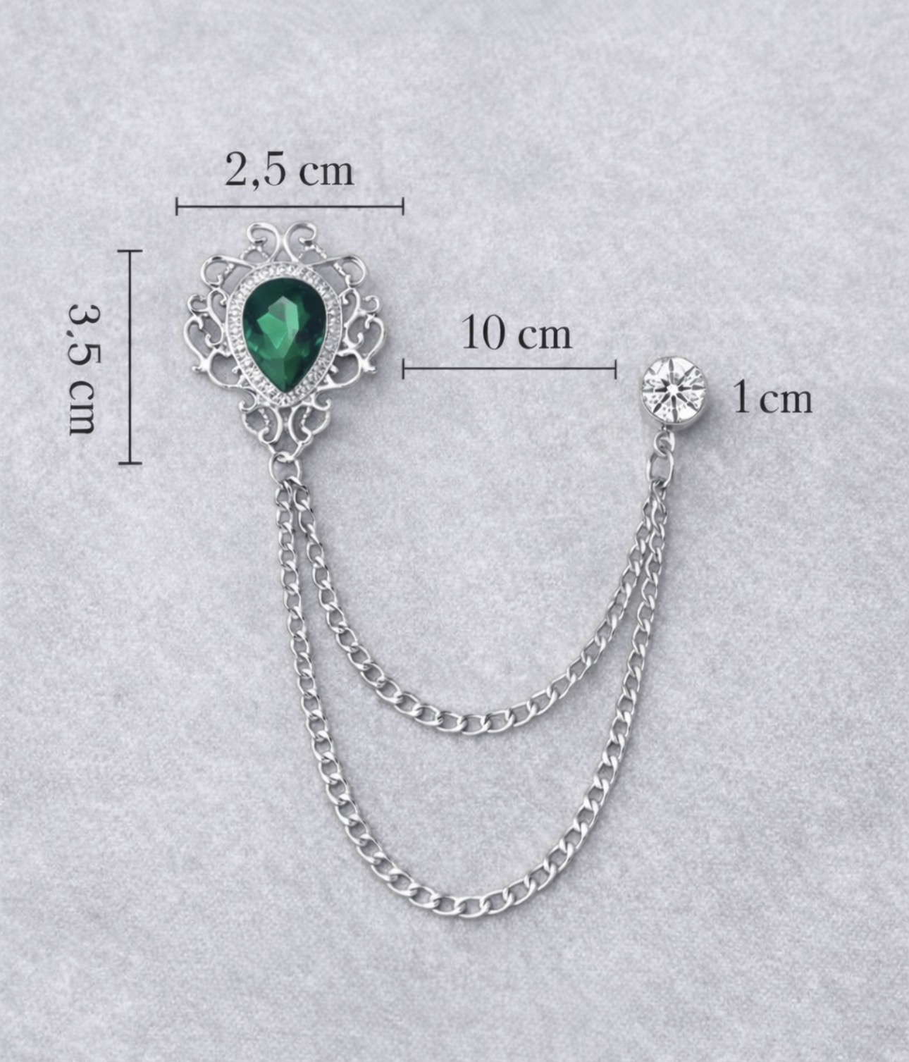 Ta podwójna broszka to subtelny, ale wyrazisty akcent, który nadaje stylizacji świeżości i lekkości. Zielone szkło osadzone w oprawie w kolorze srebrnym w połączeniu z delikatnym, podwójnym łańcuszkiem tworzy harmonijną kompozycję inspirowaną klasyczną elegancją z nowoczesnym twistem.