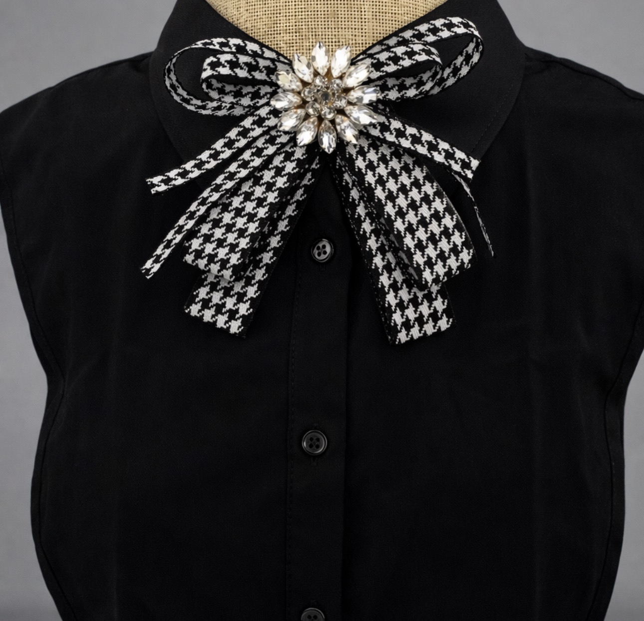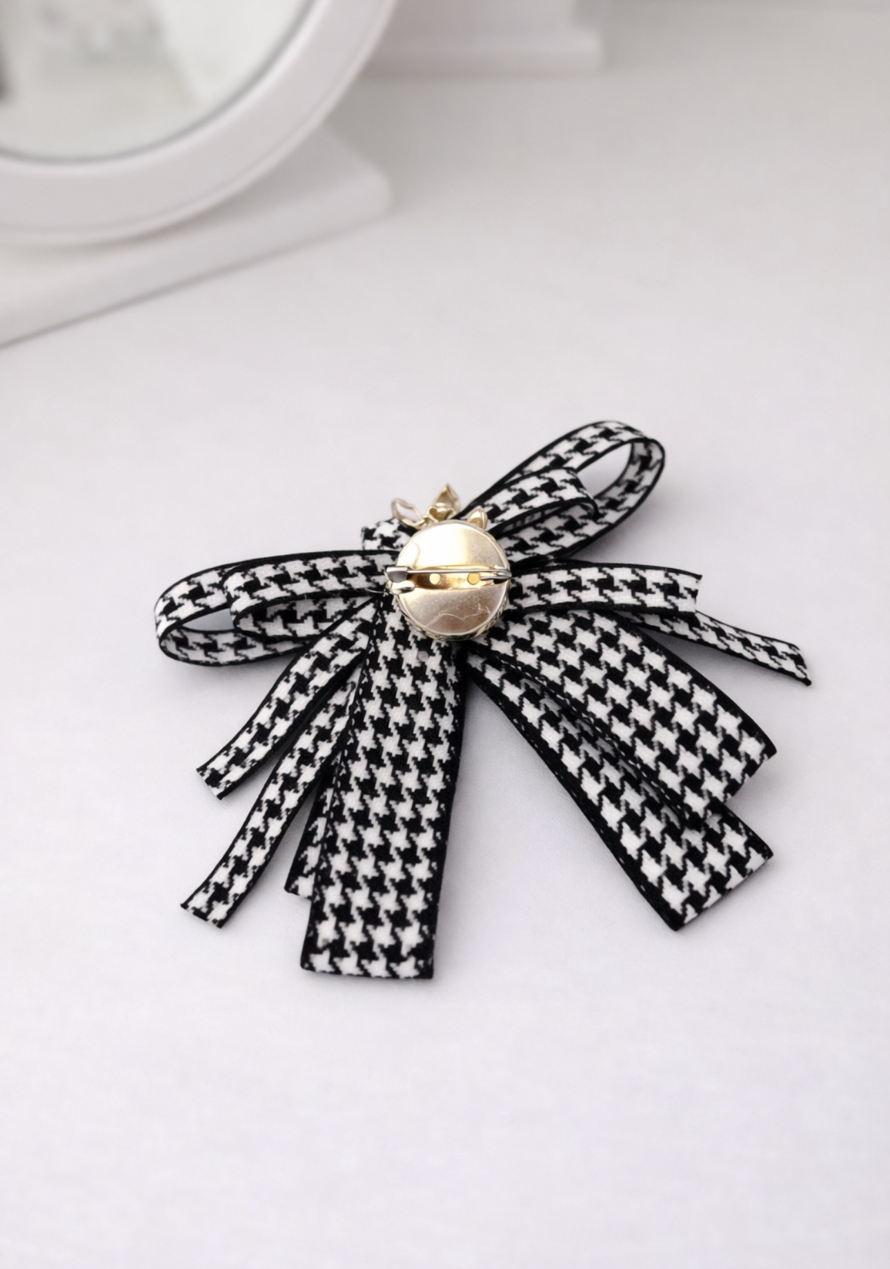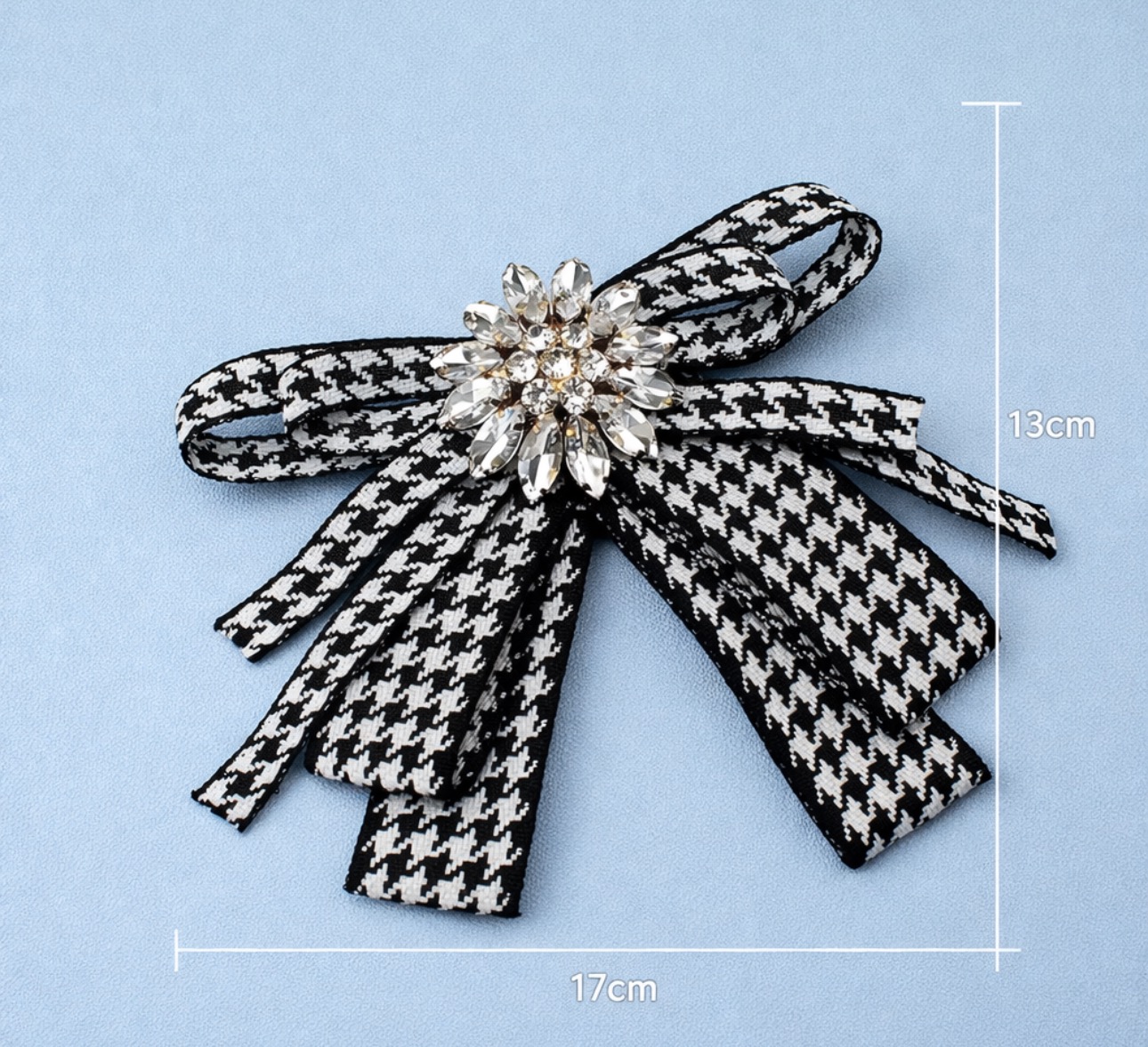 Ta ozdobna broszka – kokarda w pepitkę to połączenie ponadczasowej elegancji z modowym charakterem. Klasyczny czarno-biały wzór nadaje jej szyku, a centralna aplikacja z lśniących kryształków pięknie odbija światło, tworząc efekt luksusowej biżuterii.