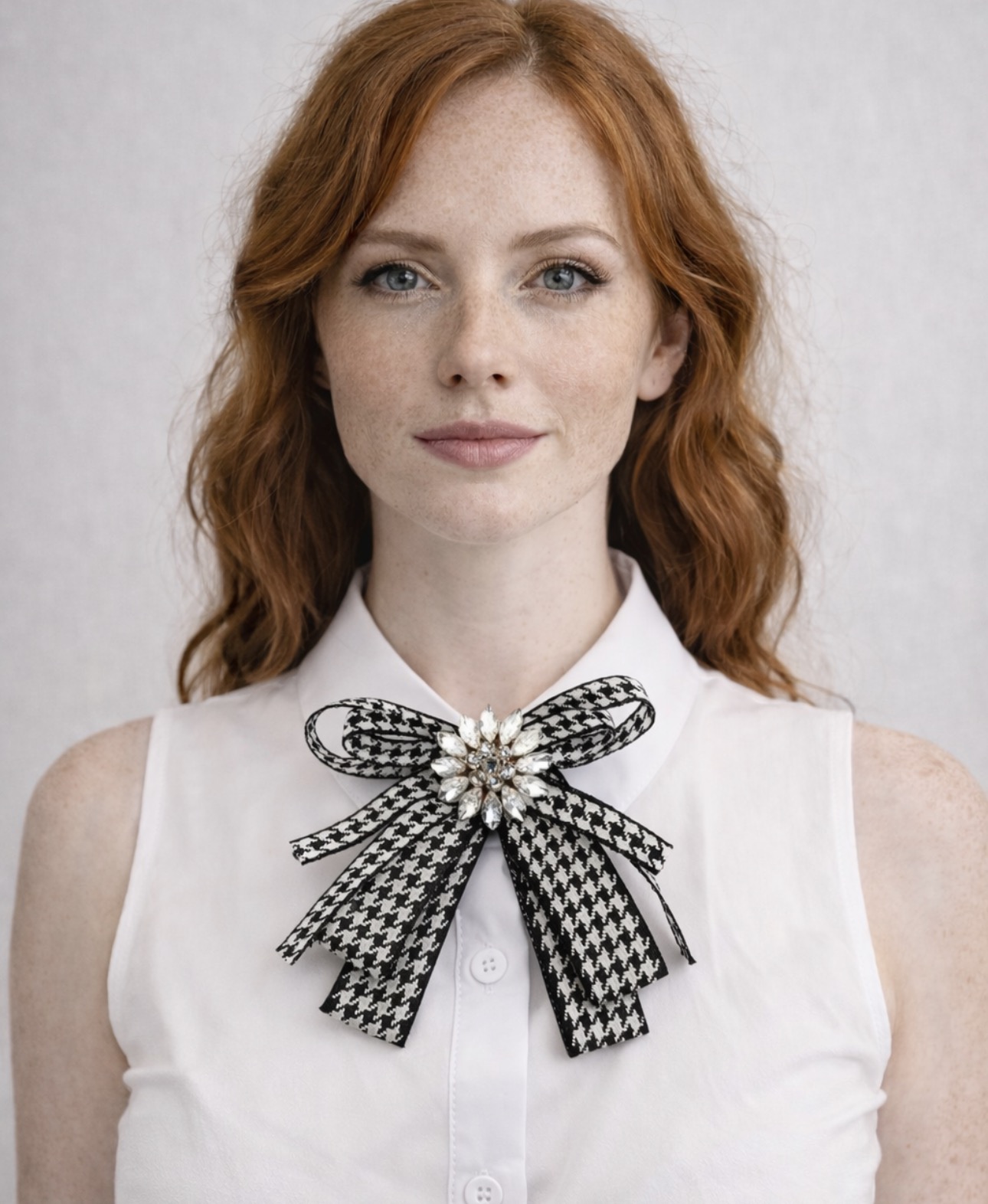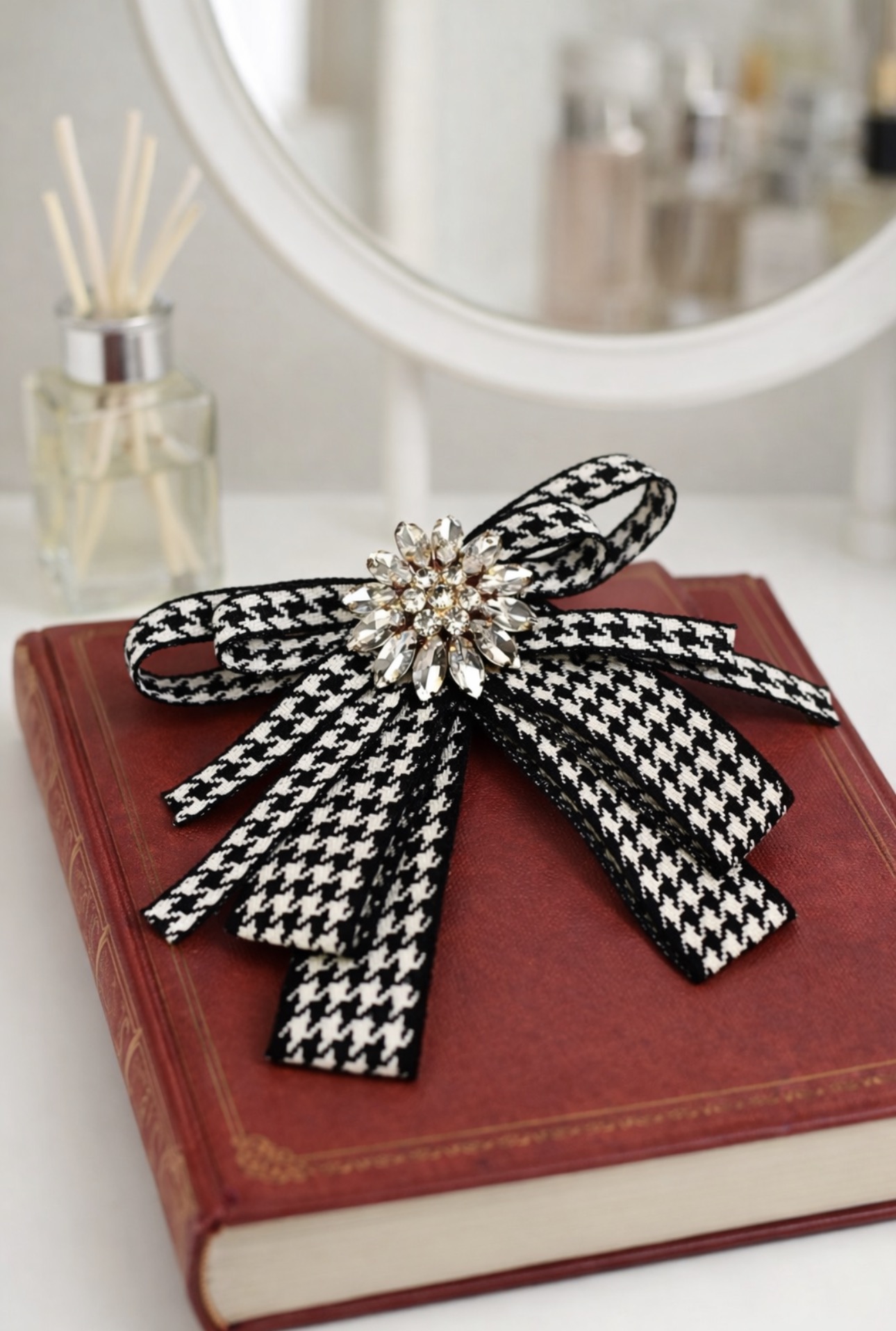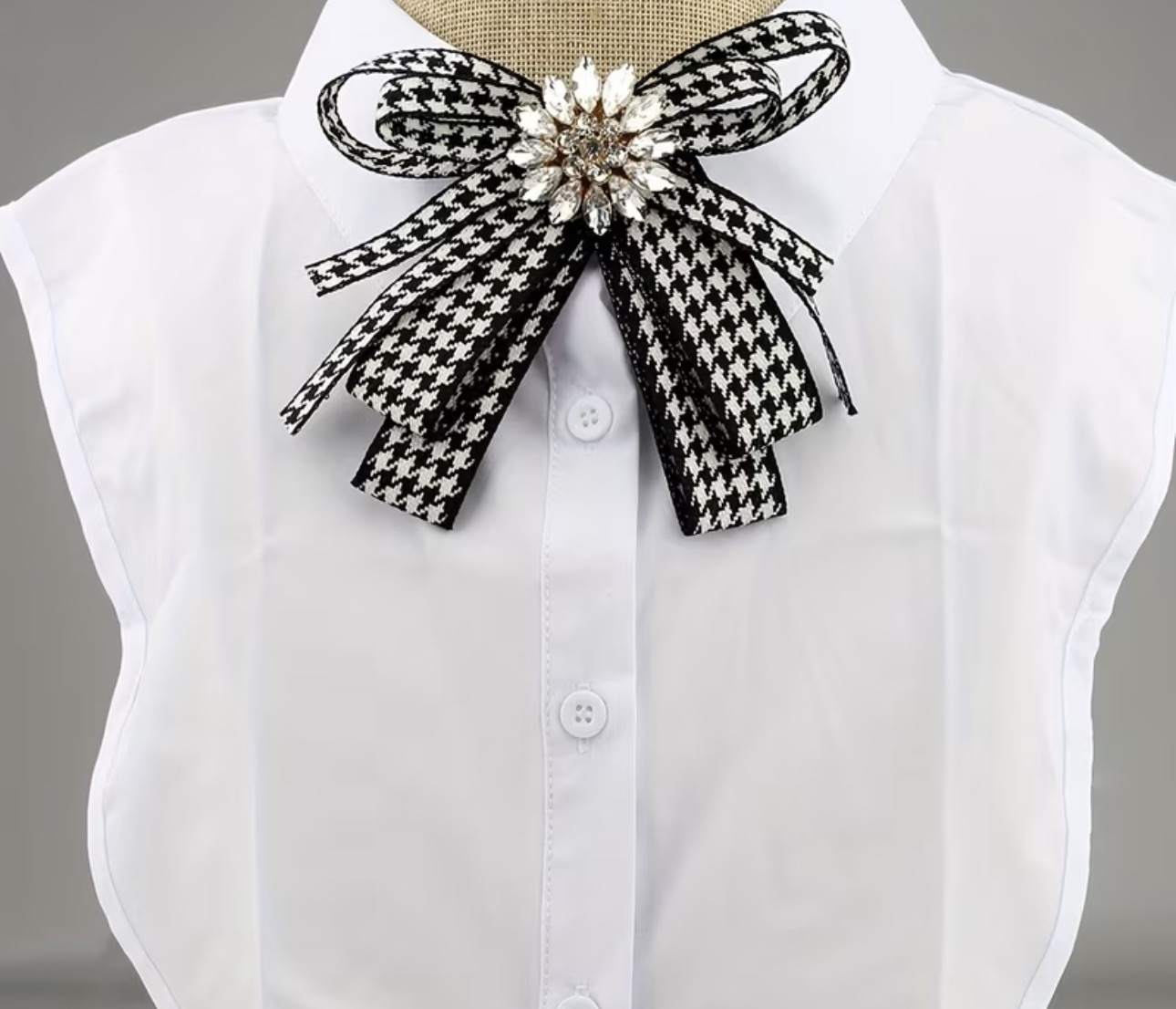 Ta ozdobna broszka – kokarda w pepitkę to połączenie ponadczasowej elegancji z modowym charakterem. Klasyczny czarno-biały wzór nadaje jej szyku, a centralna aplikacja z lśniących kryształków pięknie odbija światło, tworząc efekt luksusowej biżuterii.